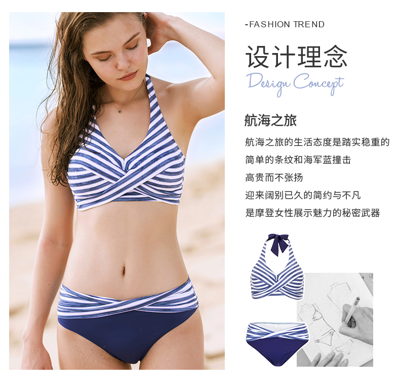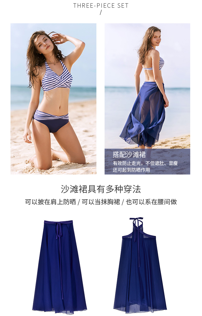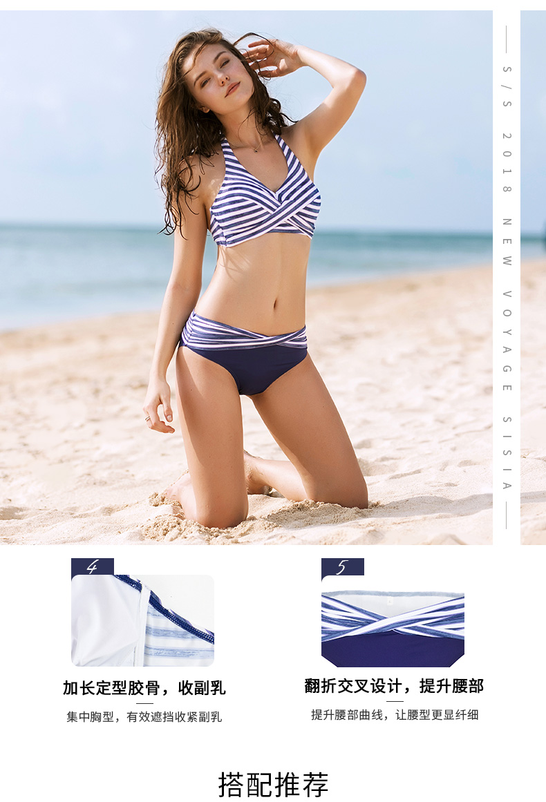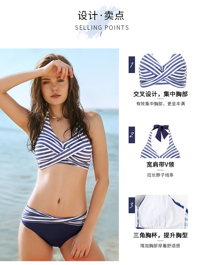 sisia新款性感大胸比基尼条纹海军风小胸聚拢出国游泳衣女三件套