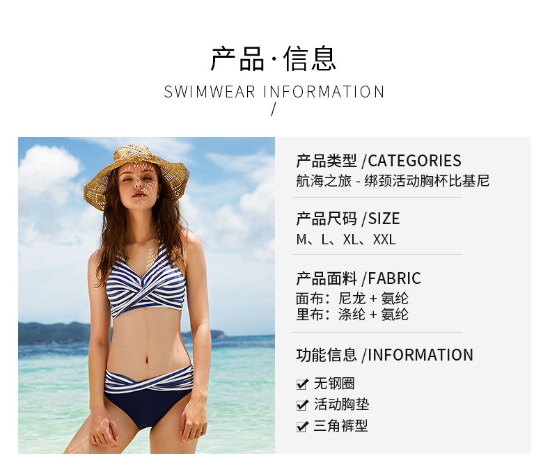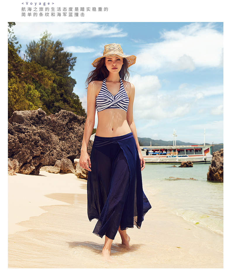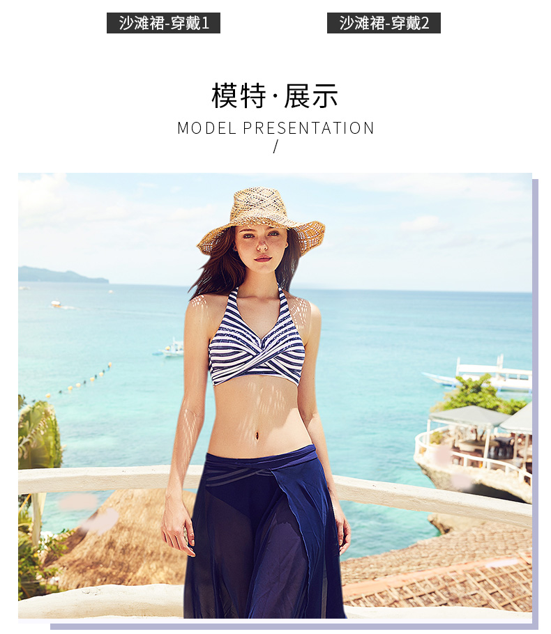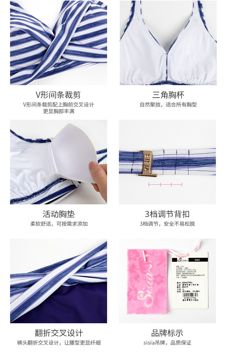 sisia新款性感大胸比基尼条纹海军风小胸聚拢出国游泳衣女三件套
