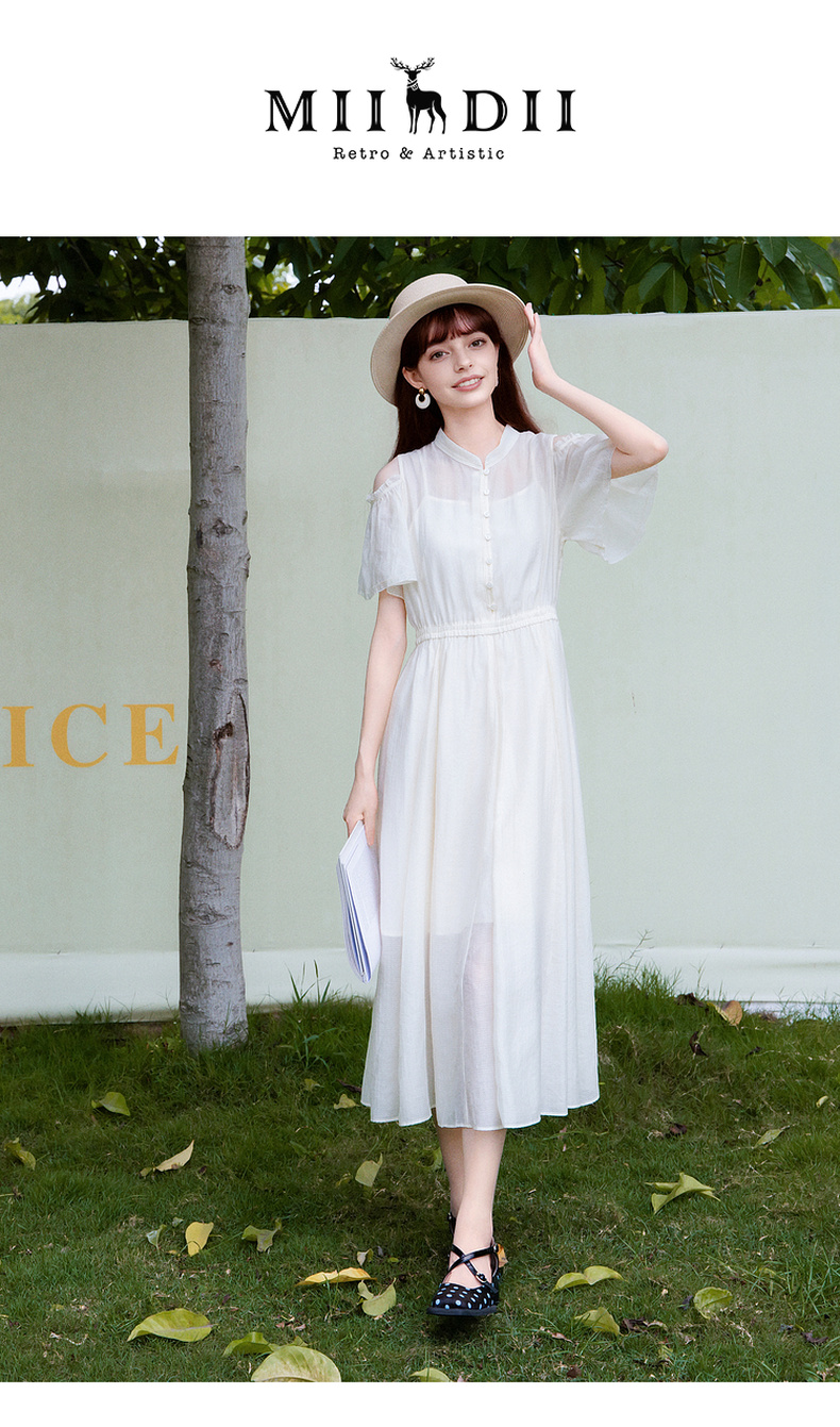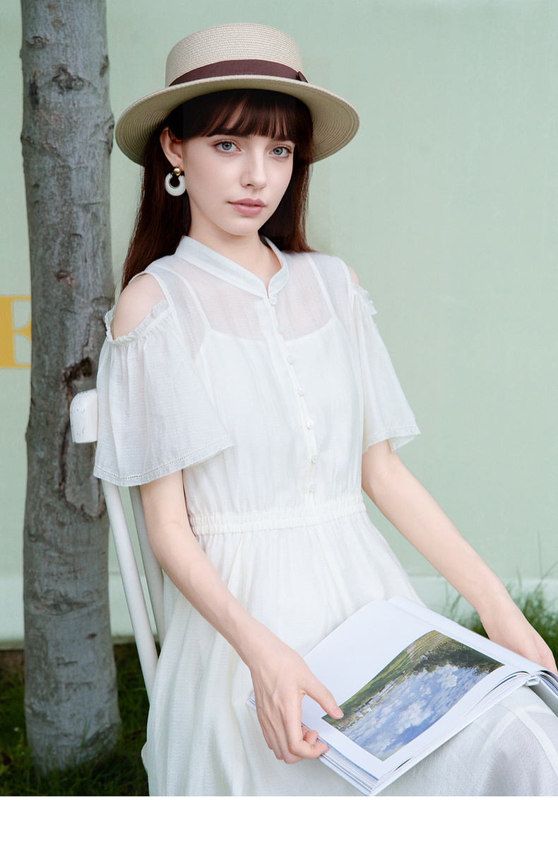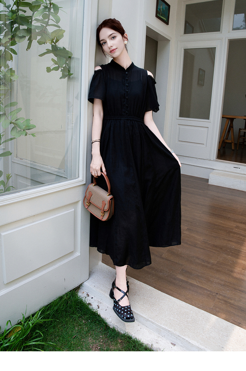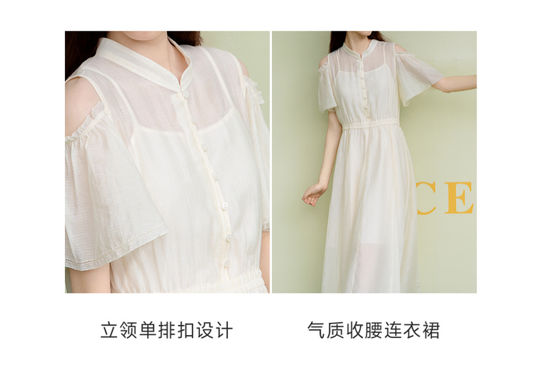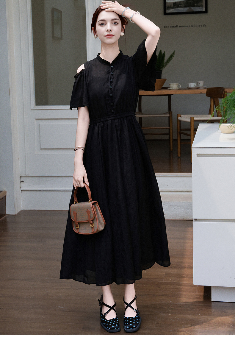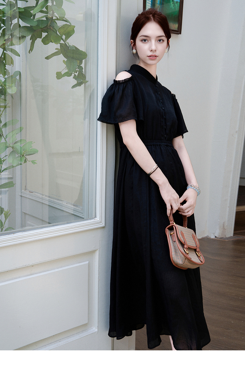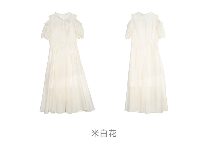 谜底露肩连衣裙短袖2025夏新款甜美清新出游长裙大摆裙256ML6268