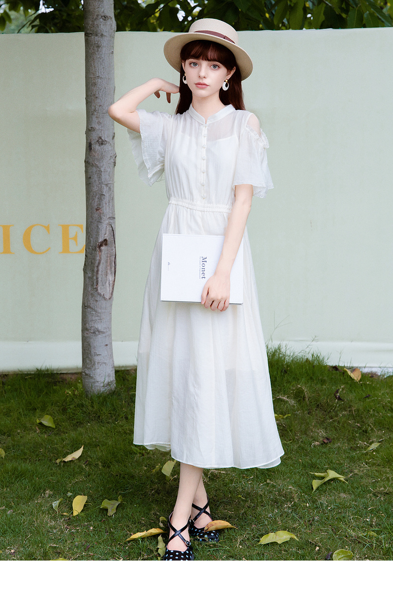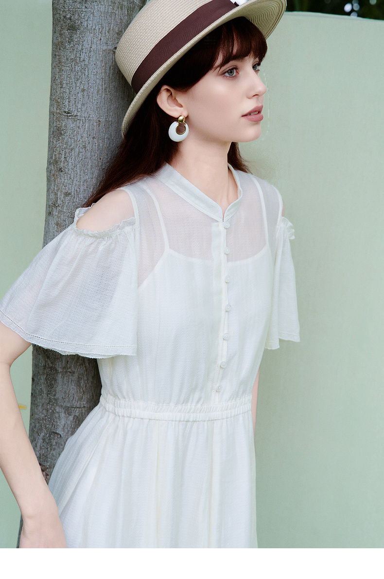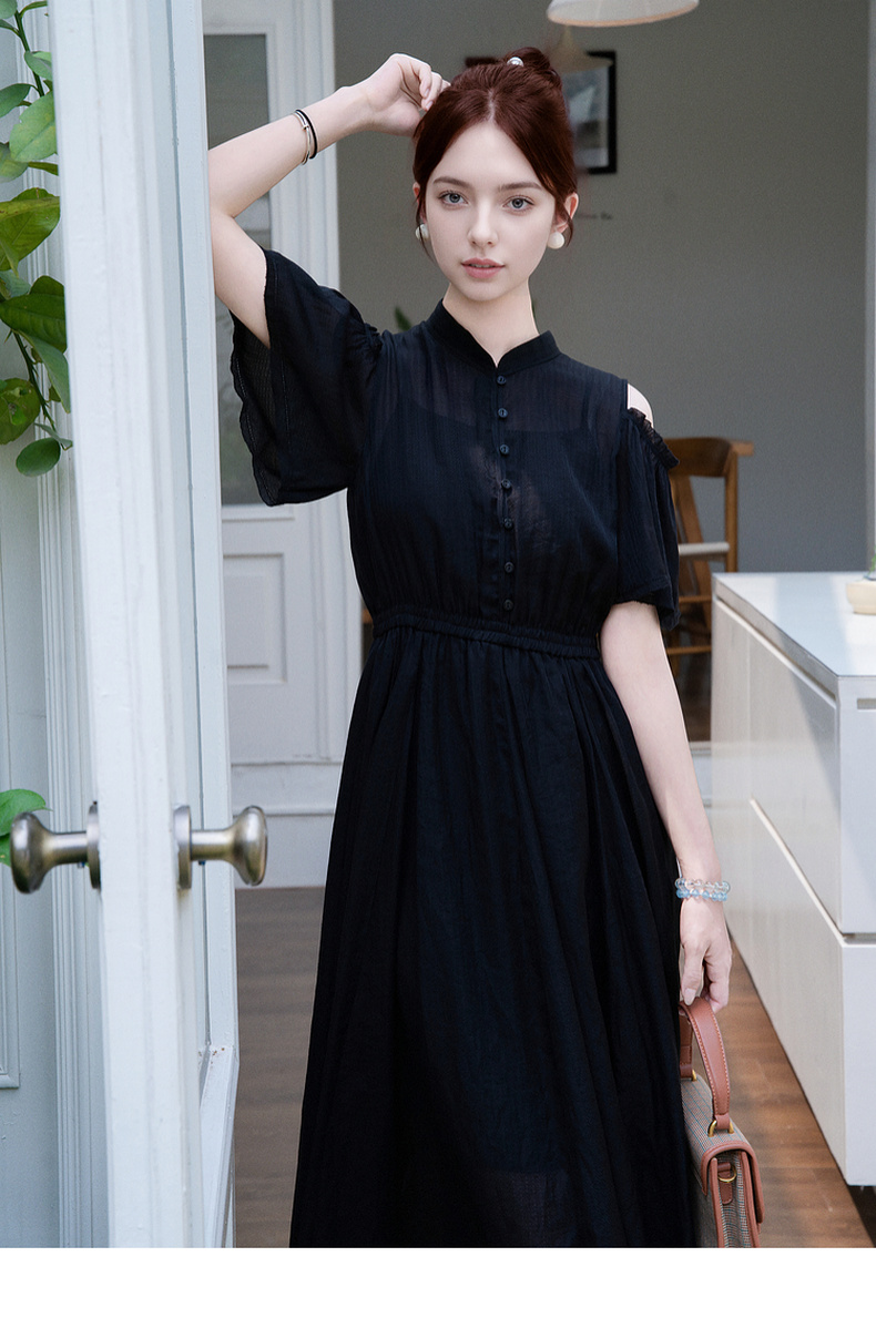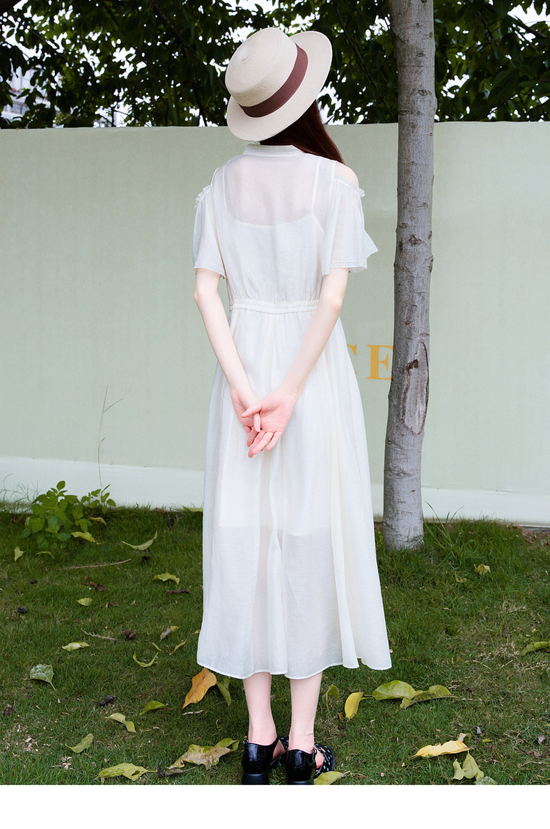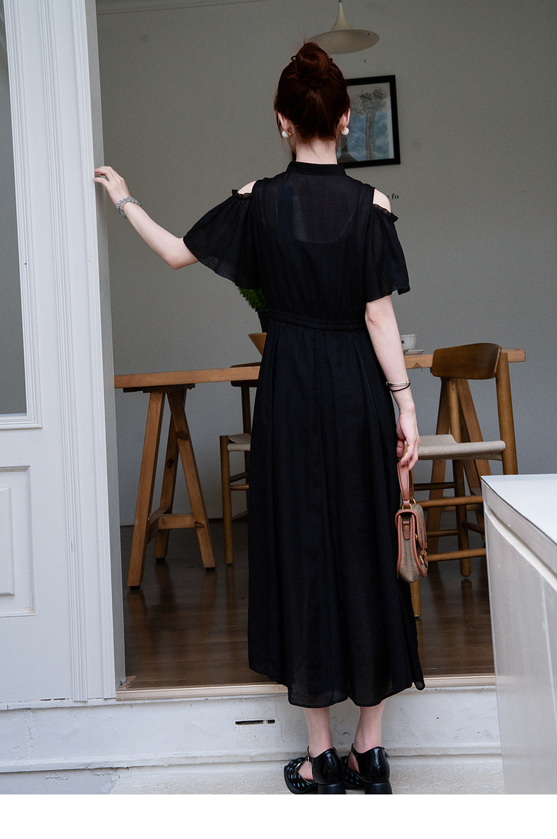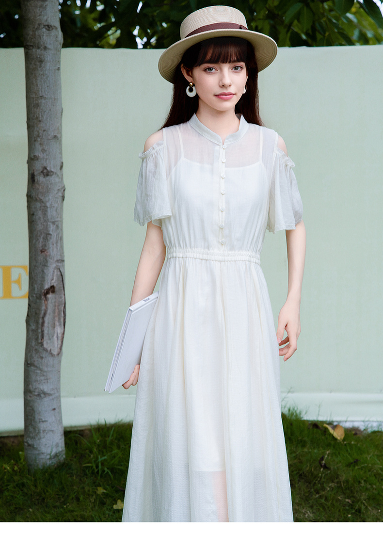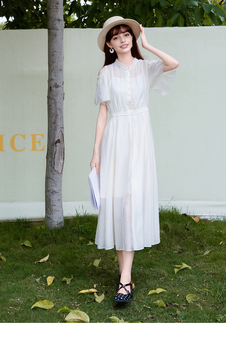 谜底露肩连衣裙短袖2025夏新款甜美清新出游长裙大摆裙256ML6268