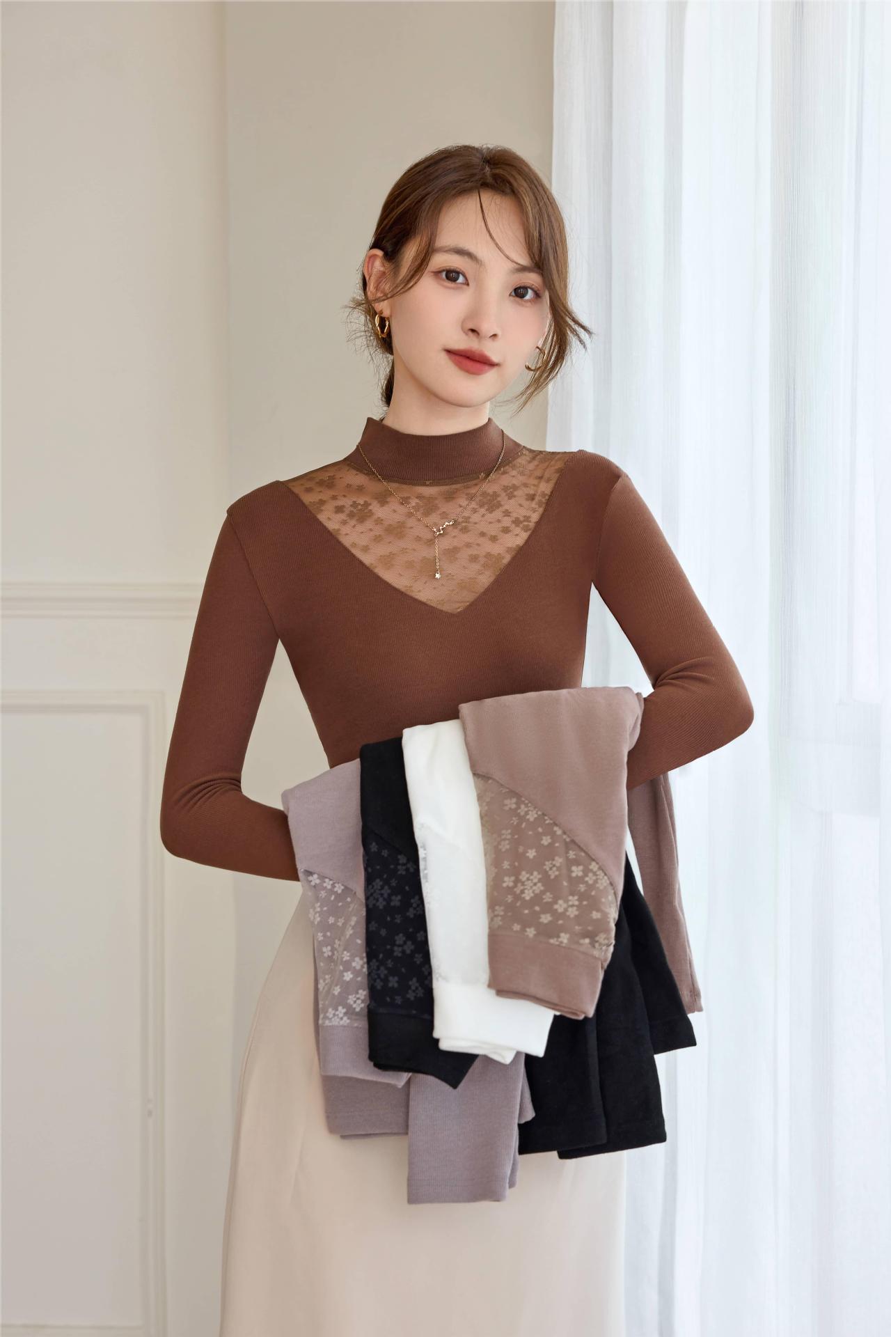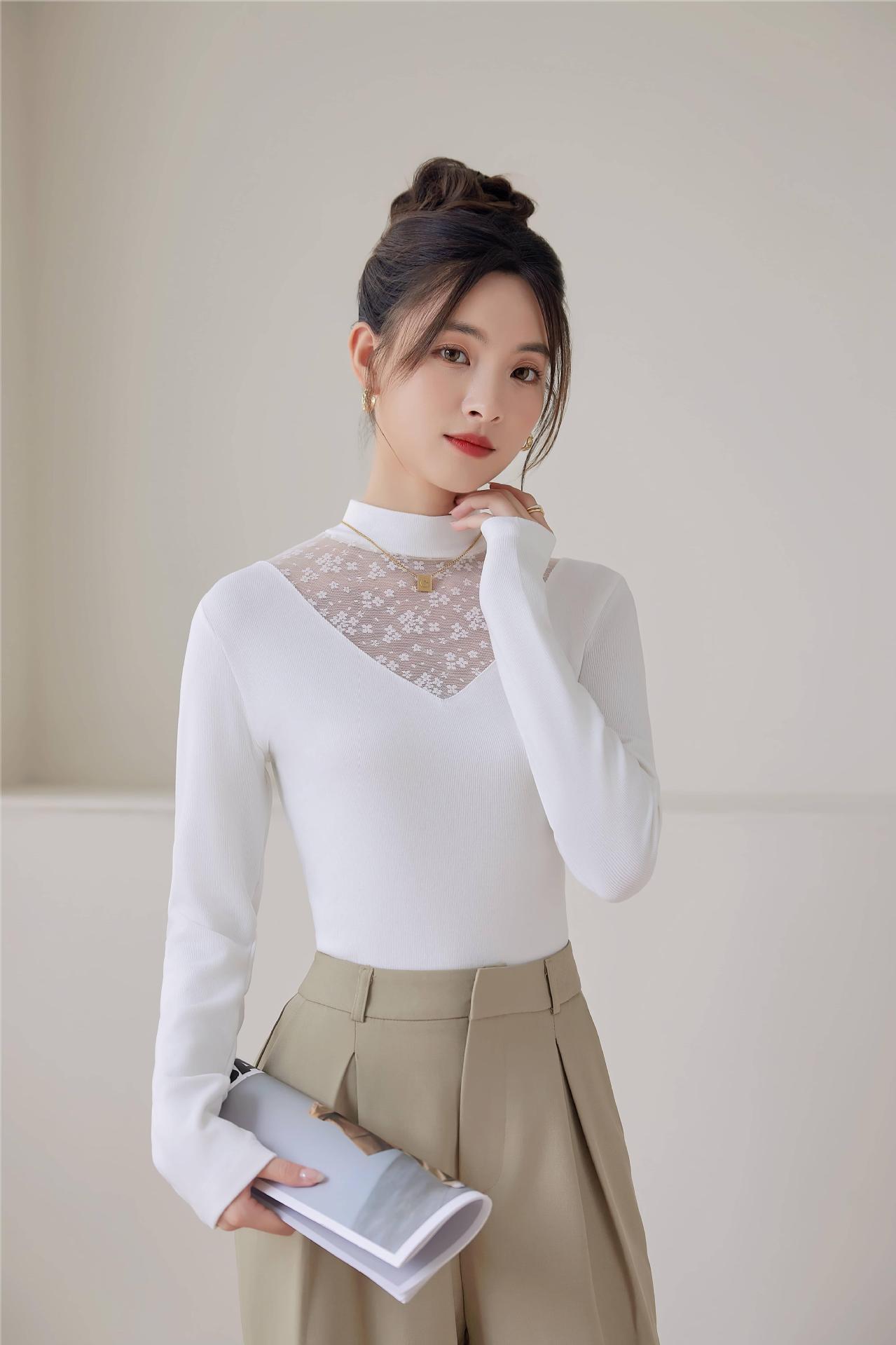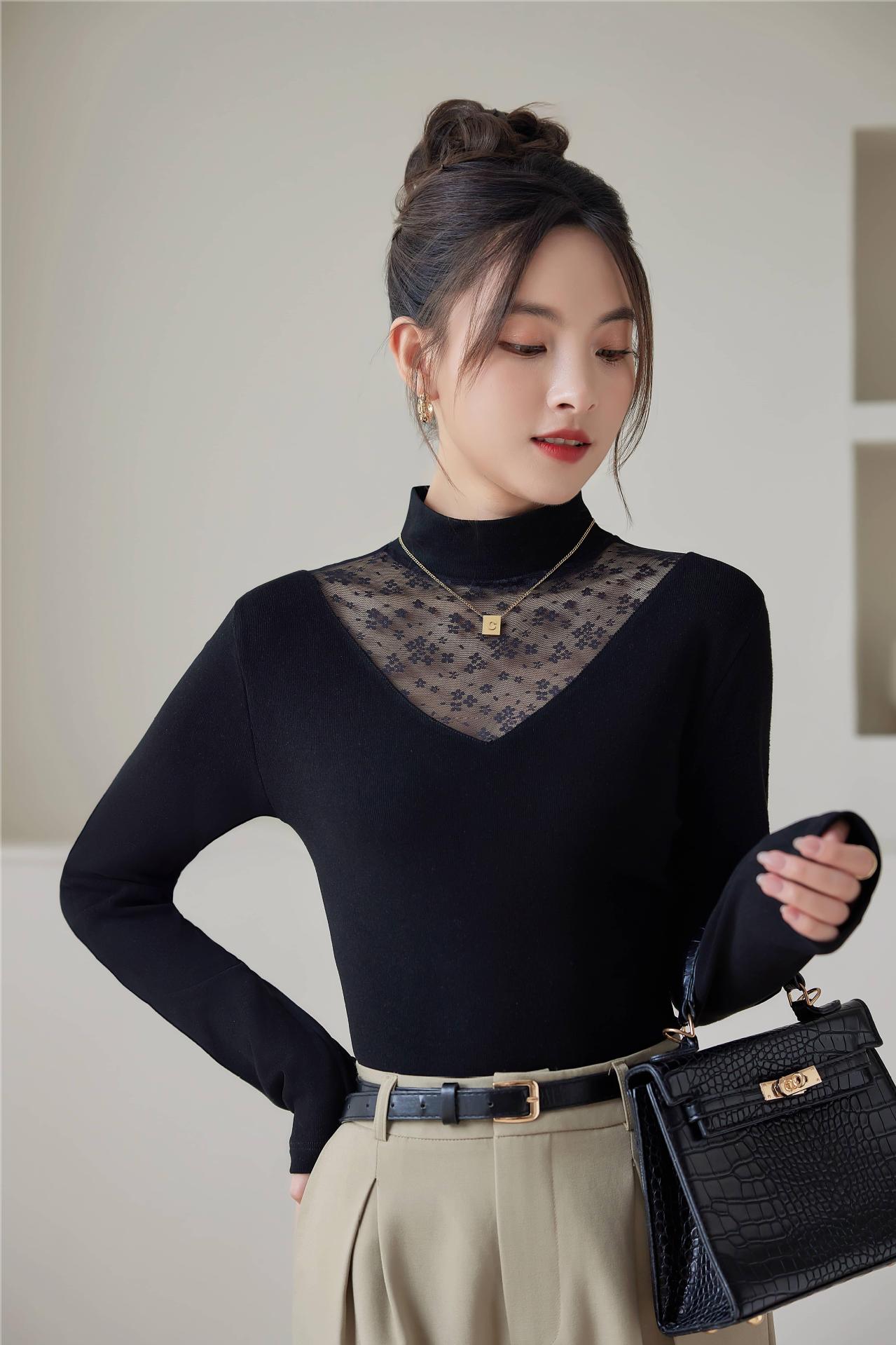 2024春季新款网纱打底衫女士亮丝内搭半高领镂空蕾丝小衫上衣