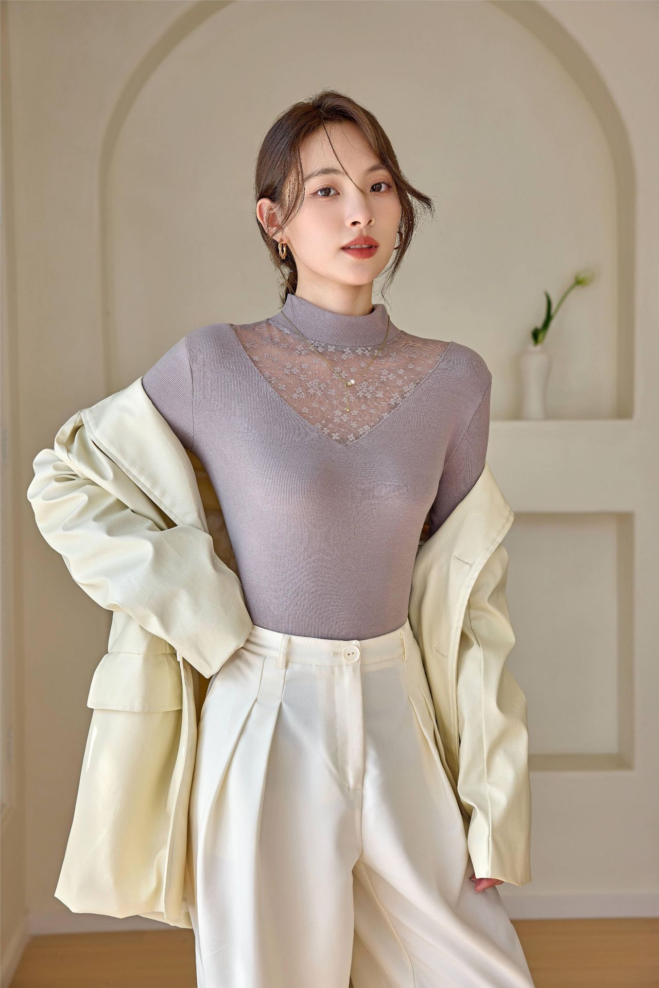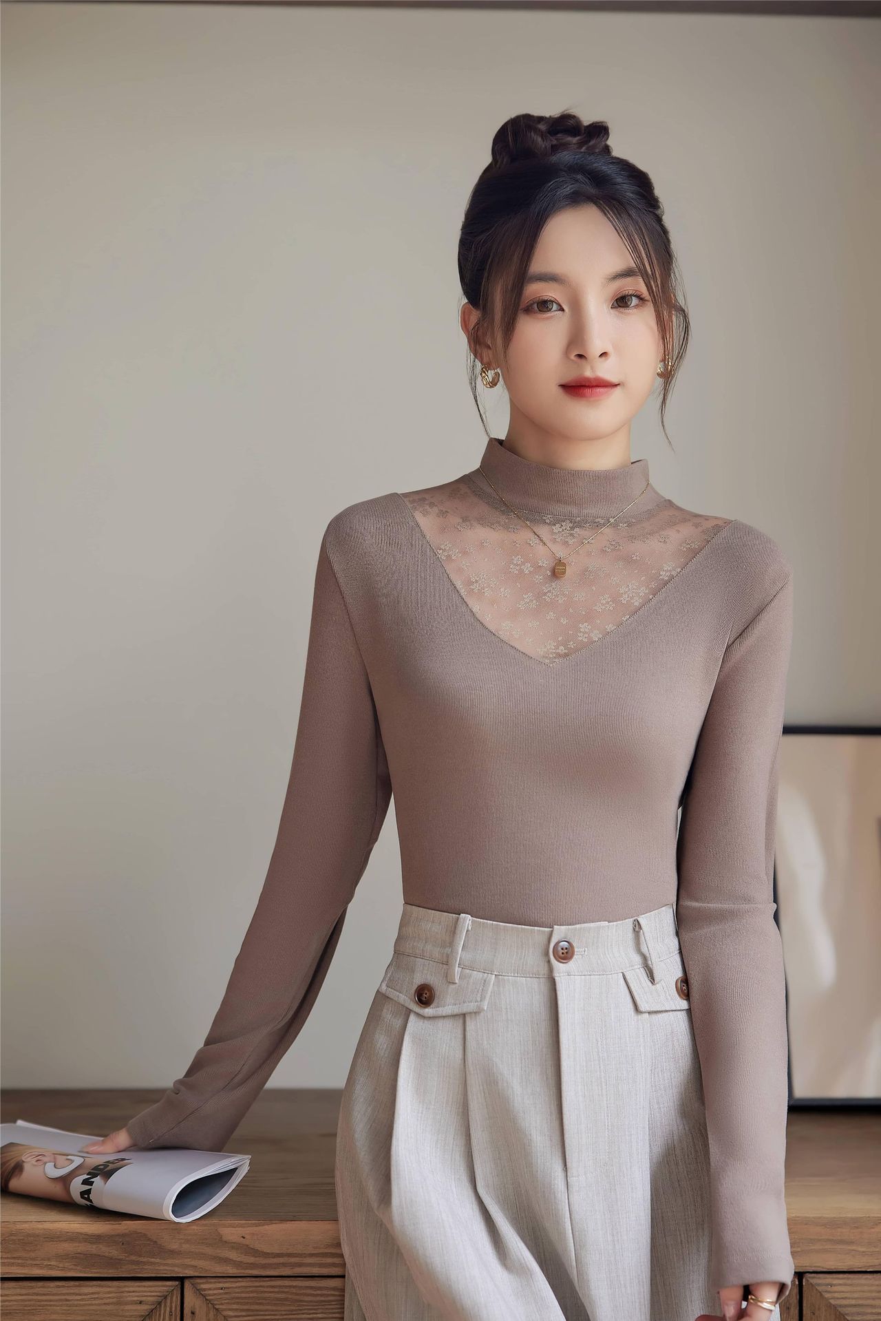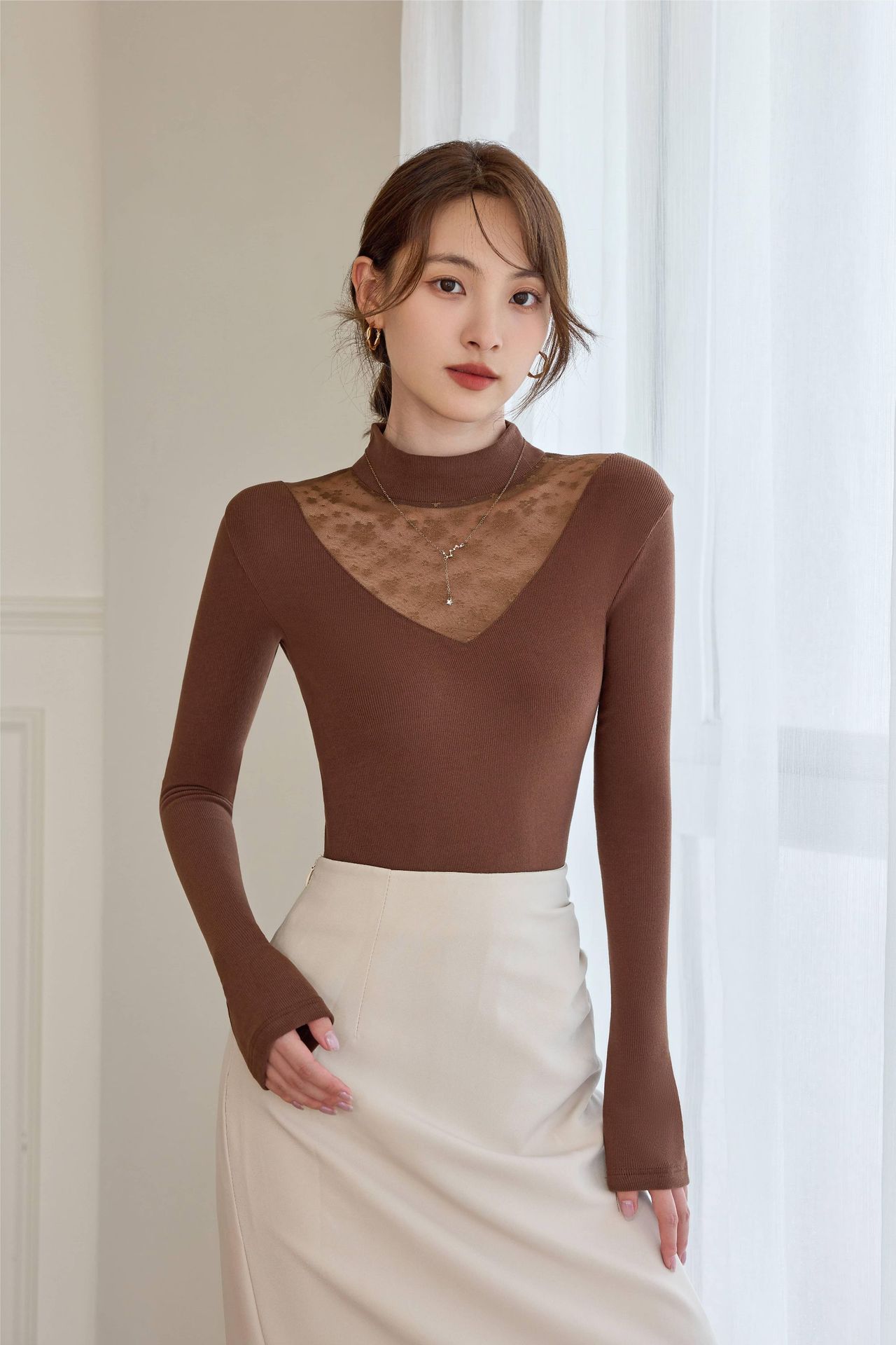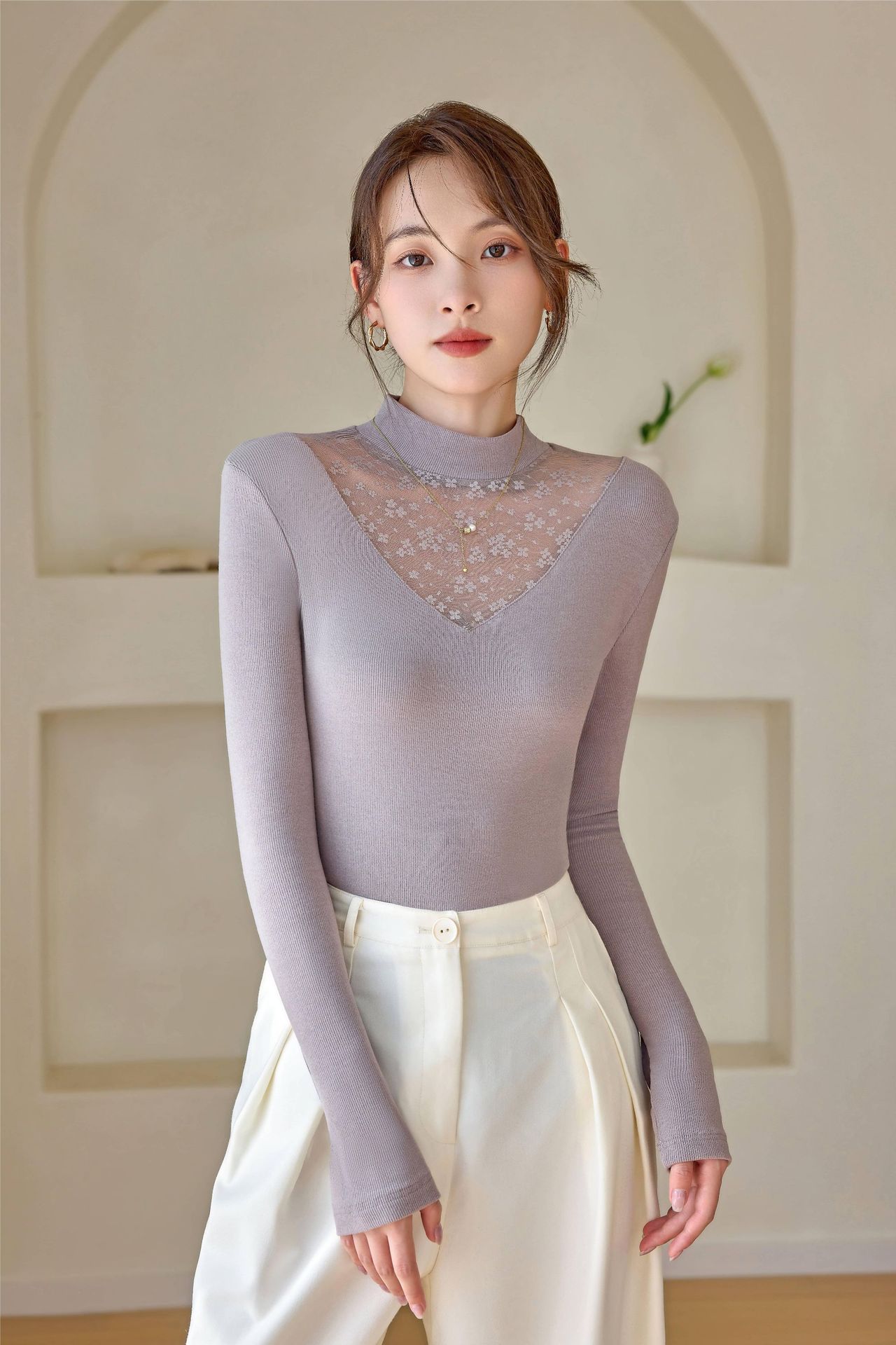 2024春季新款网纱打底衫女士亮丝内搭半高领镂空蕾丝小衫上衣