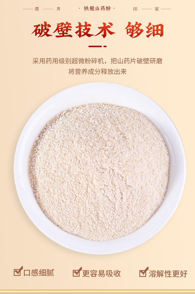 怀山药是在微量元素丰富的垆土中生长,且生长周期更长,制成的纯铁棍怀山药粉颜色呈淡淡的米黄色