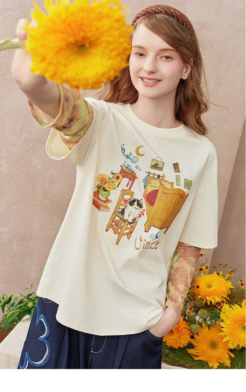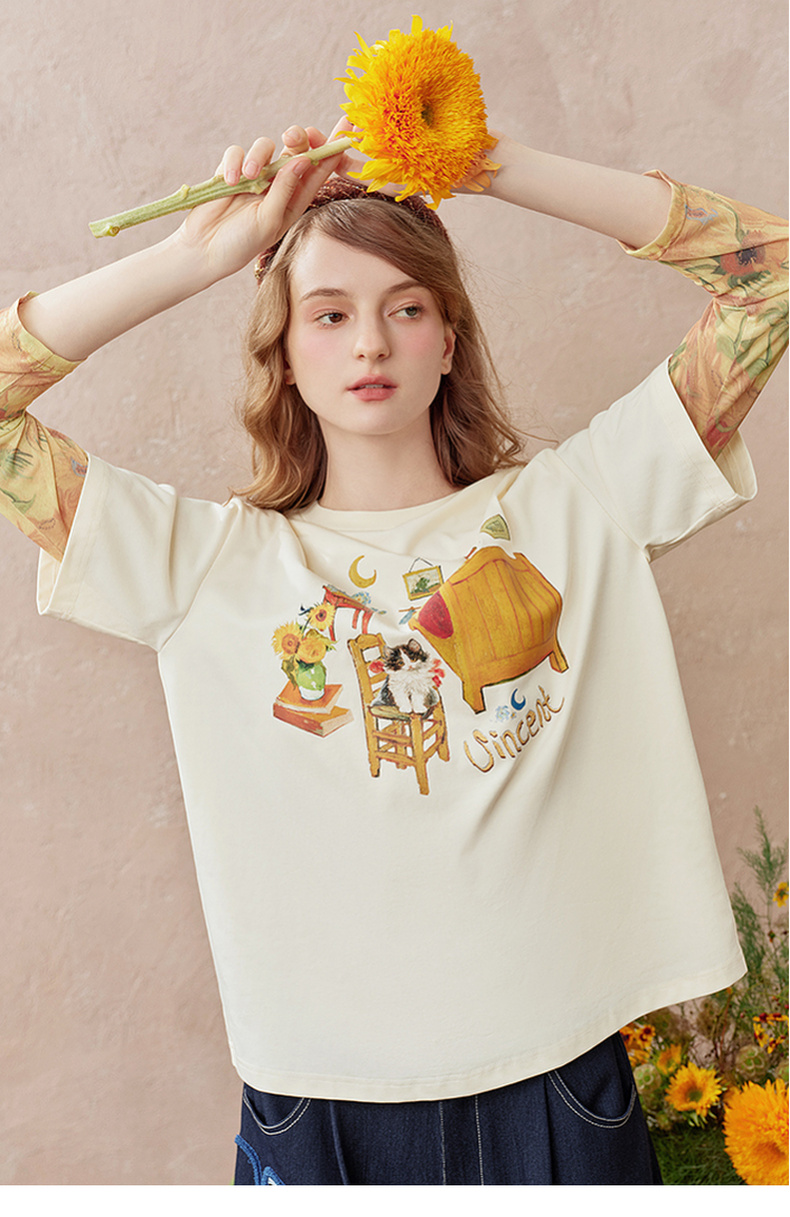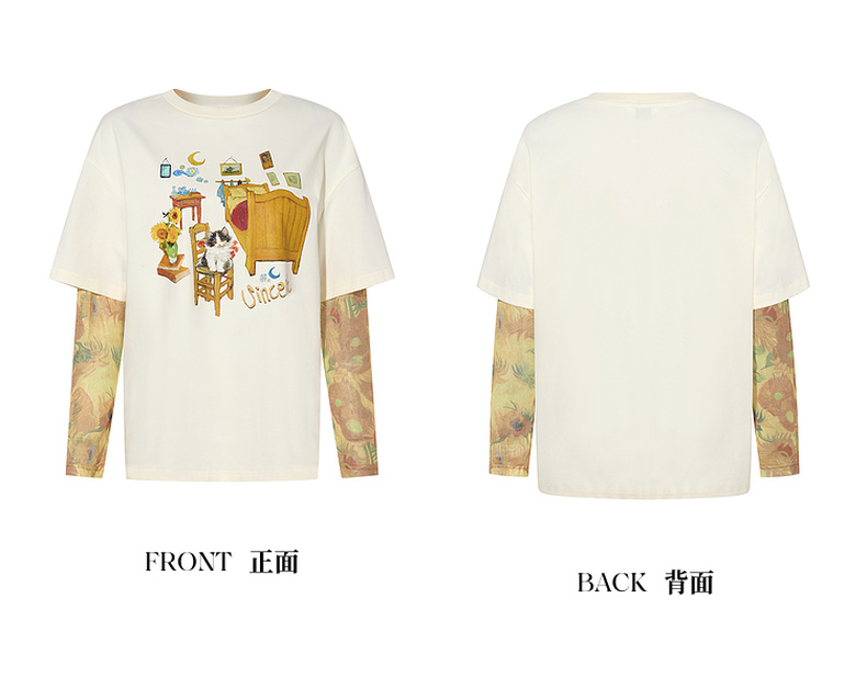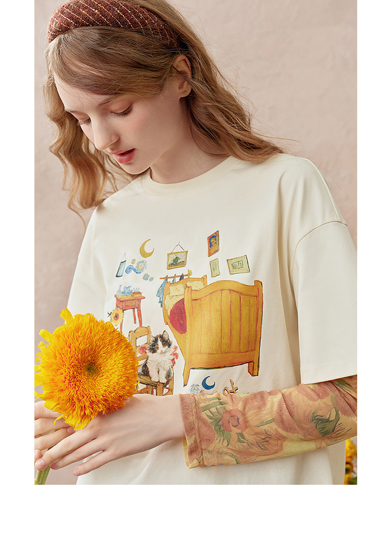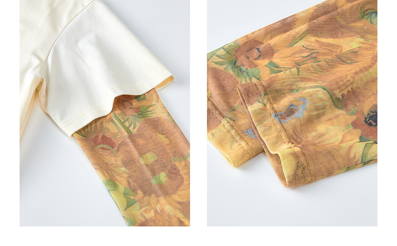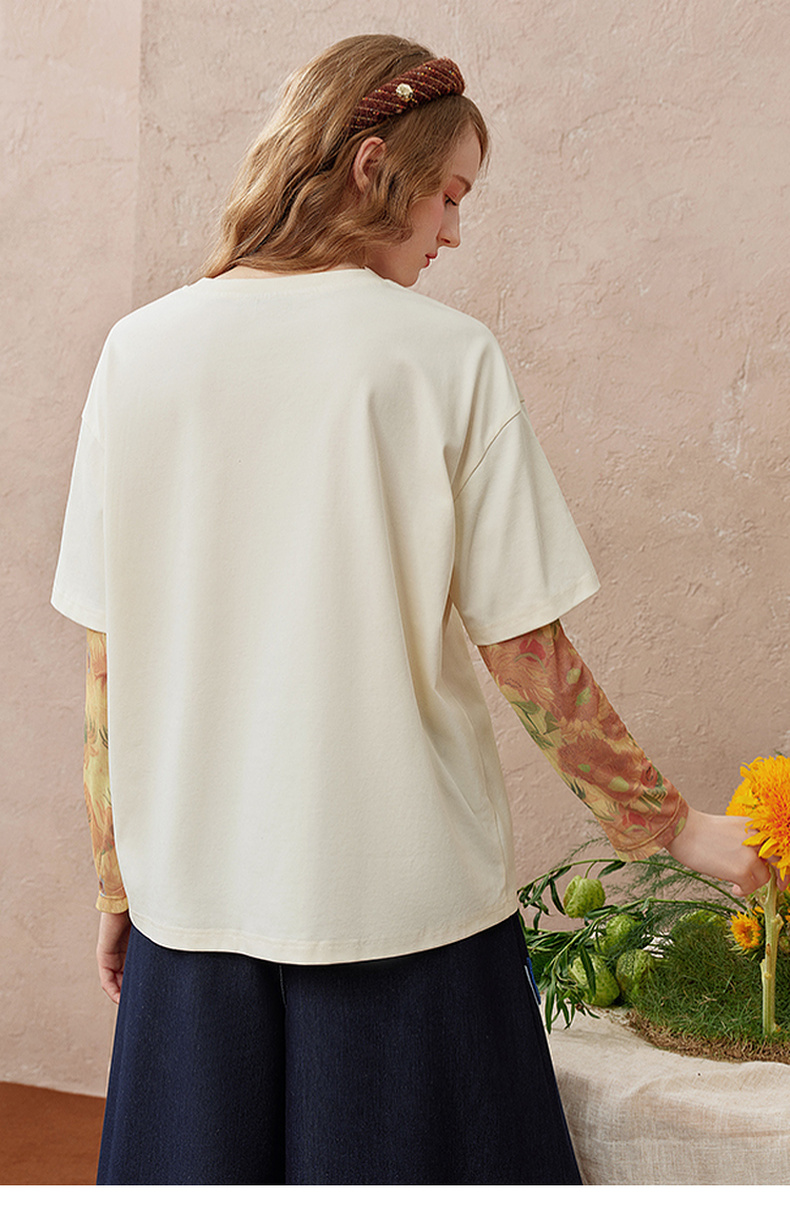 两三事梵高文艺 葵色午后 2025秋季新款印花网纱拼接假两件t恤女