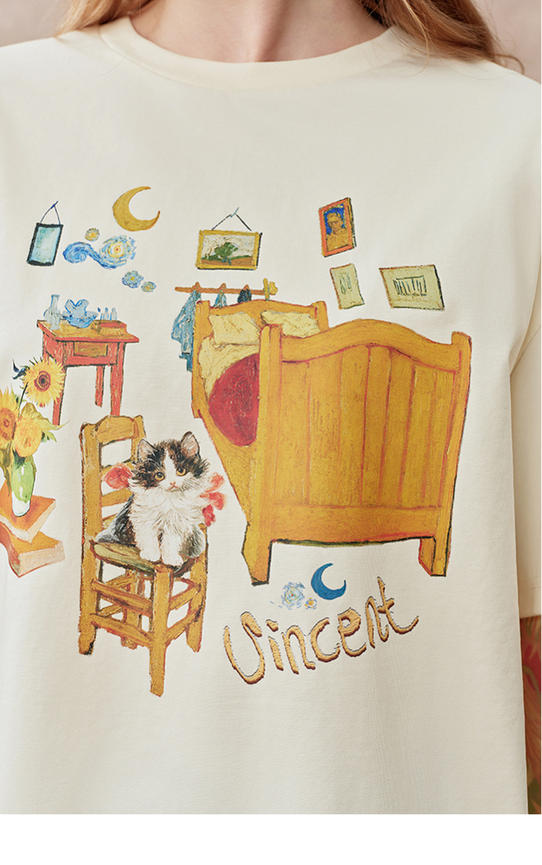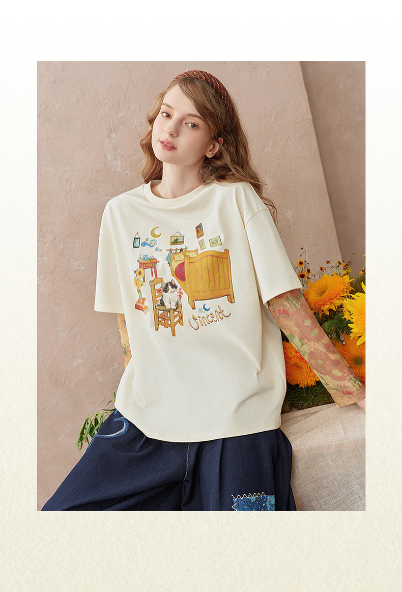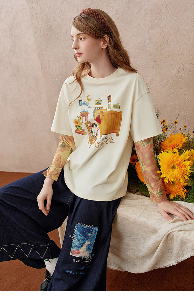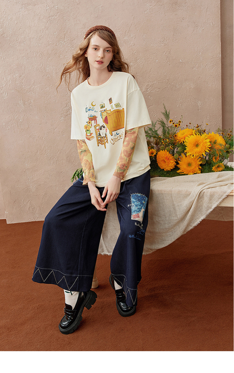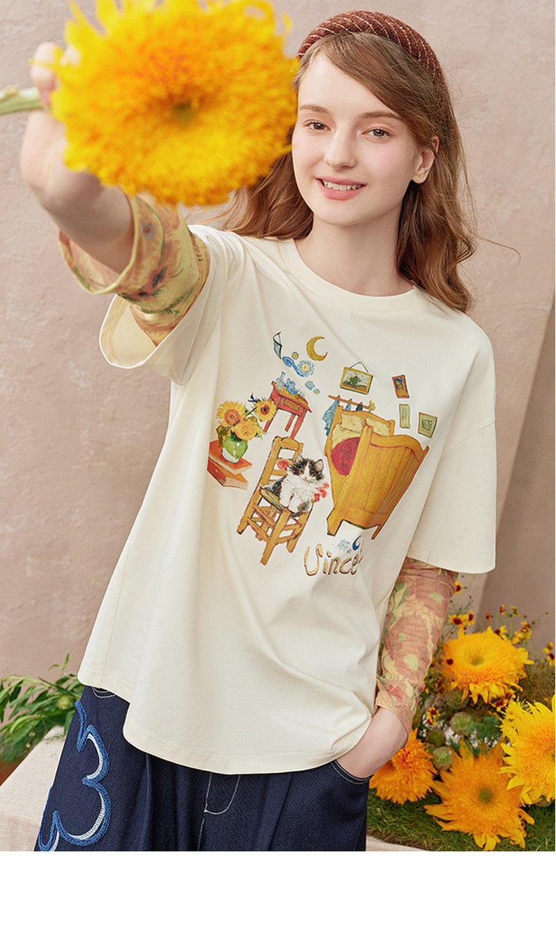两三事梵高文艺 葵色午后 2025秋季新款印花网纱拼接假两件t恤女