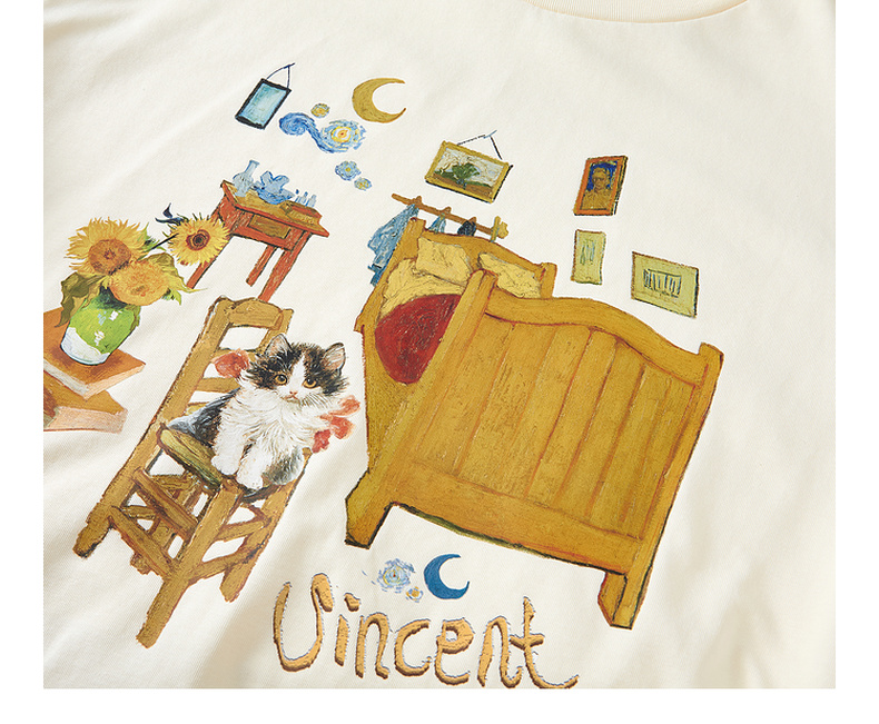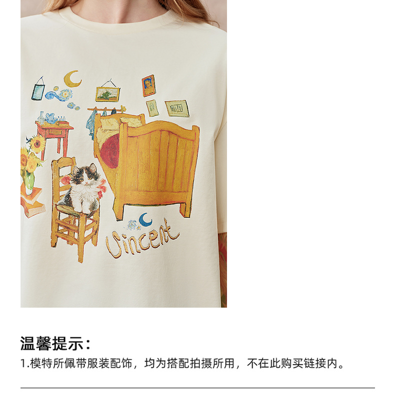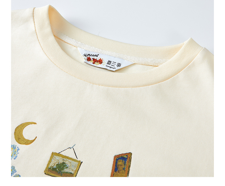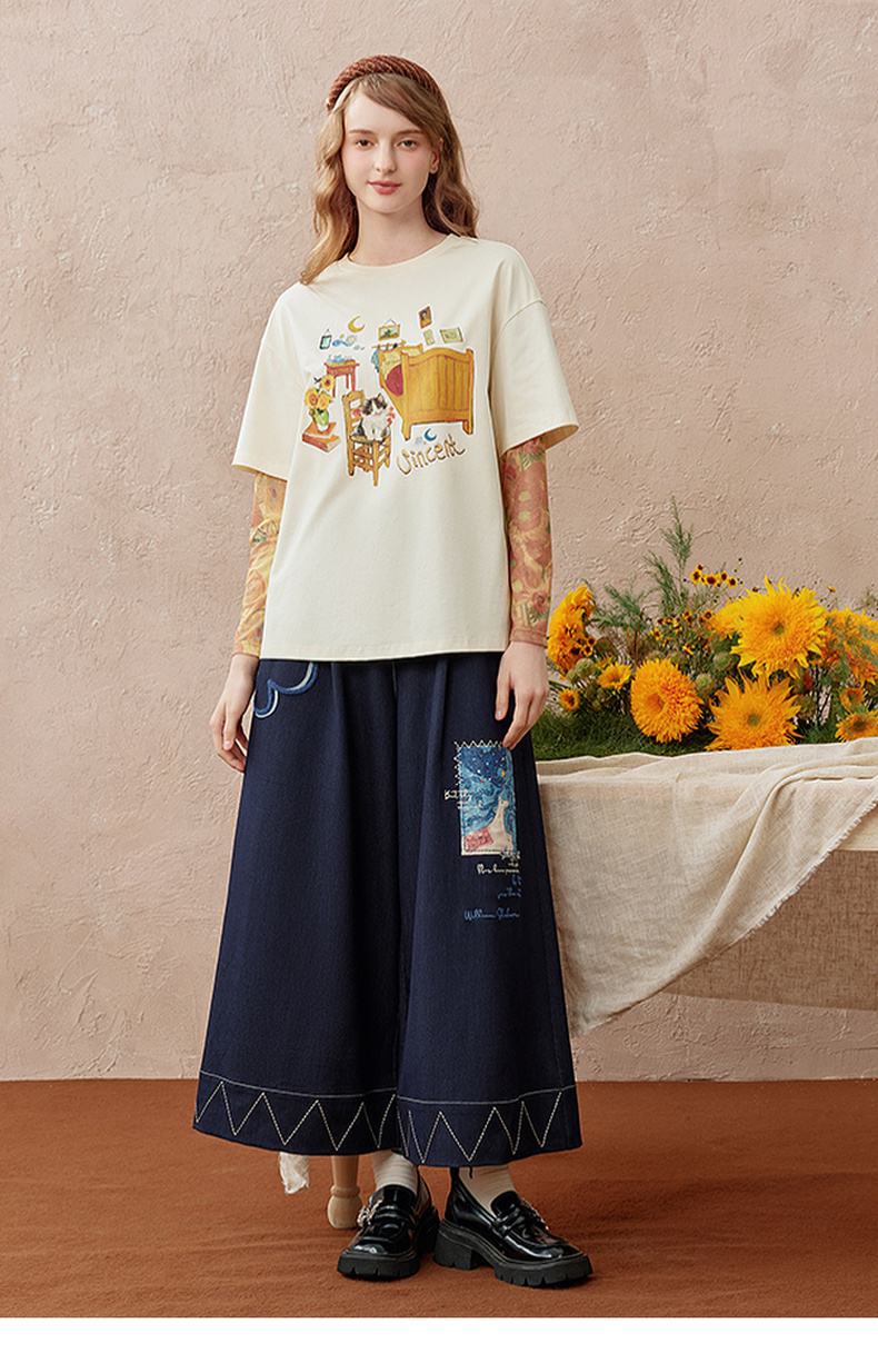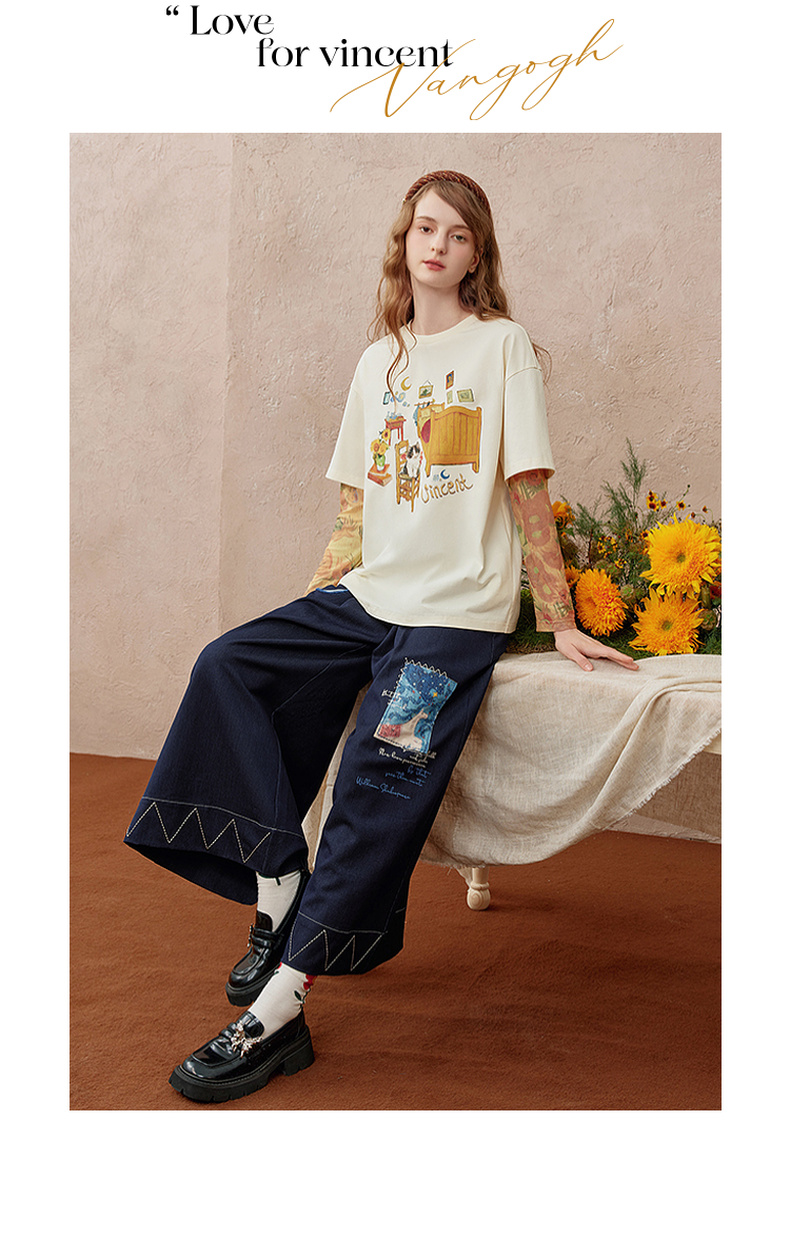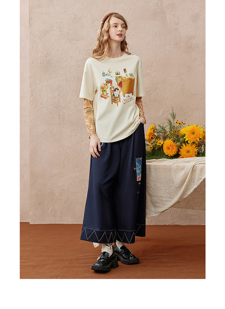两三事梵高文艺 葵色午后 2025秋季新款印花网纱拼接假两件t恤女
