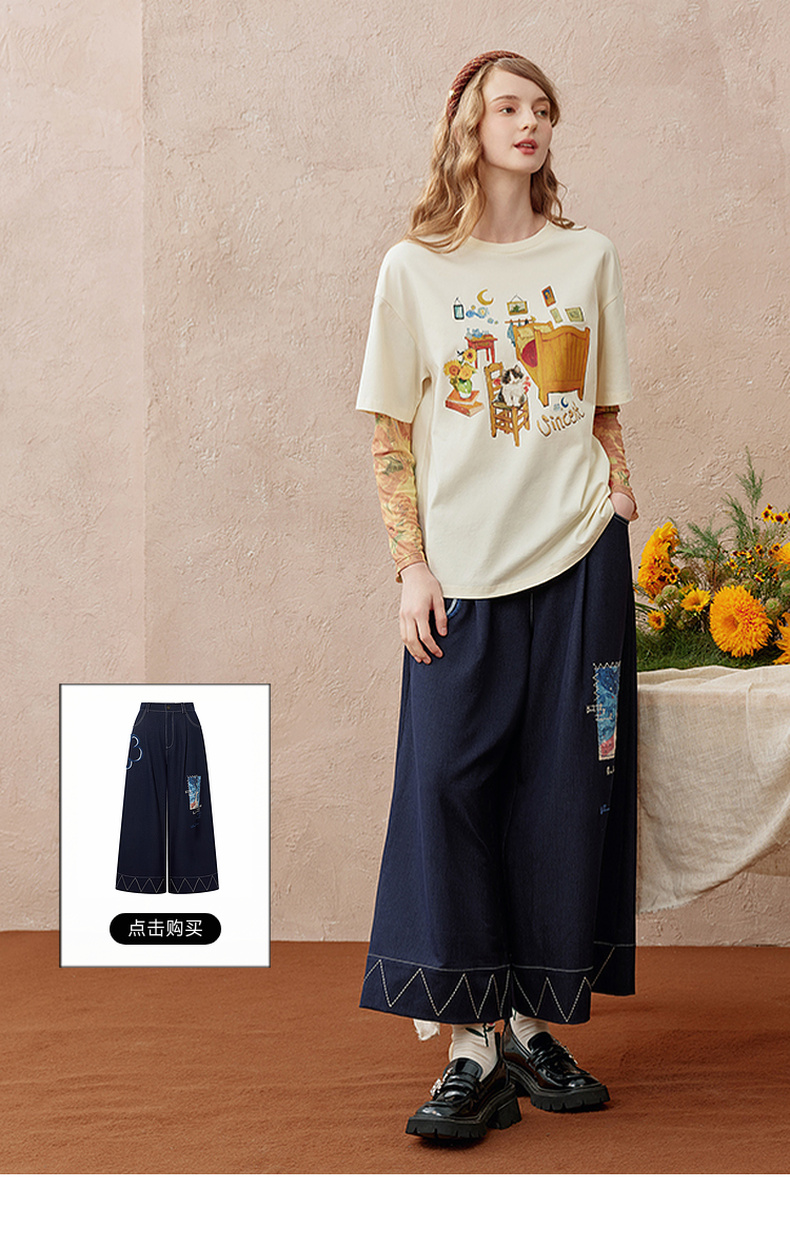 两三事 遁入花境 2025春季新款休闲拼色插肩袖印花刺绣t恤女宽松S25CT444