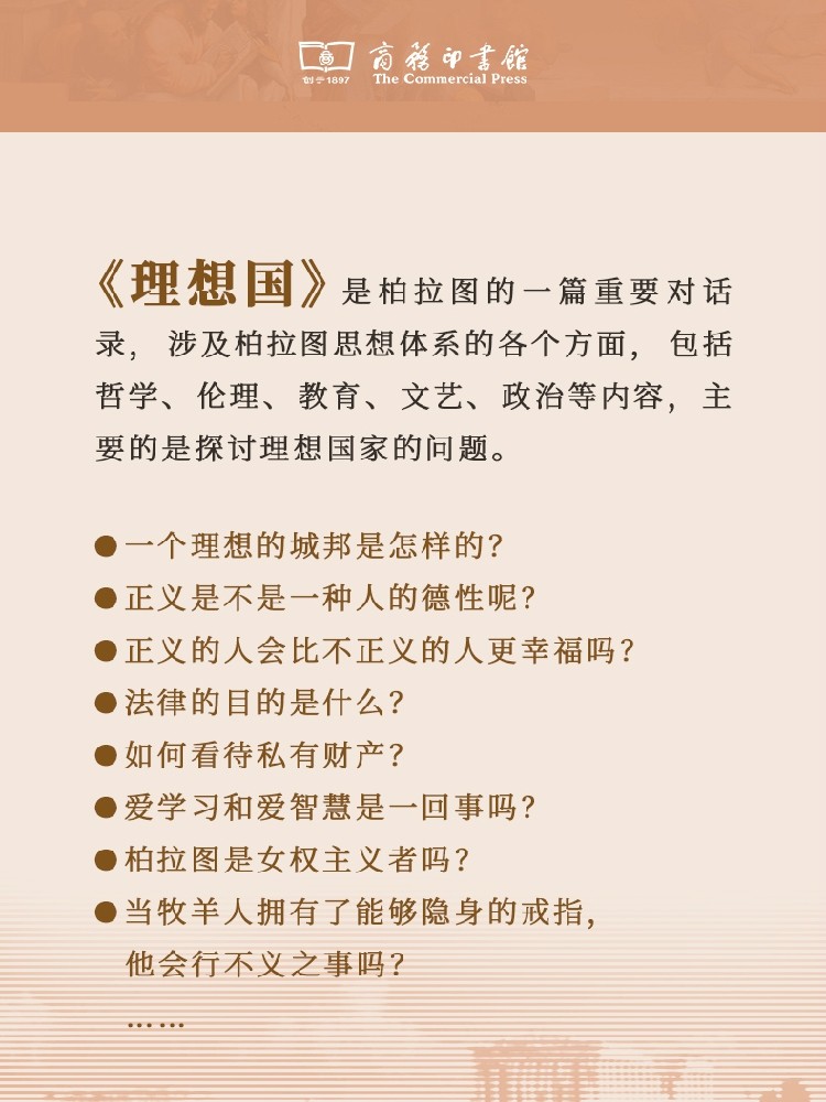 《理想国》是柏拉图的代表作,它成于作者壮年,震古铄今,影响深远,不仅是作者政治思想的宣言书,而且是一部折人政治家的治国纲要。柏拉图坚信哲学家能兼为政治家,确能治理世界。书中论及正义、国家、财产、幸福、哲学家、真理、认识、理念等方方面面的问题,两千余年来为西方知识界**之书。