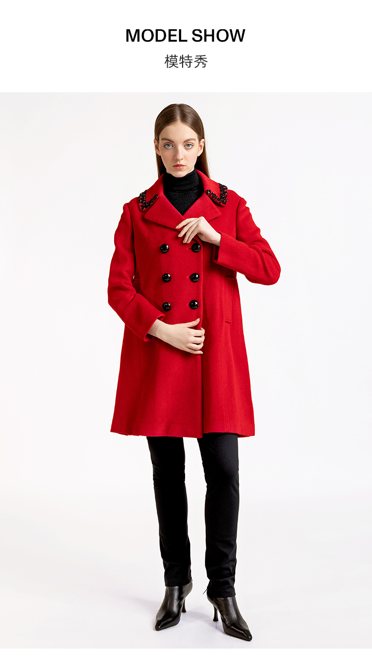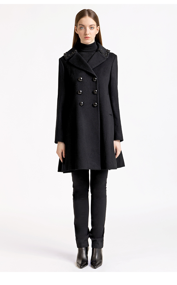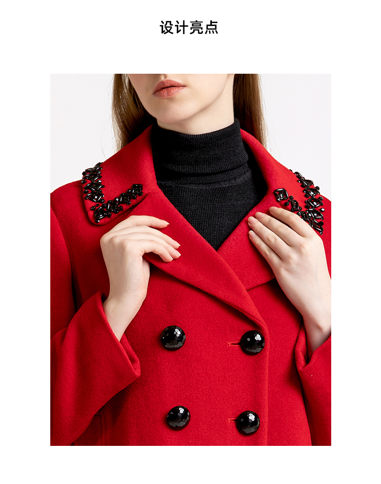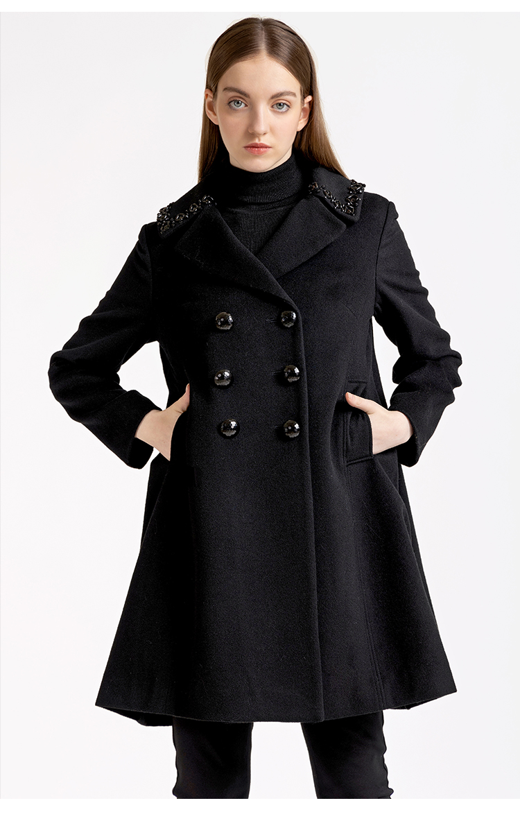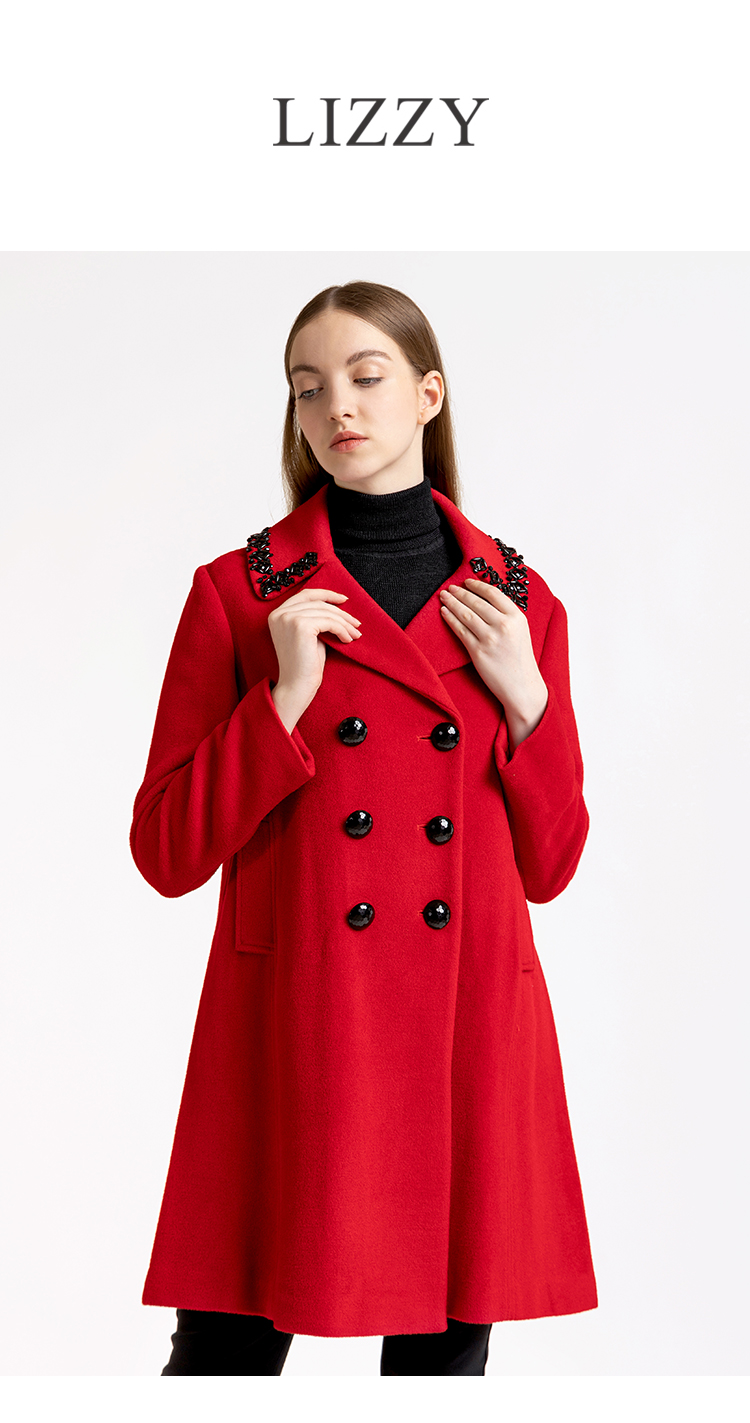 LIZZY优雅手工钉珠双排扣宽松羊毛混纺中长款大衣外套秋冬女3551