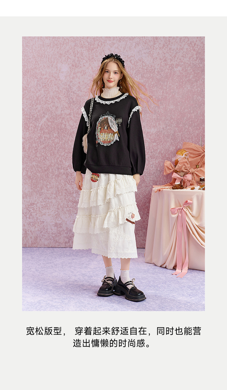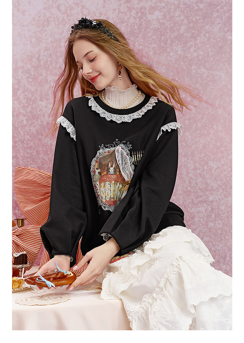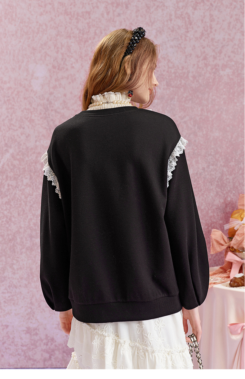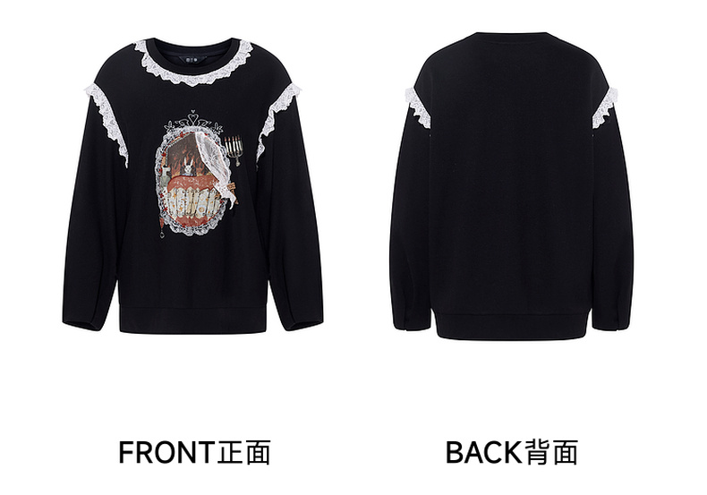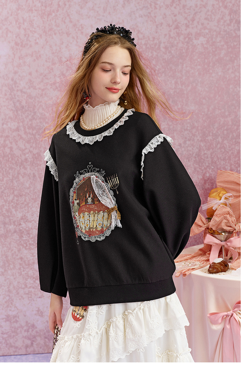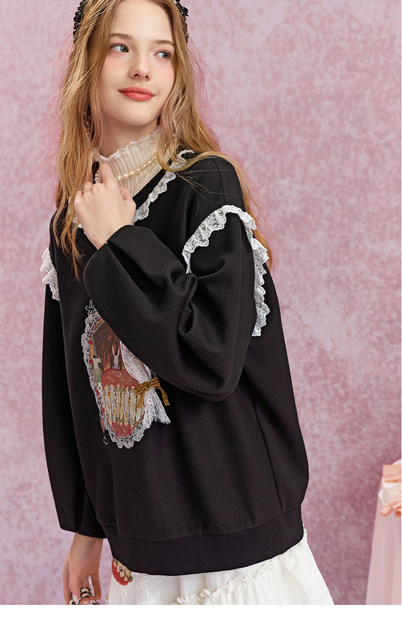 两三事 蕾丝可可 2025秋季新款甜美蕾丝边拼接印花套头卫衣女宽松