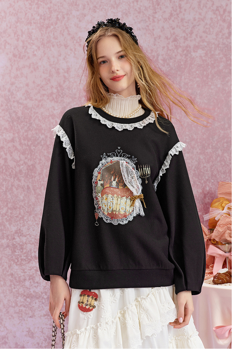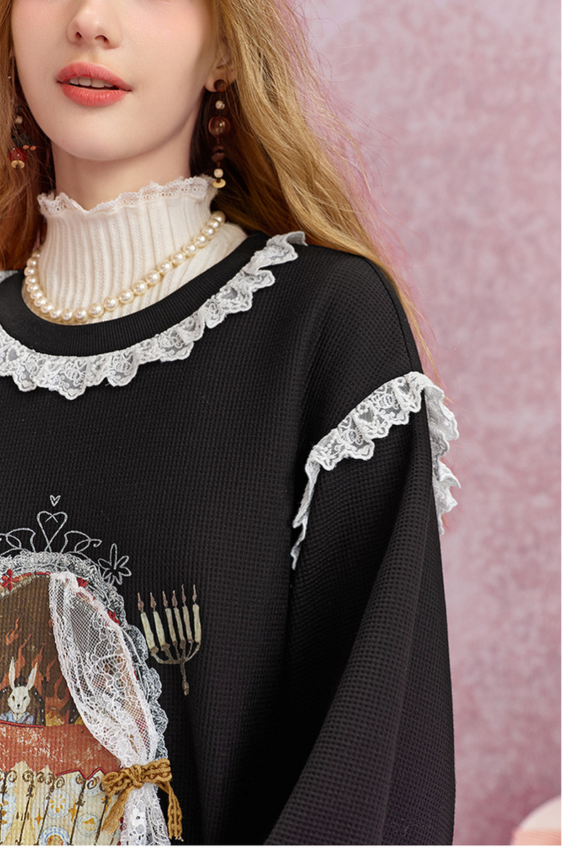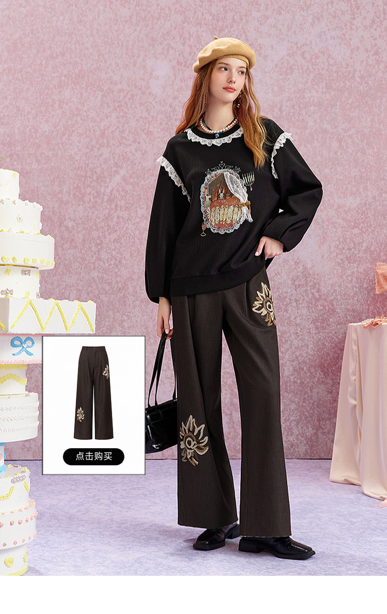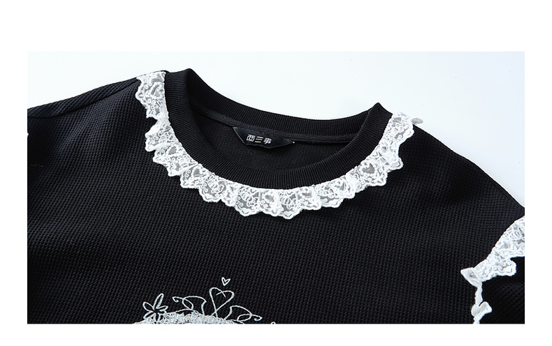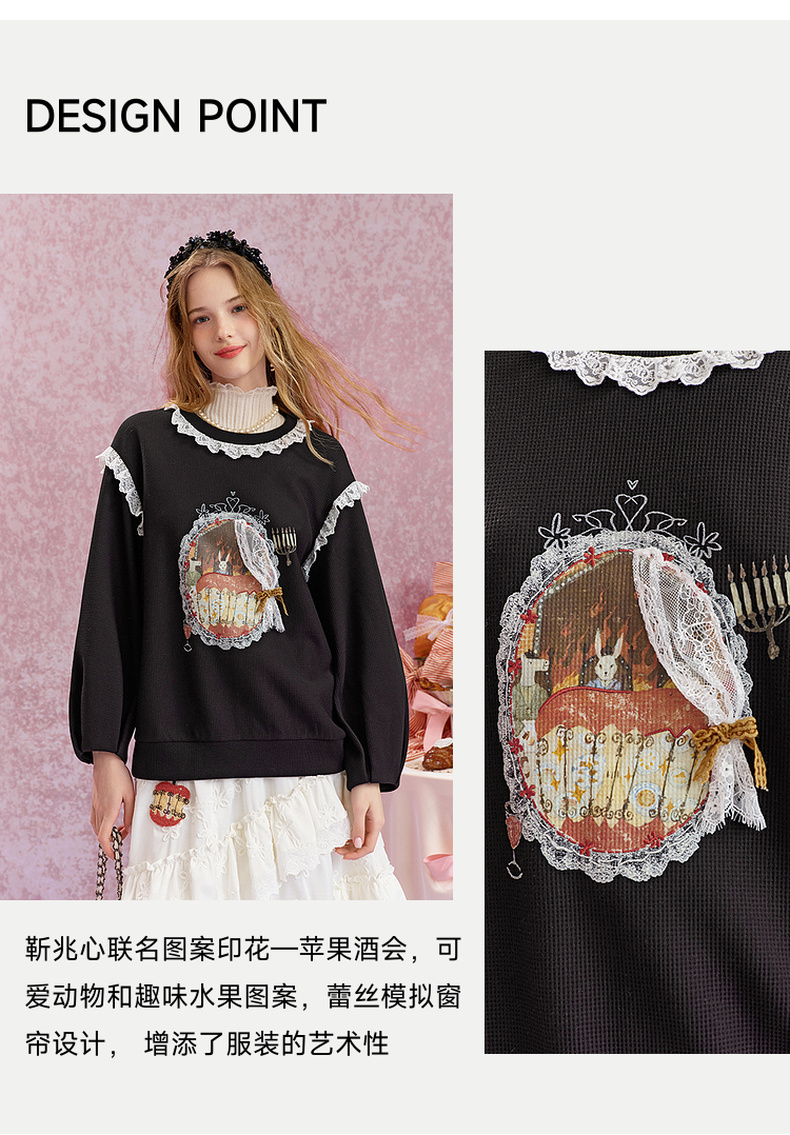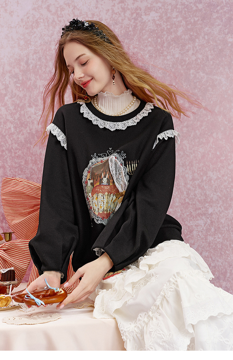 两三事 蕾丝可可 2025秋季新款甜美蕾丝边拼接印花套头卫衣女宽松