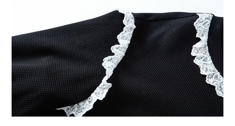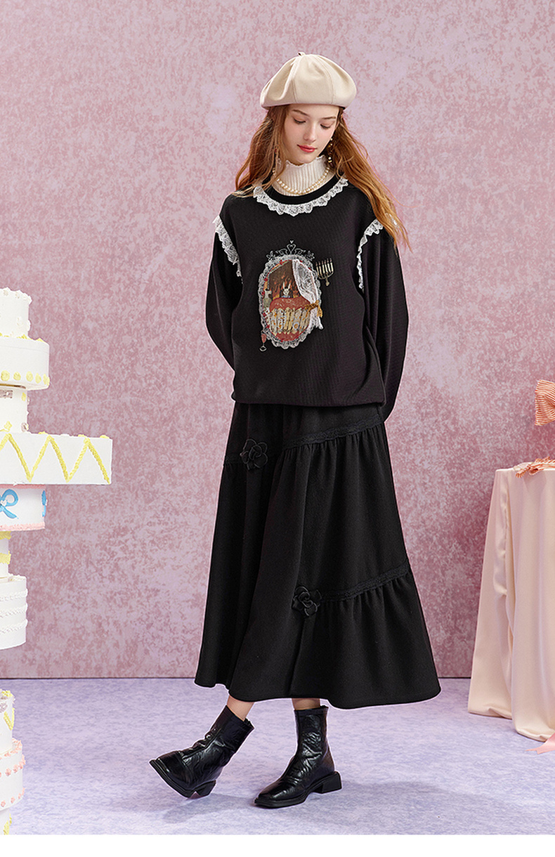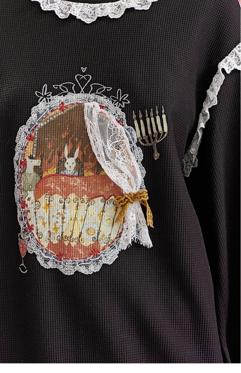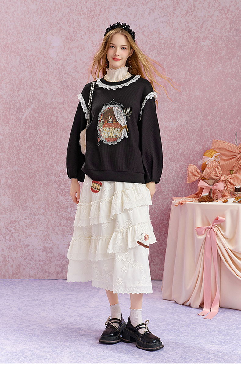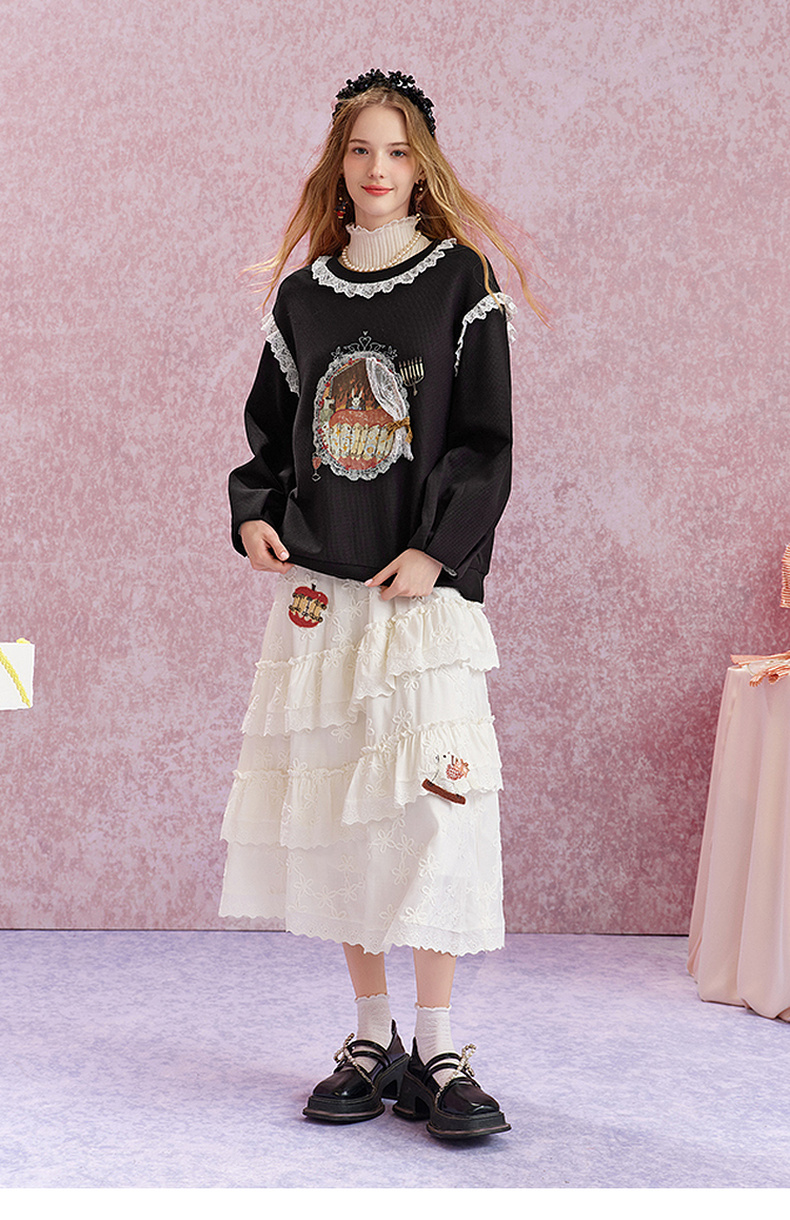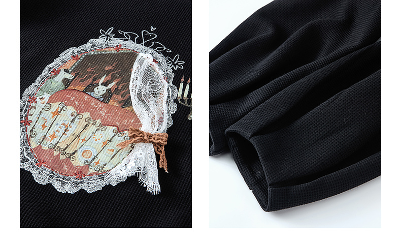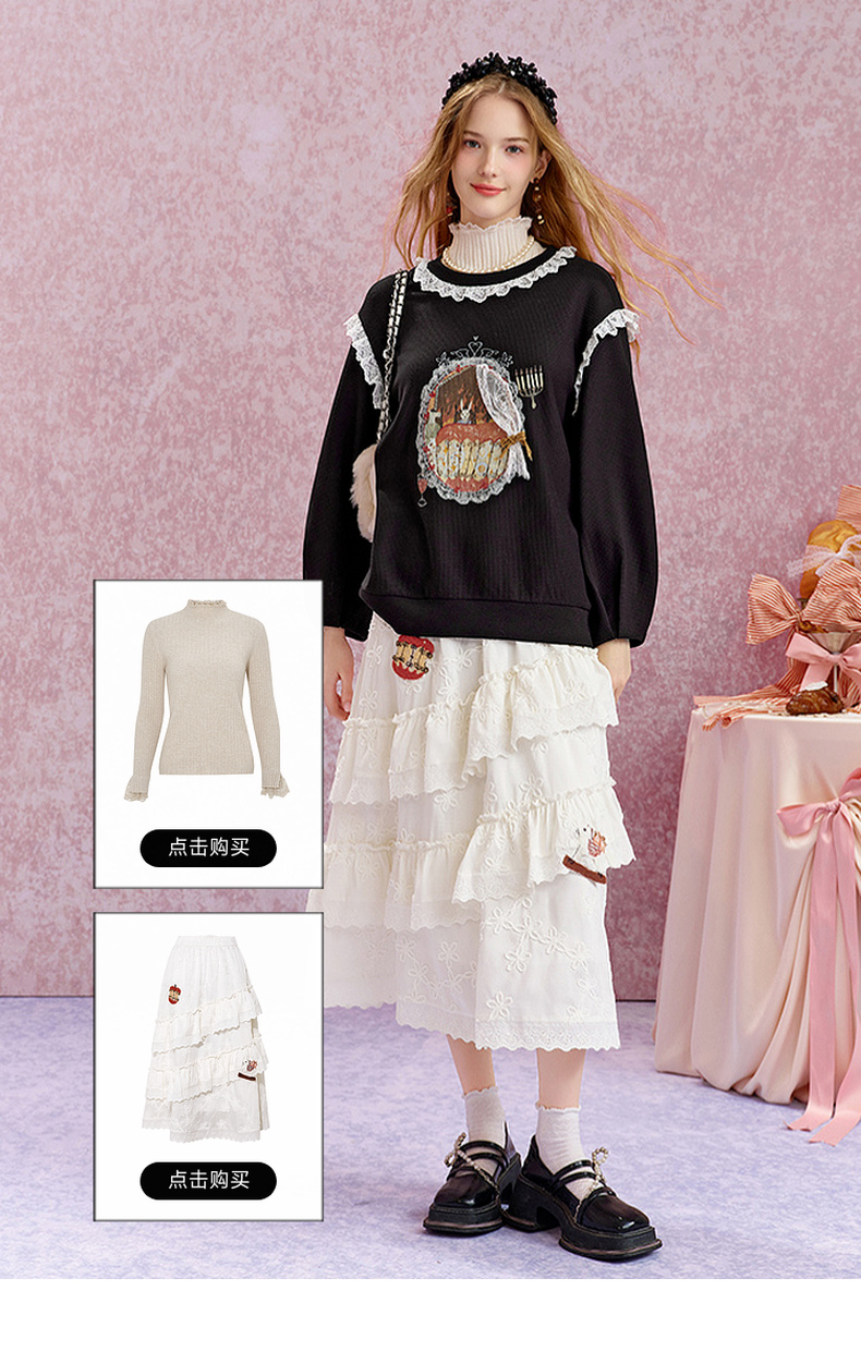两三事 蕾丝可可 2025秋季新款甜美蕾丝边拼接印花套头卫衣女宽松