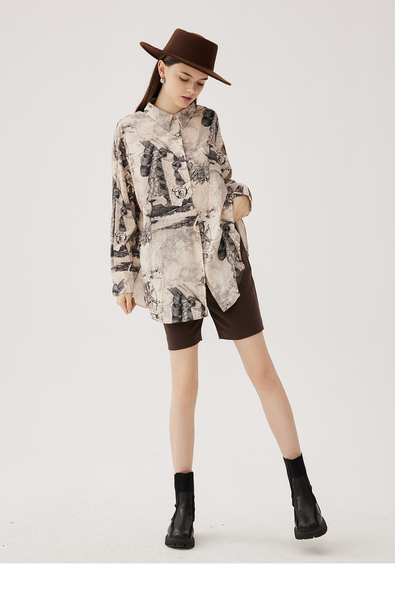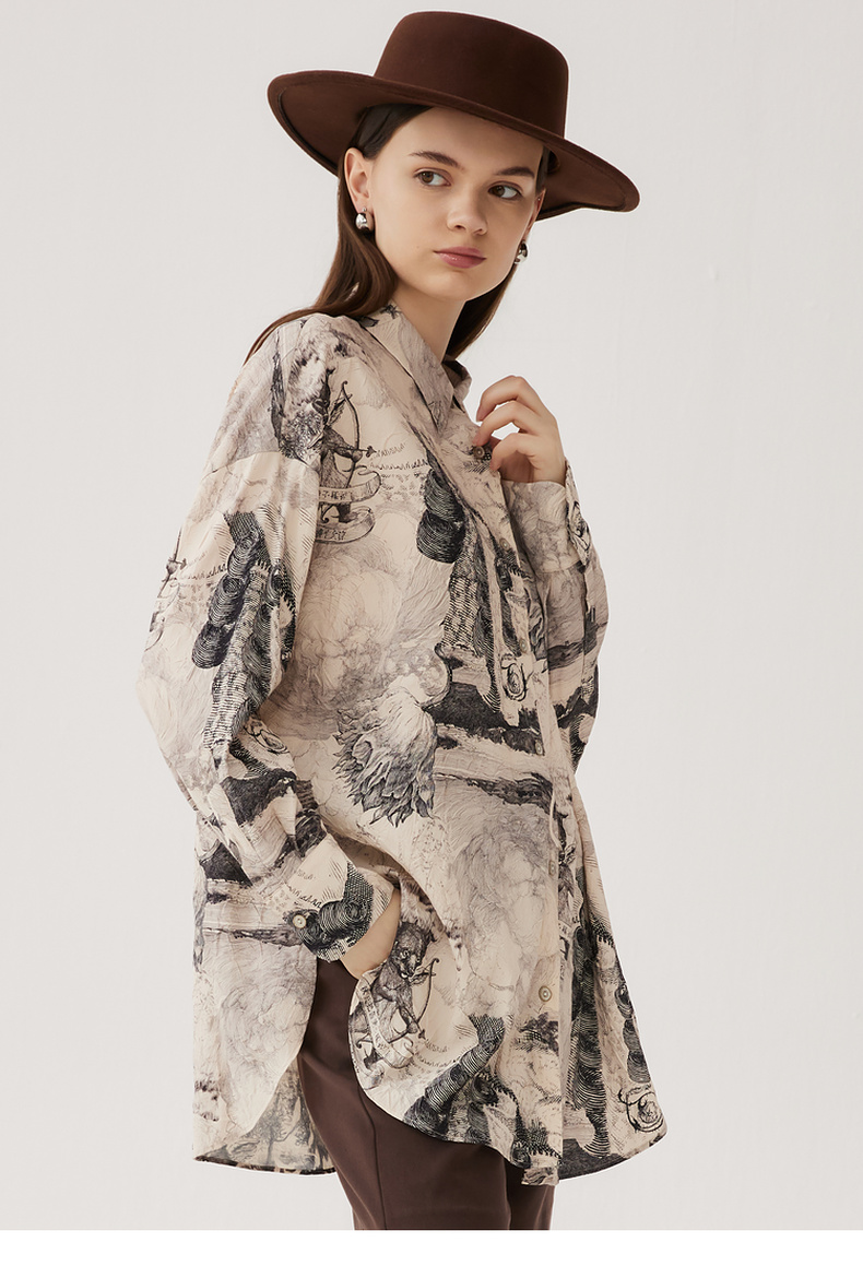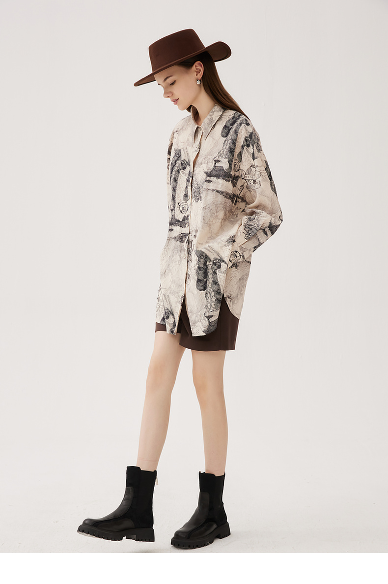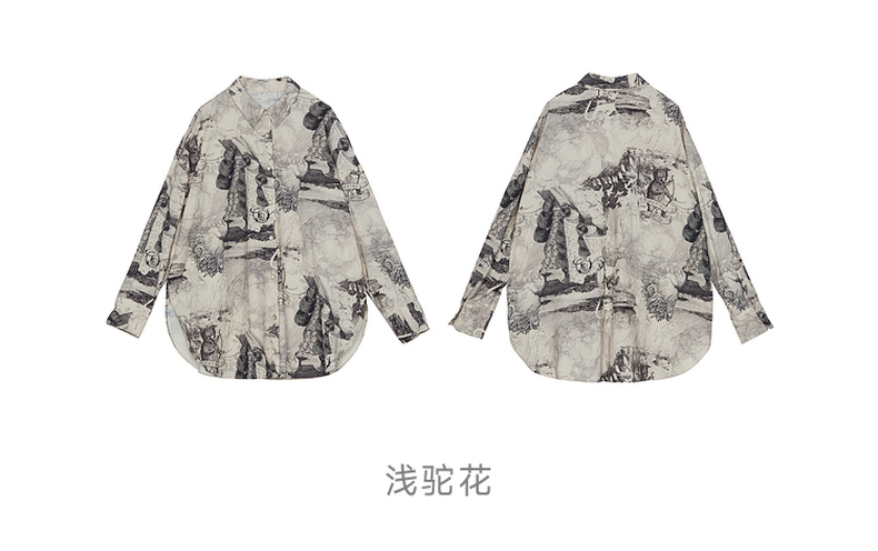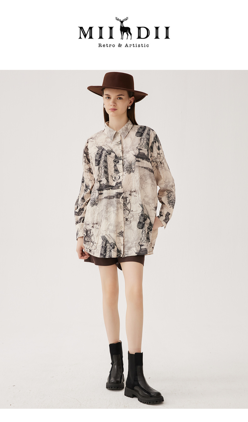 谜底花色衬衫长袖女2024秋季新品复古风宽松中长款衬衣243MC1146