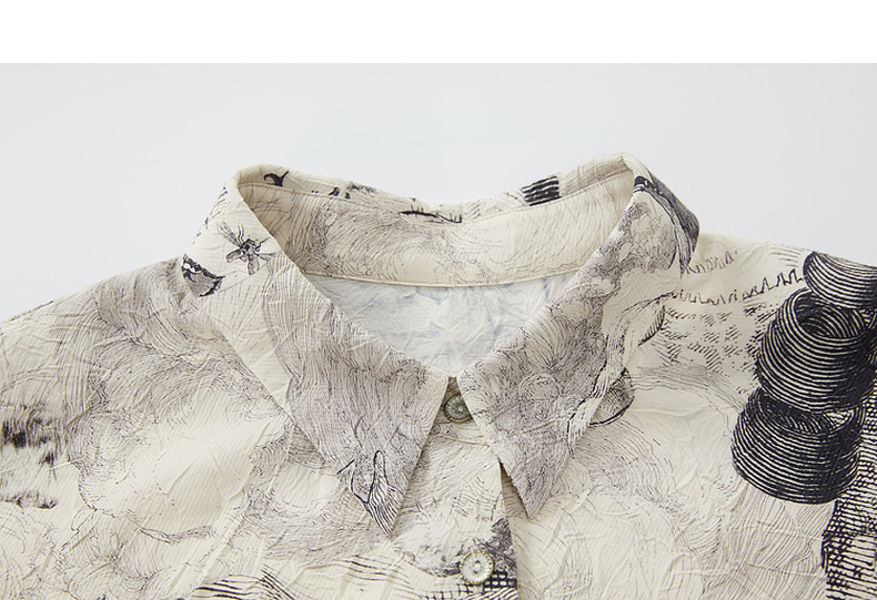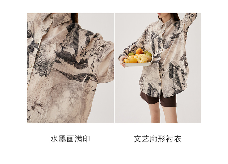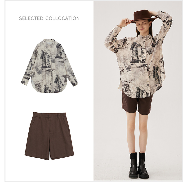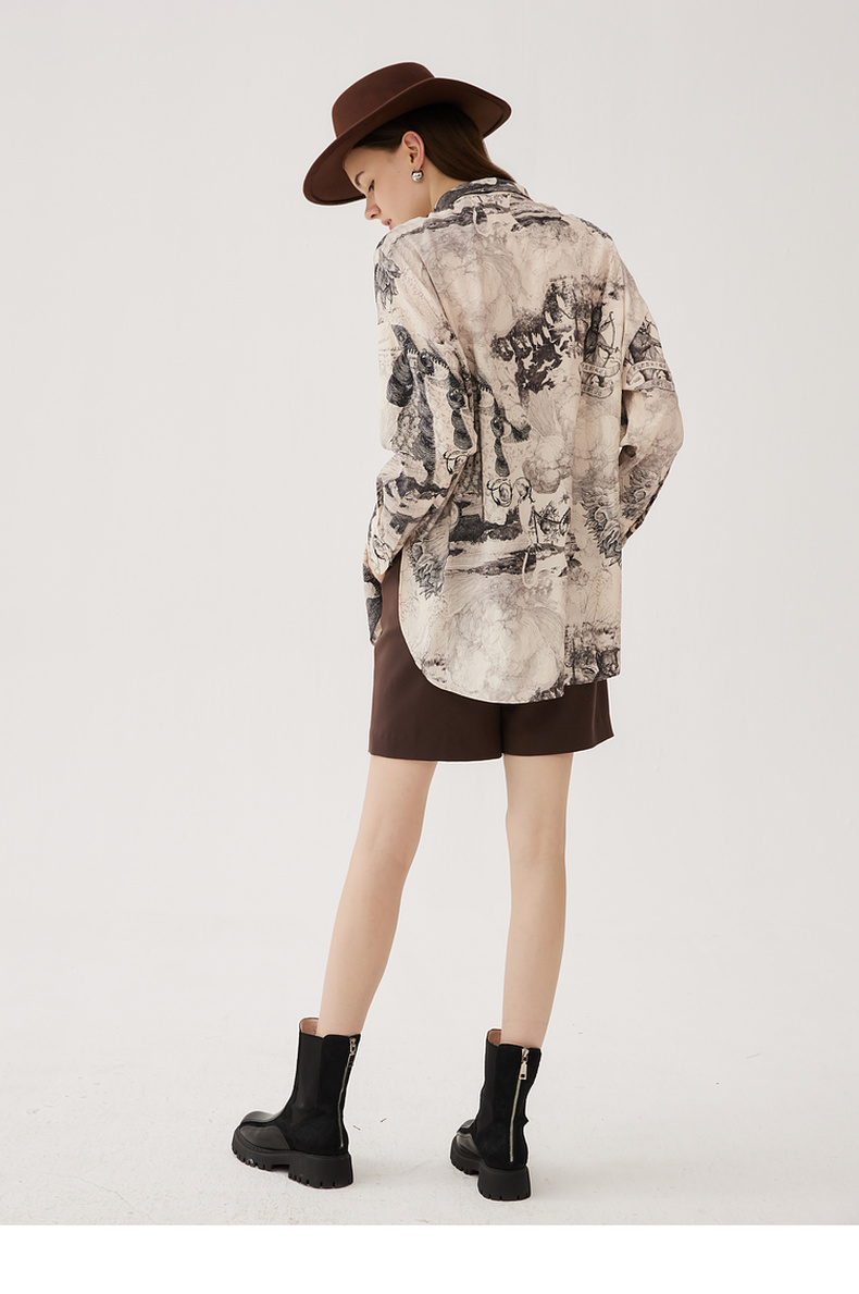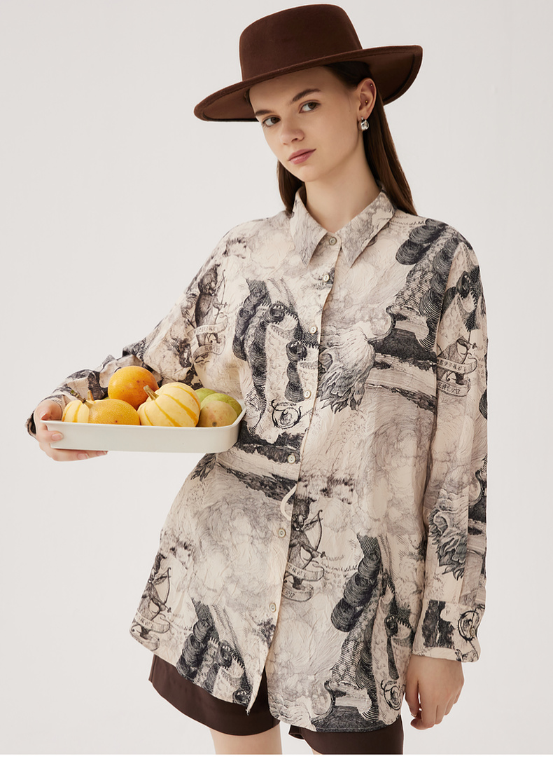 谜底花色衬衫长袖女2024秋季新品复古风宽松中长款衬衣243MC1146