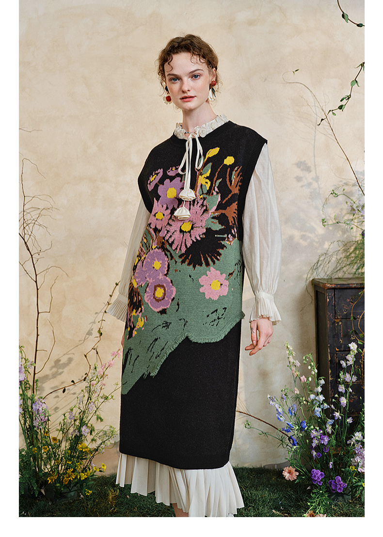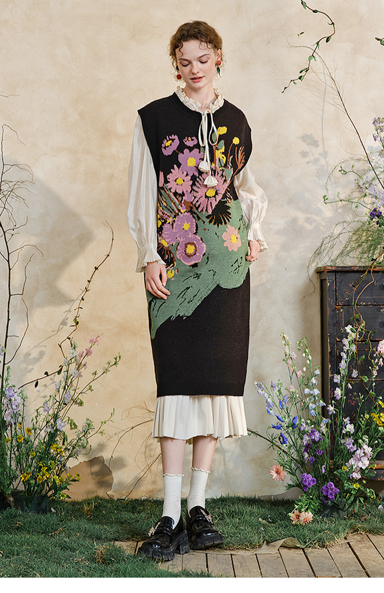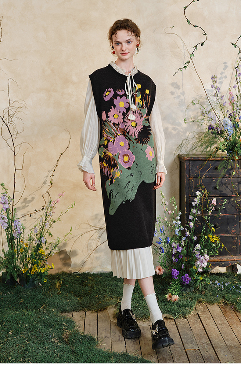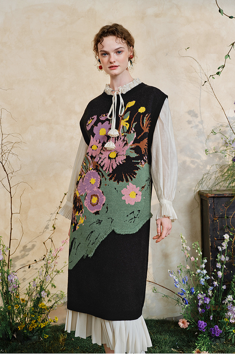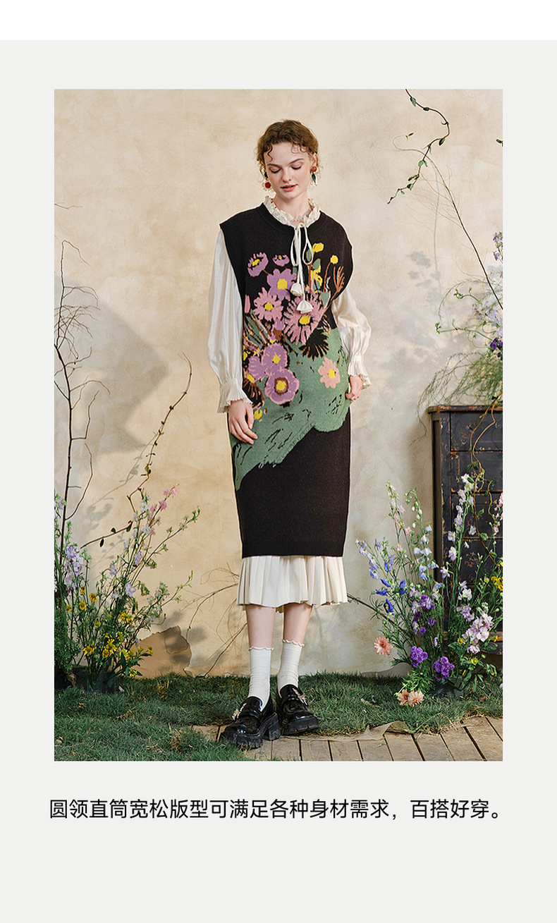 两三事 馥奇香韵 2025春季新款复古花卉图案无袖毛衣裙连衣裙
