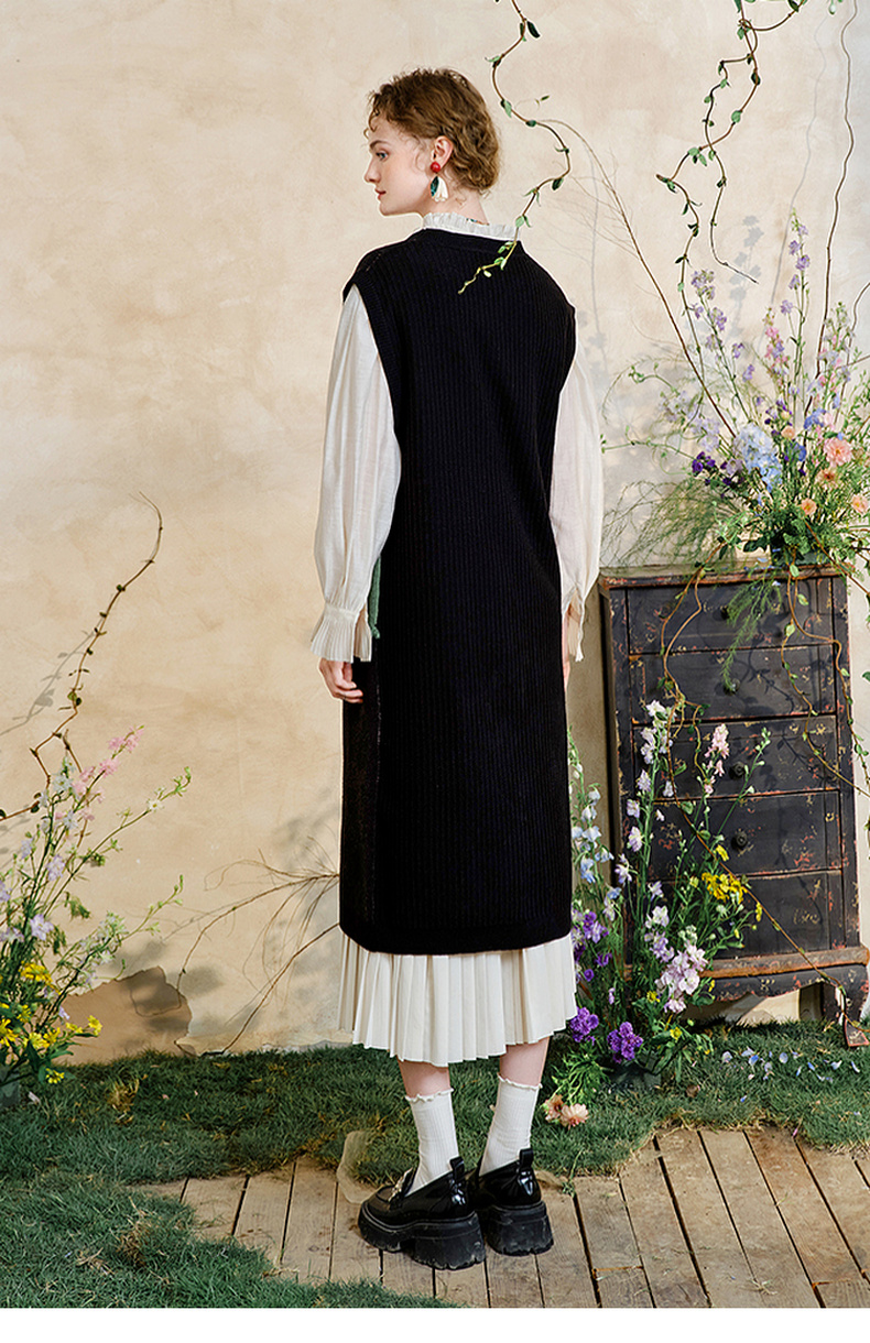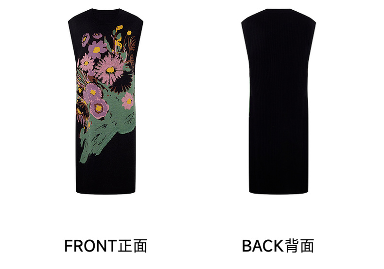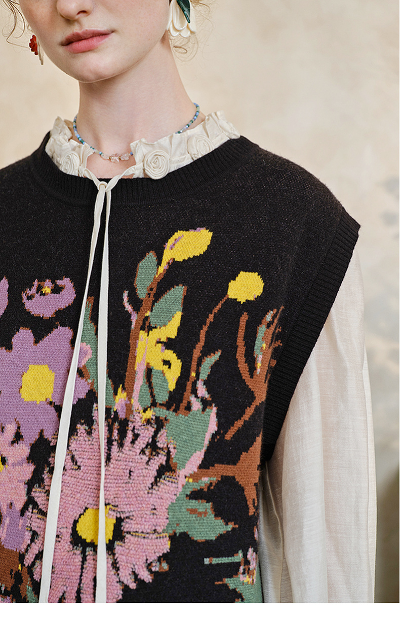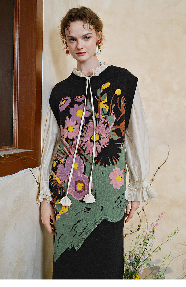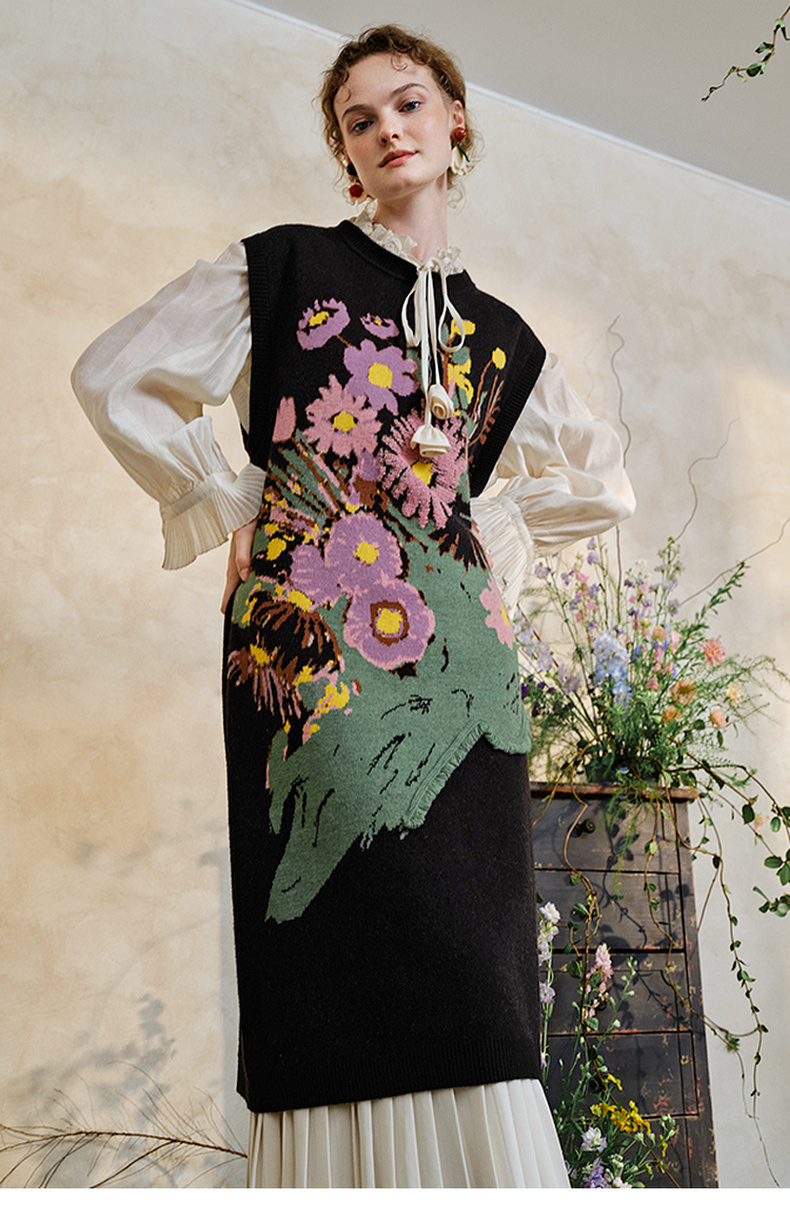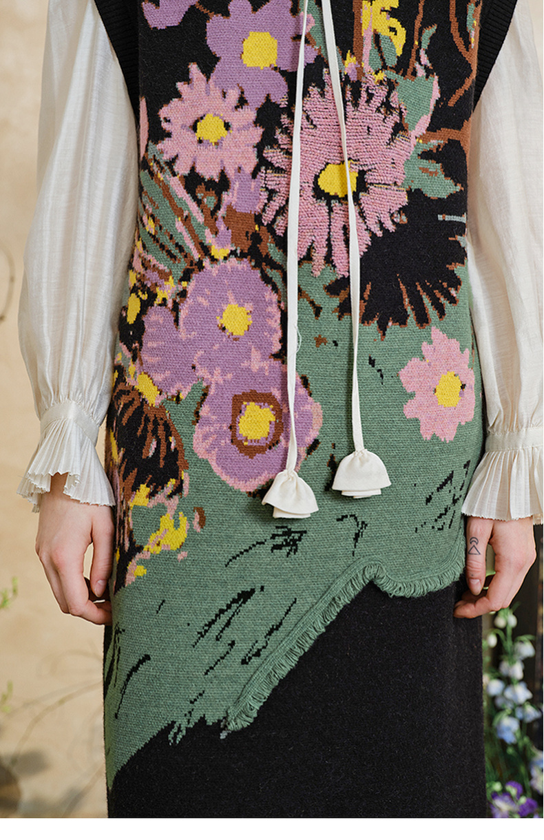两三事 馥奇香韵 2025春季新款复古花卉图案无袖毛衣裙连衣裙