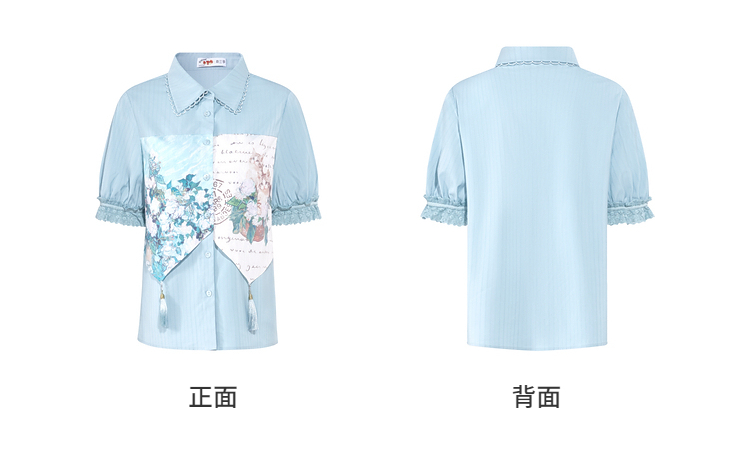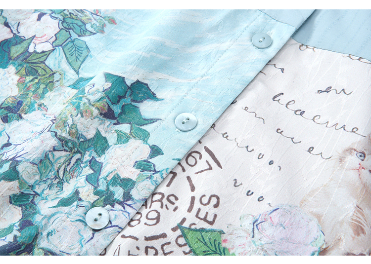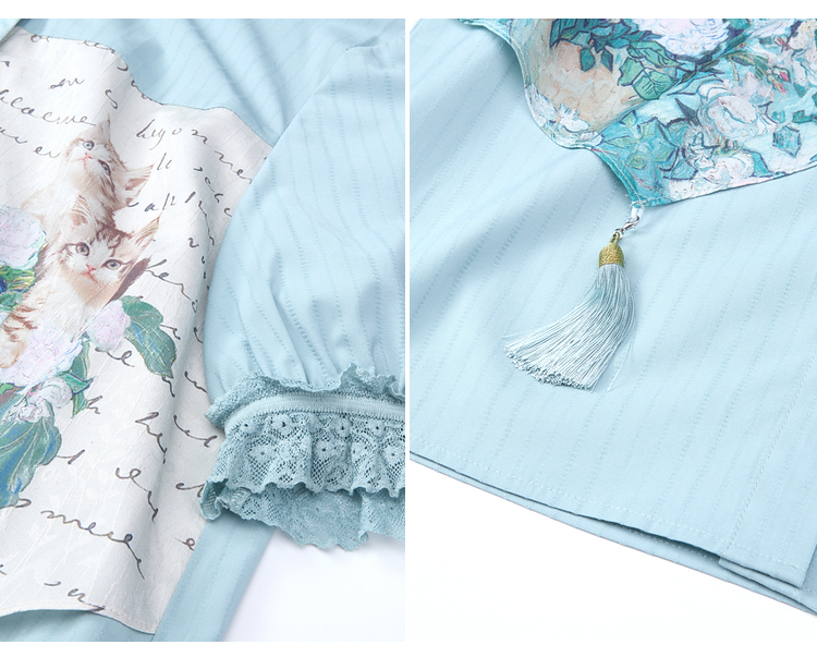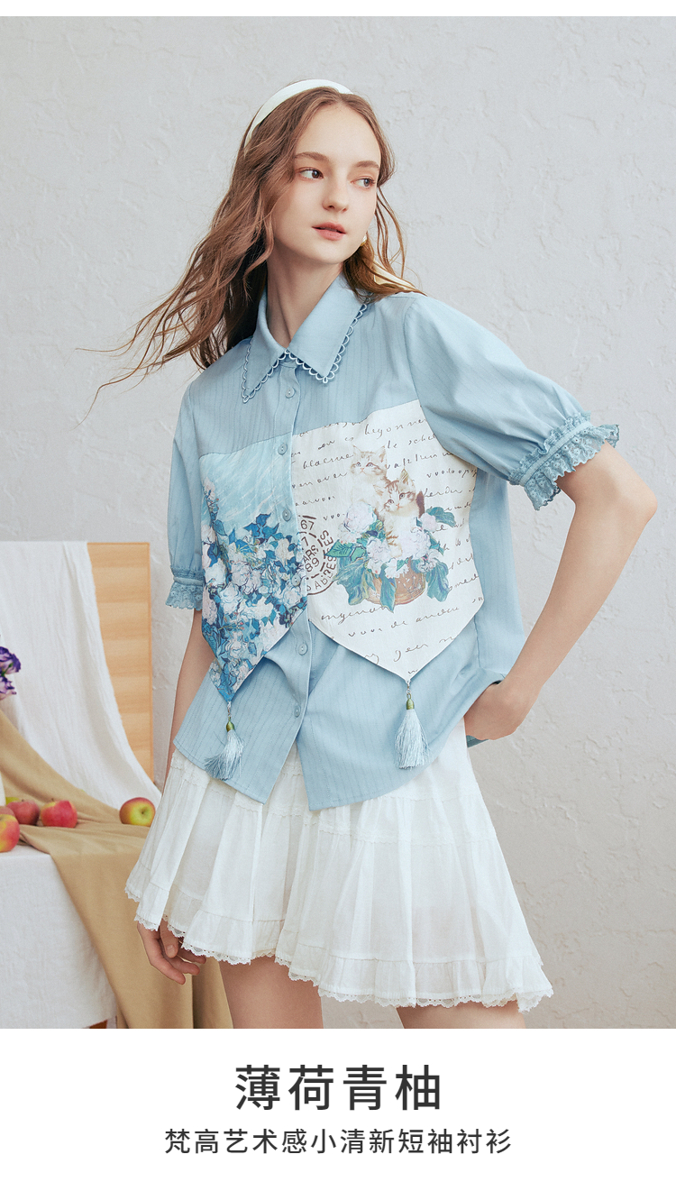 两三事梵高文艺 薄荷青柚 2026春季新款印花拼接流苏泡泡袖衬衫女