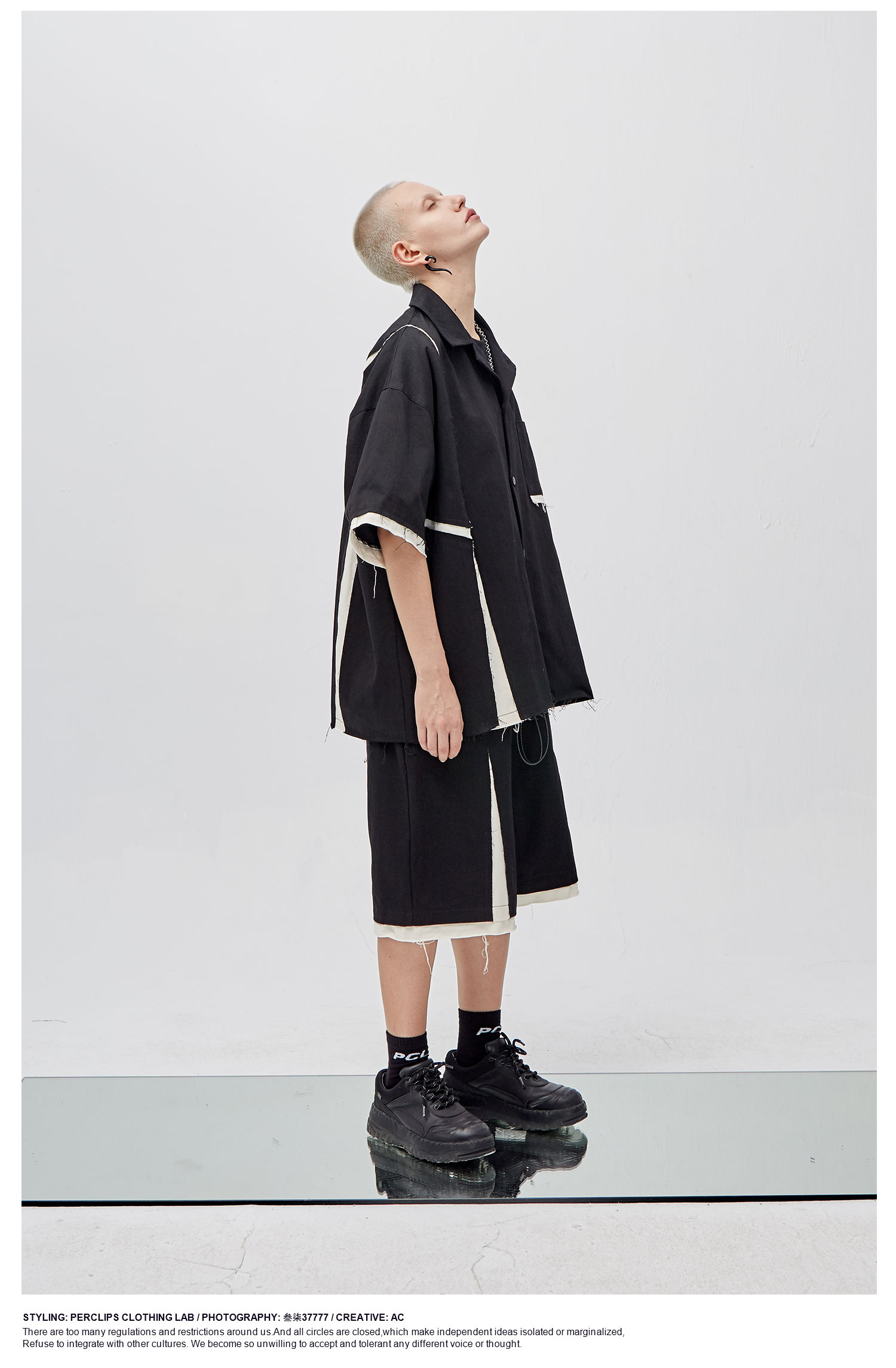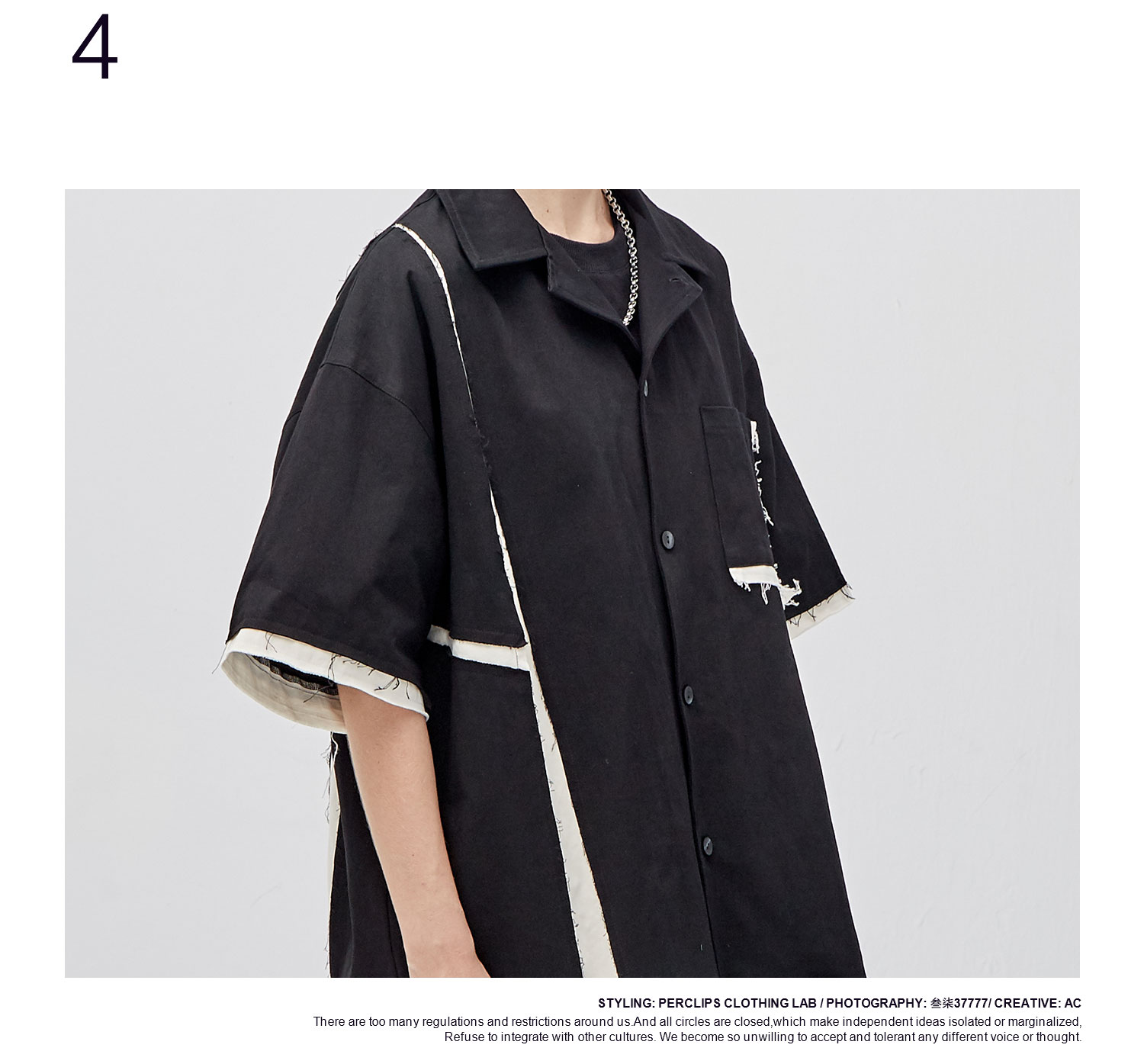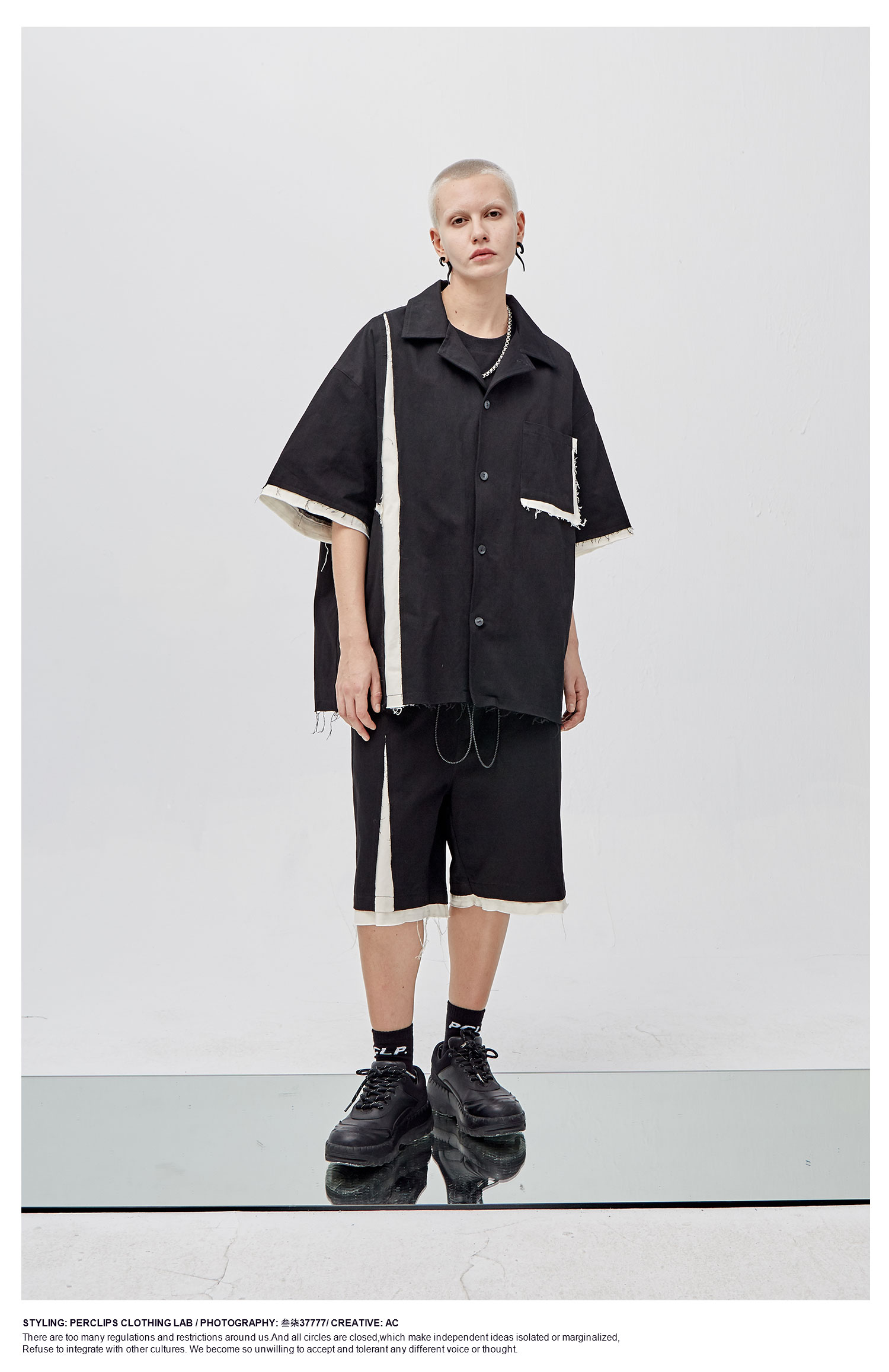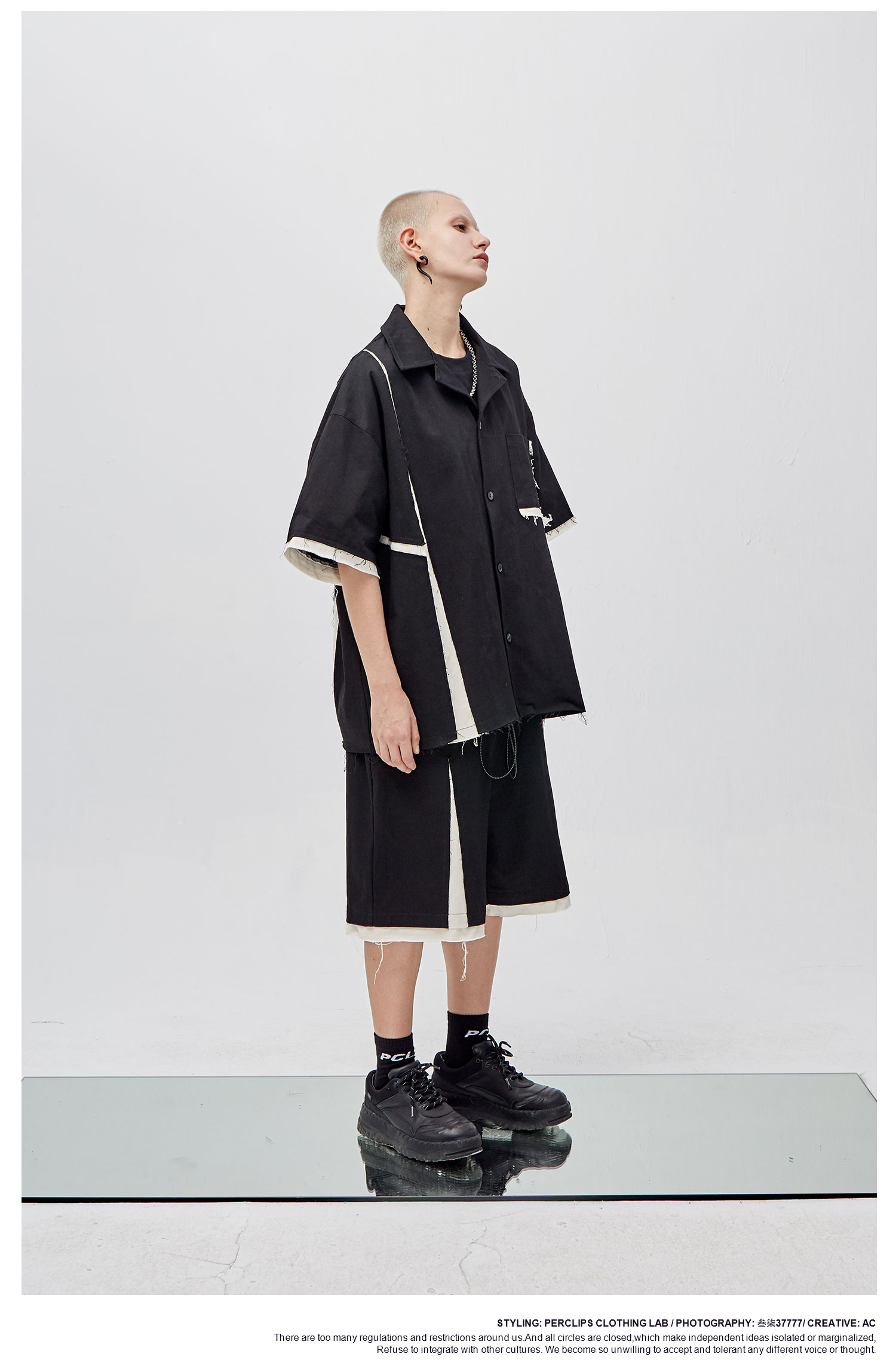 PCLP(PERCLIPS) 拼接短袖衬衫 毛边破坏潮流解构工装日系半袖衬衣