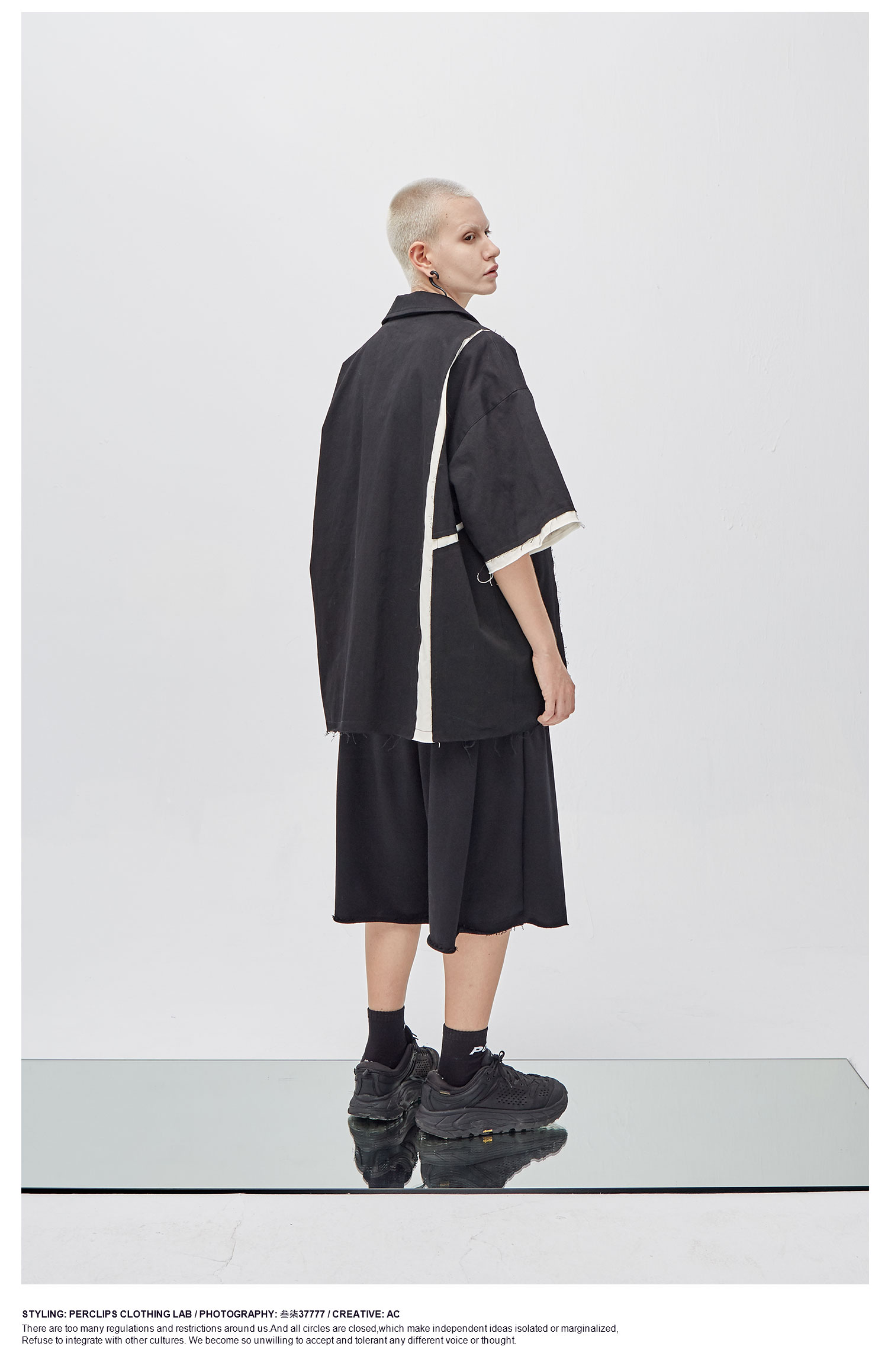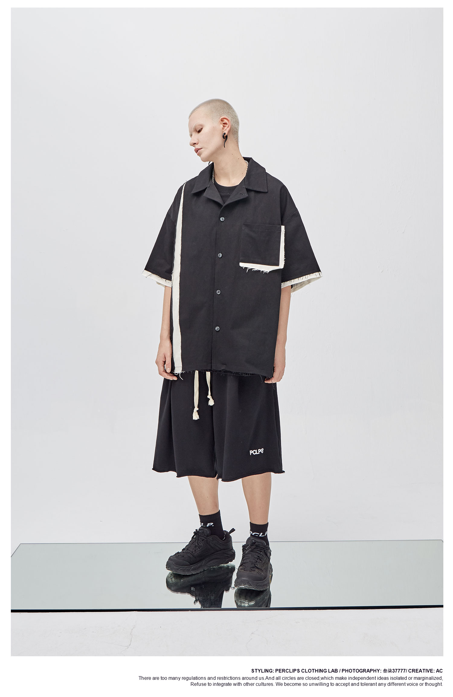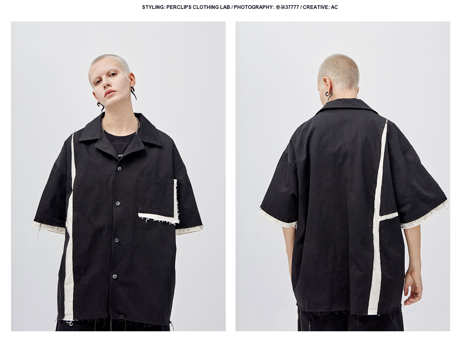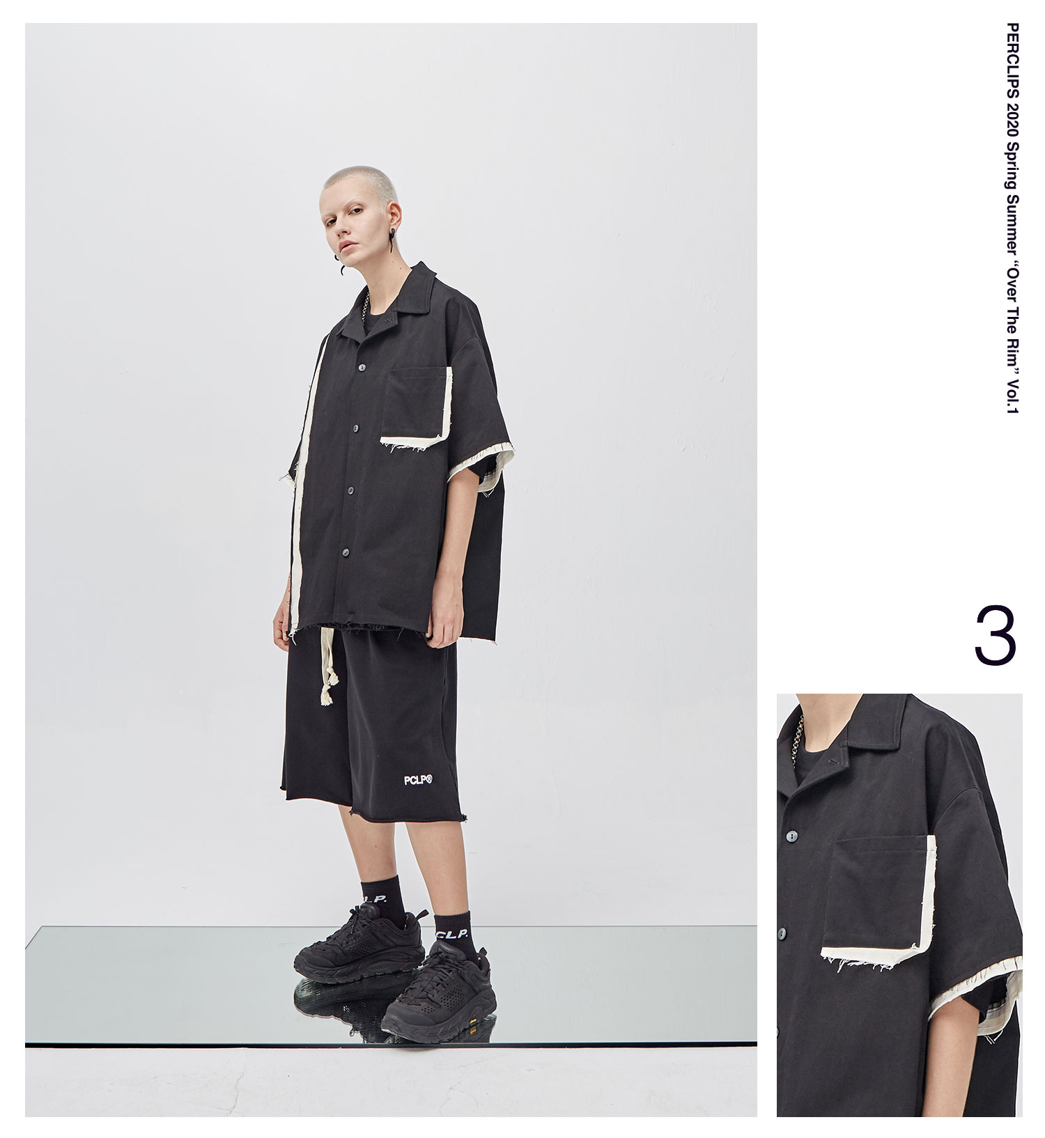PCLP(PERCLIPS) 拼接短袖衬衫 毛边破坏潮流解构工装日系半袖衬衣