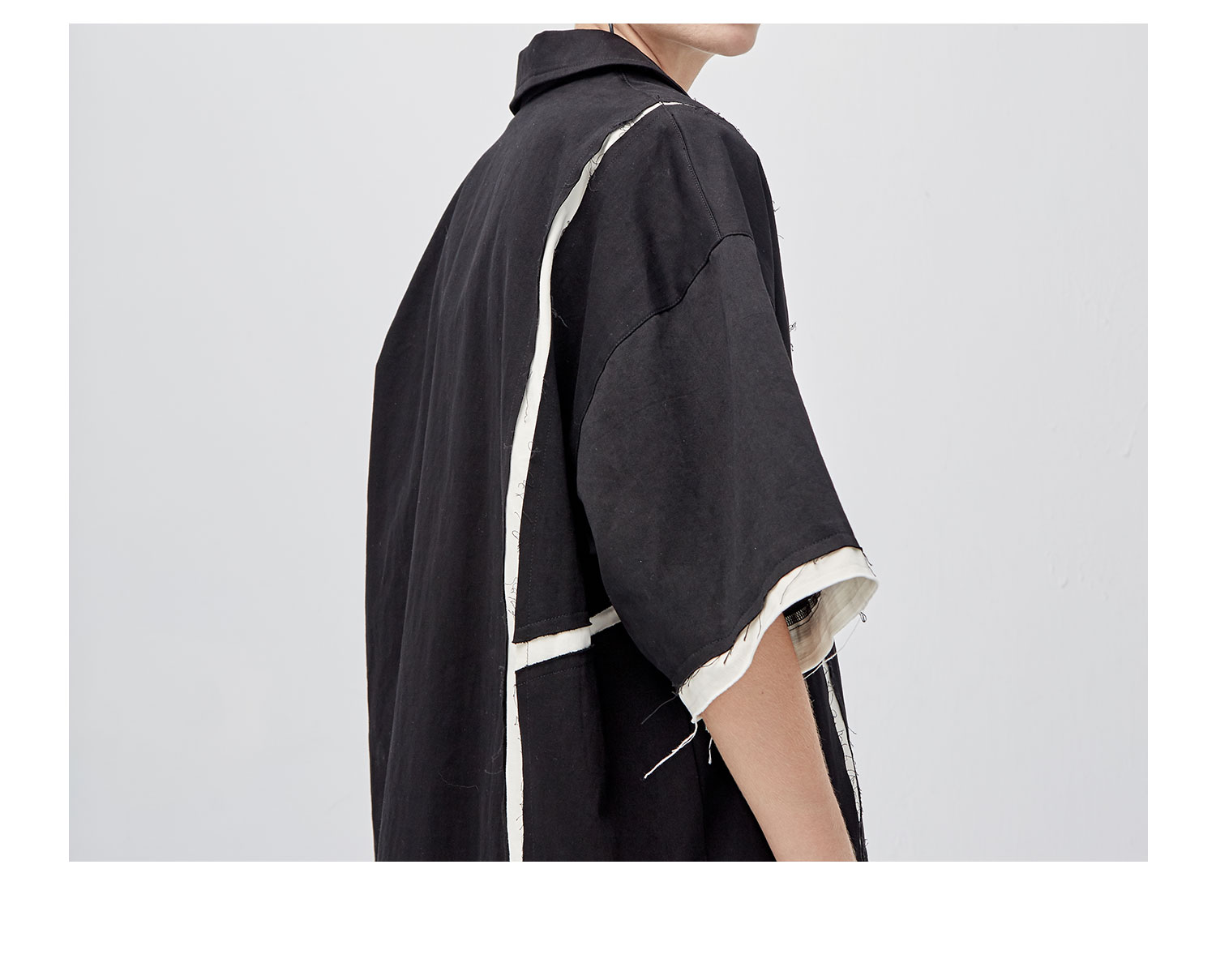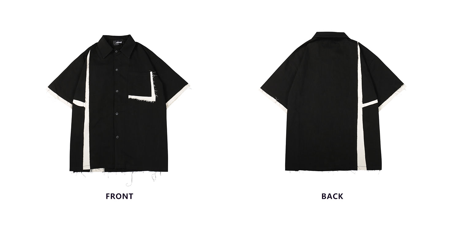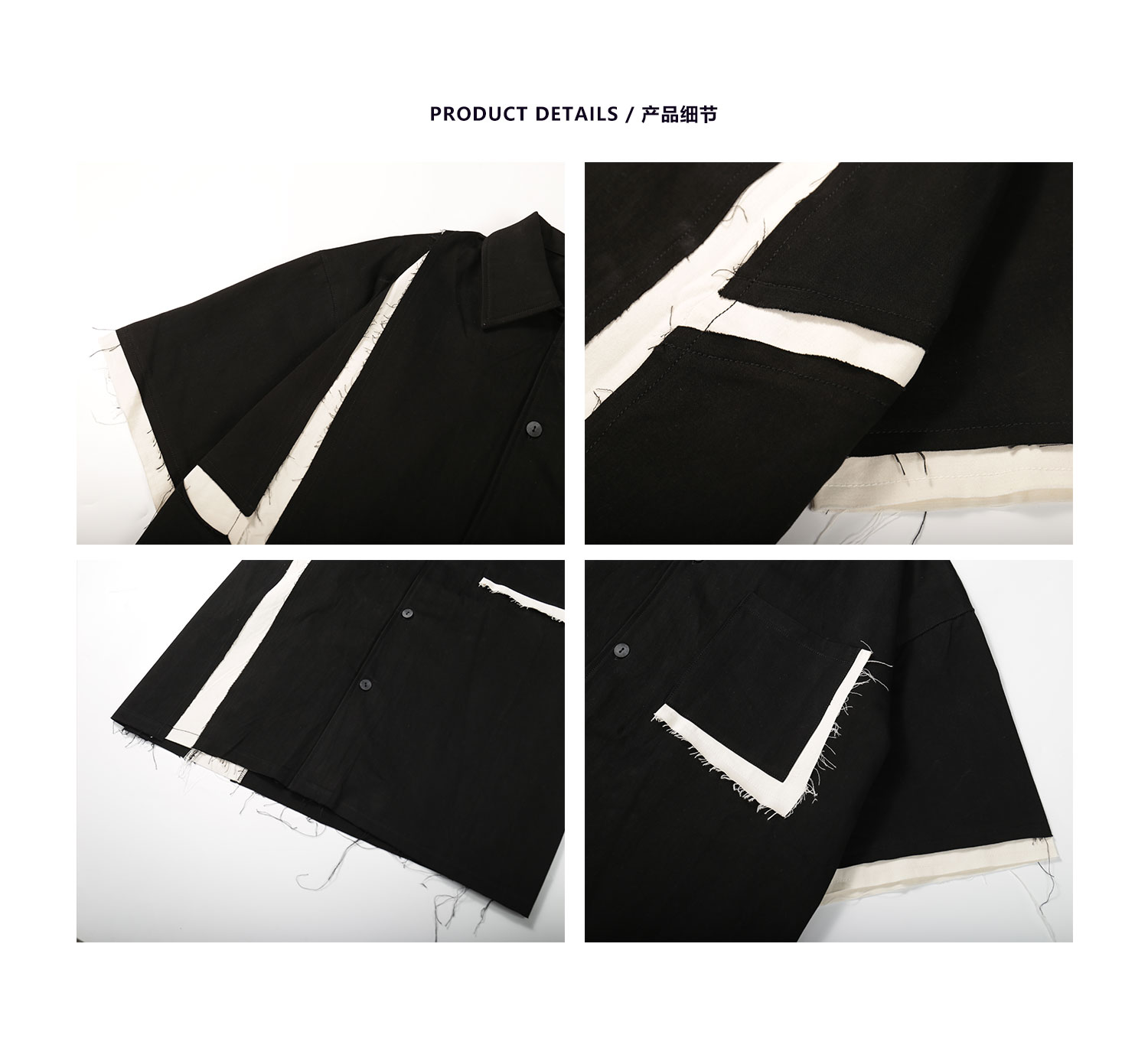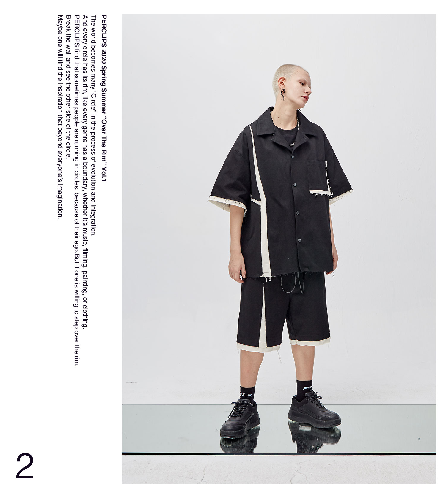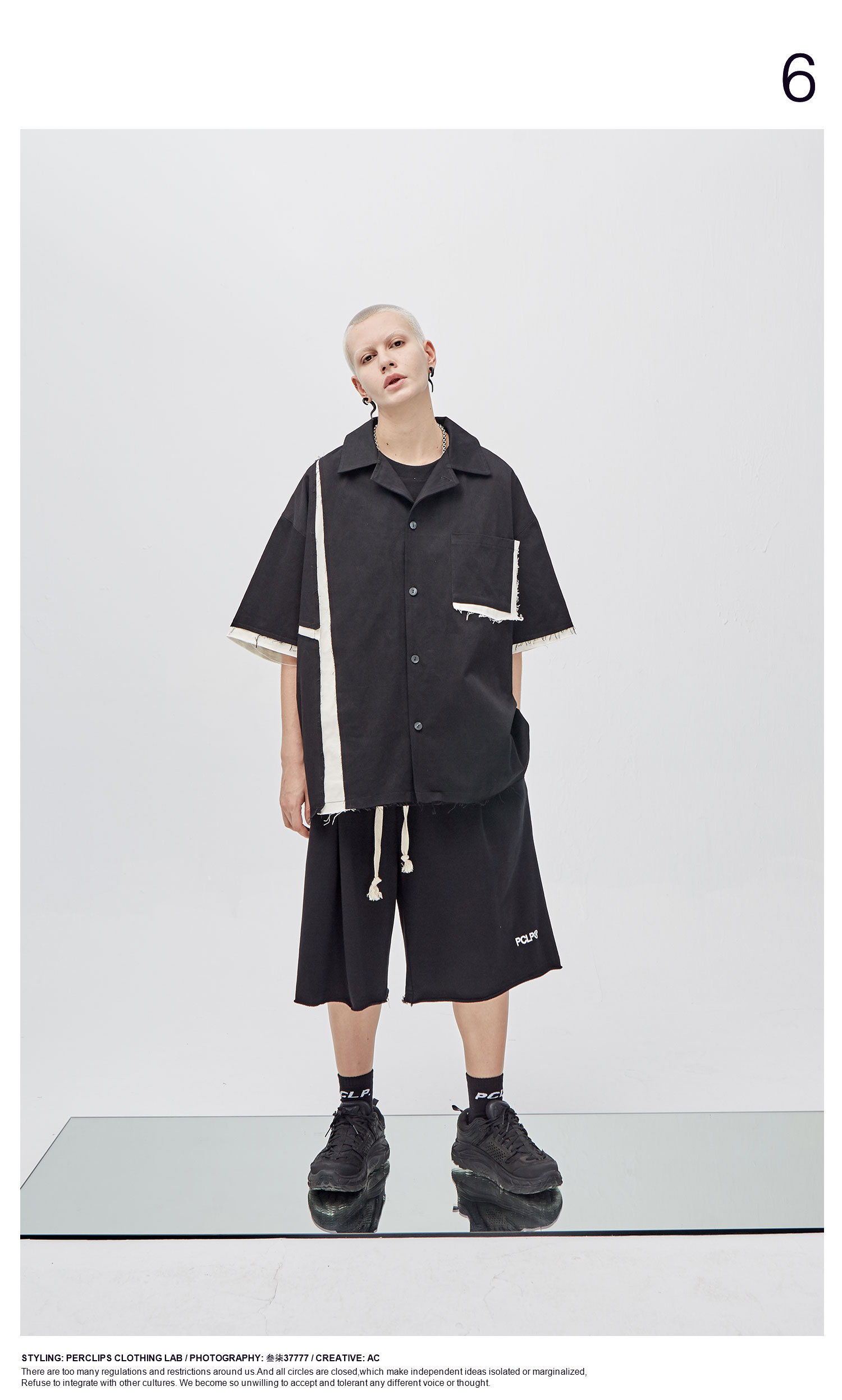 PCLP(PERCLIPS) 拼接短袖衬衫 毛边破坏潮流解构工装日系半袖衬衣