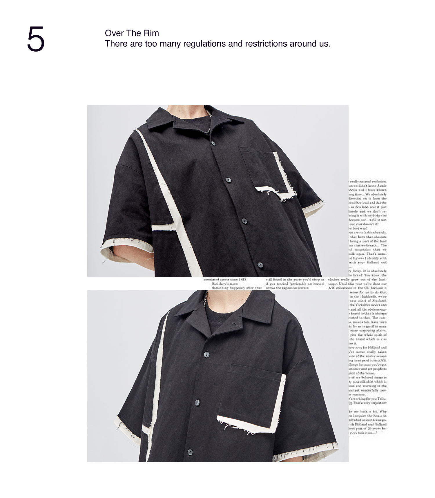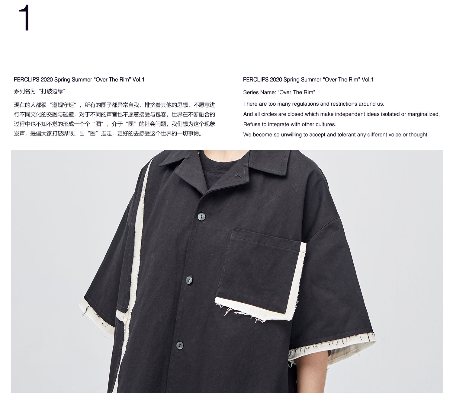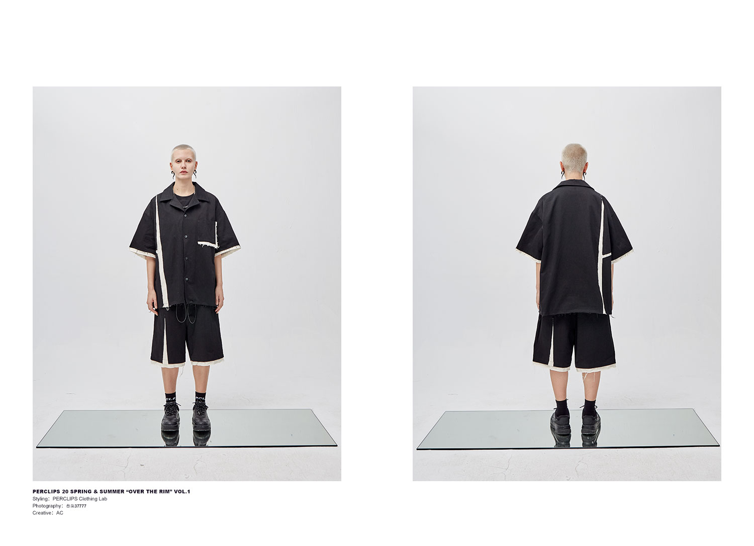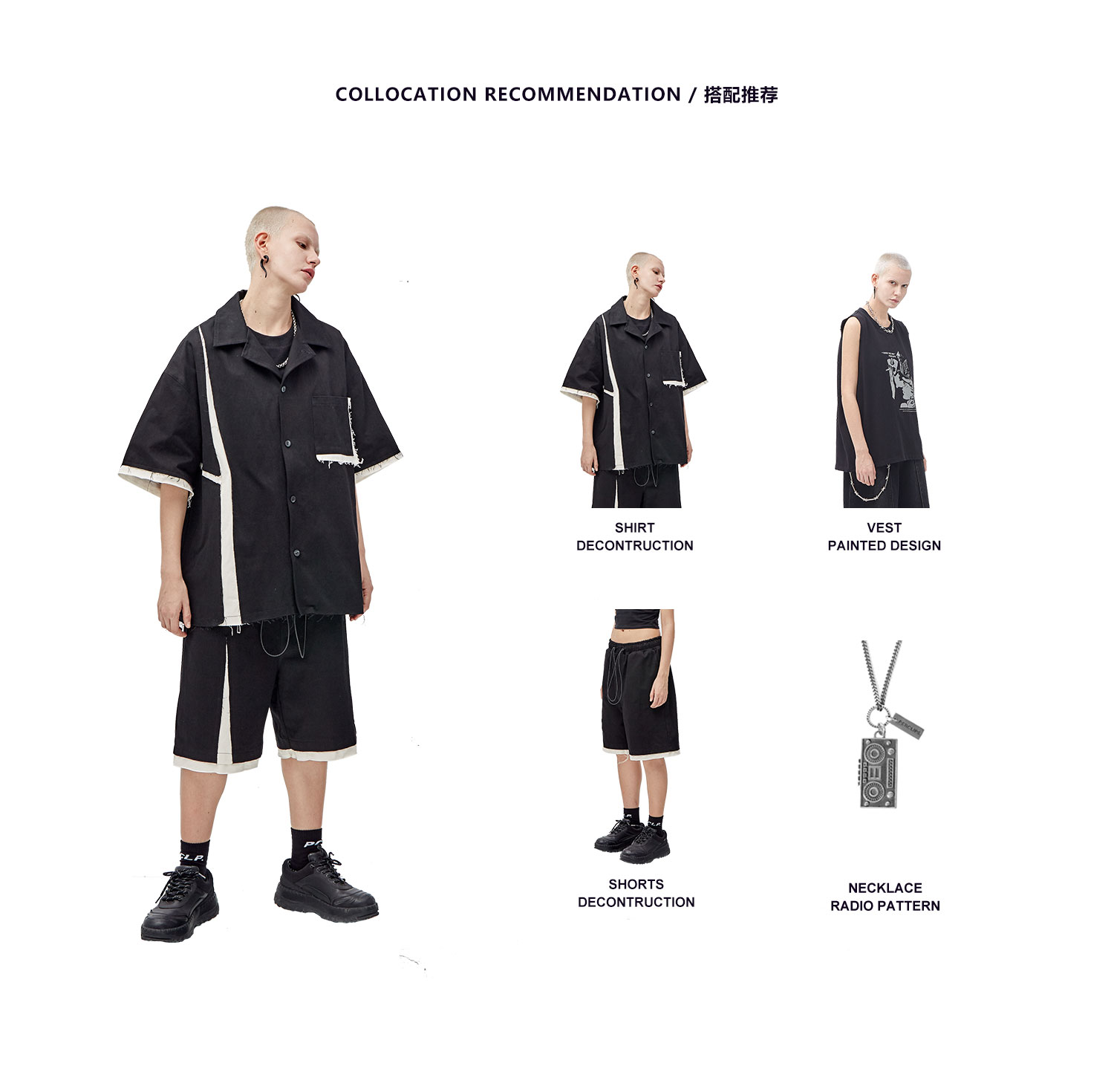 PCLP(PERCLIPS) 拼接短袖衬衫 毛边破坏潮流解构工装日系半袖衬衣