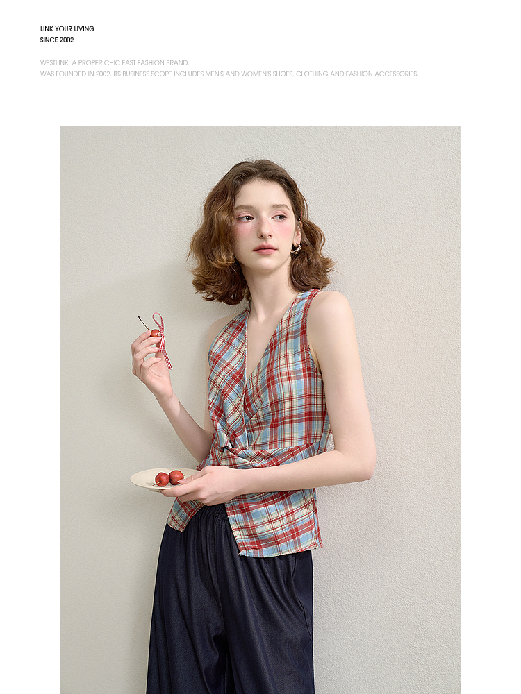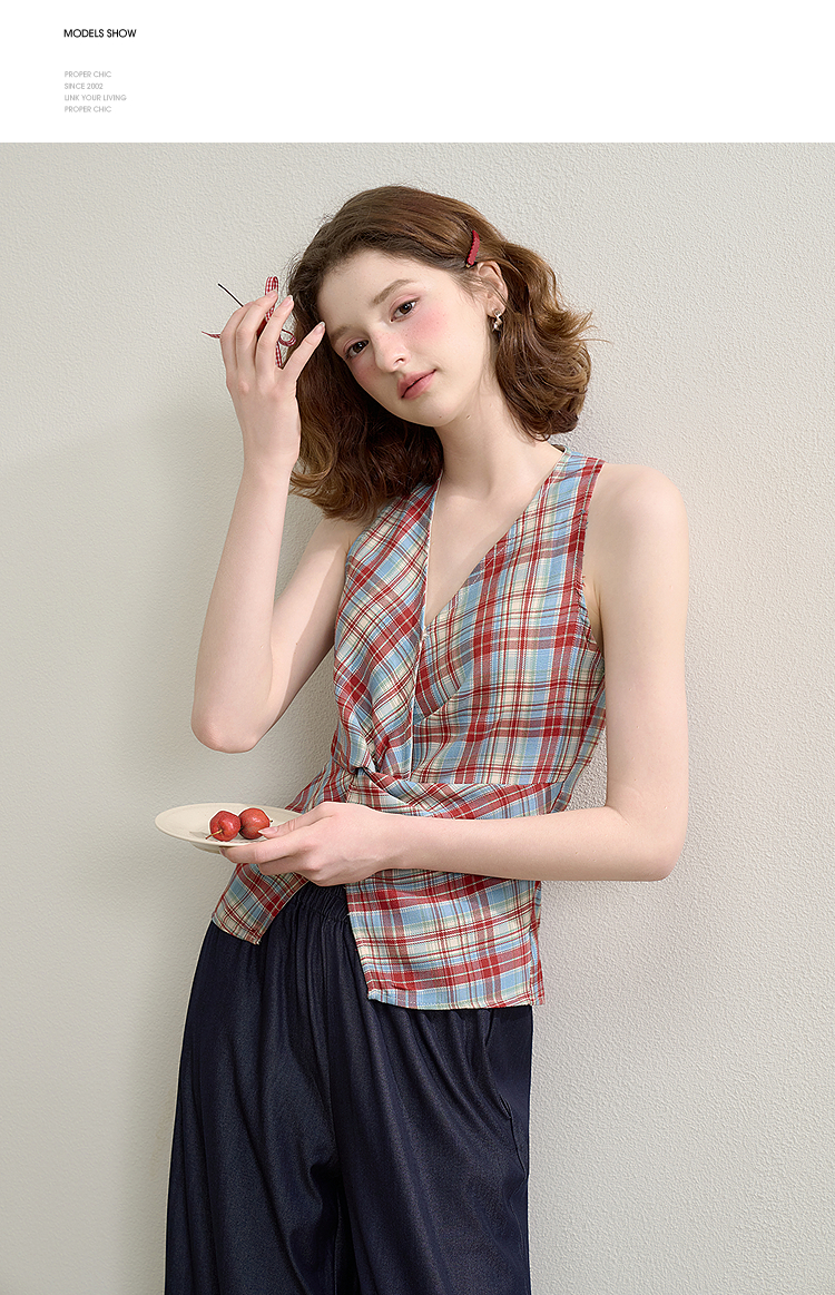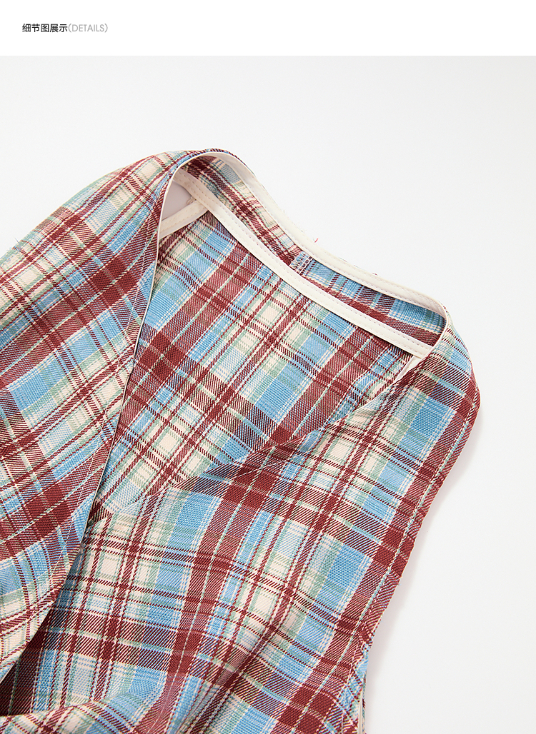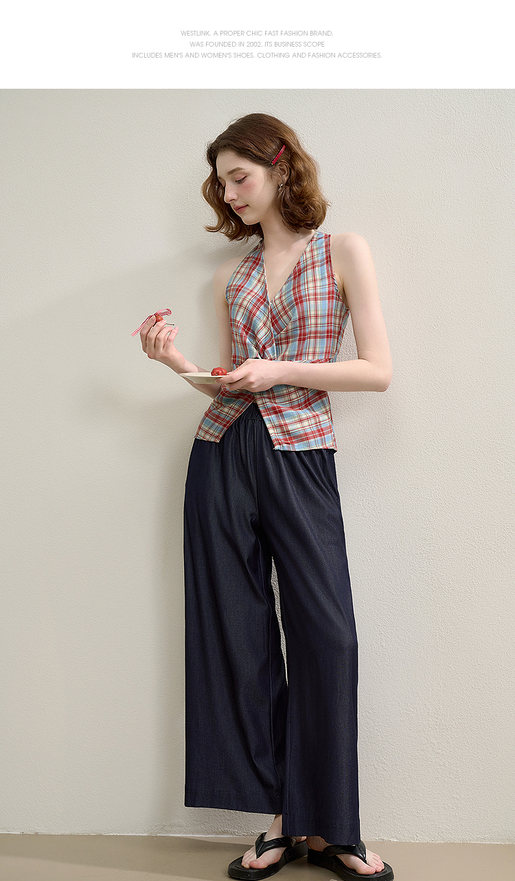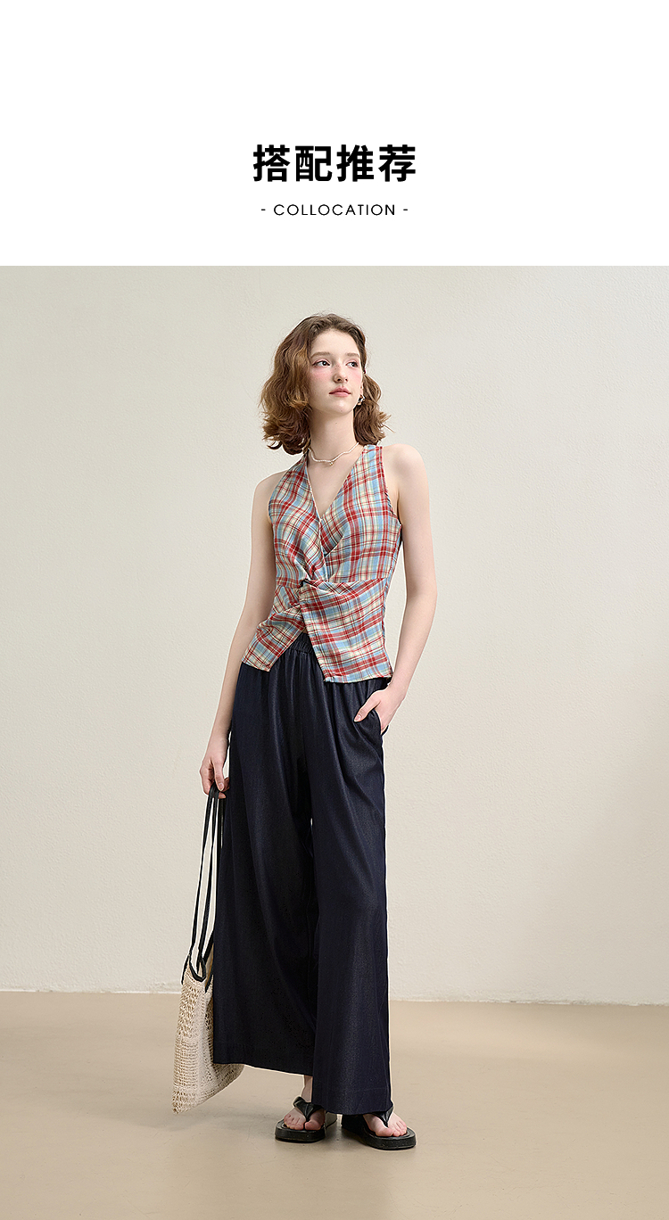 西遇垂感阔腿裤套装女夏季新款格子无袖挂脖短款上衣两件套H0051029
