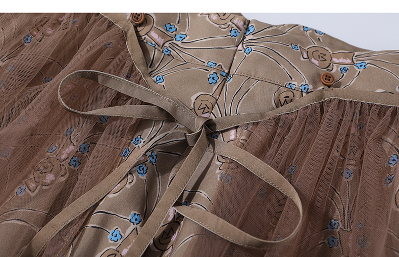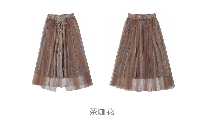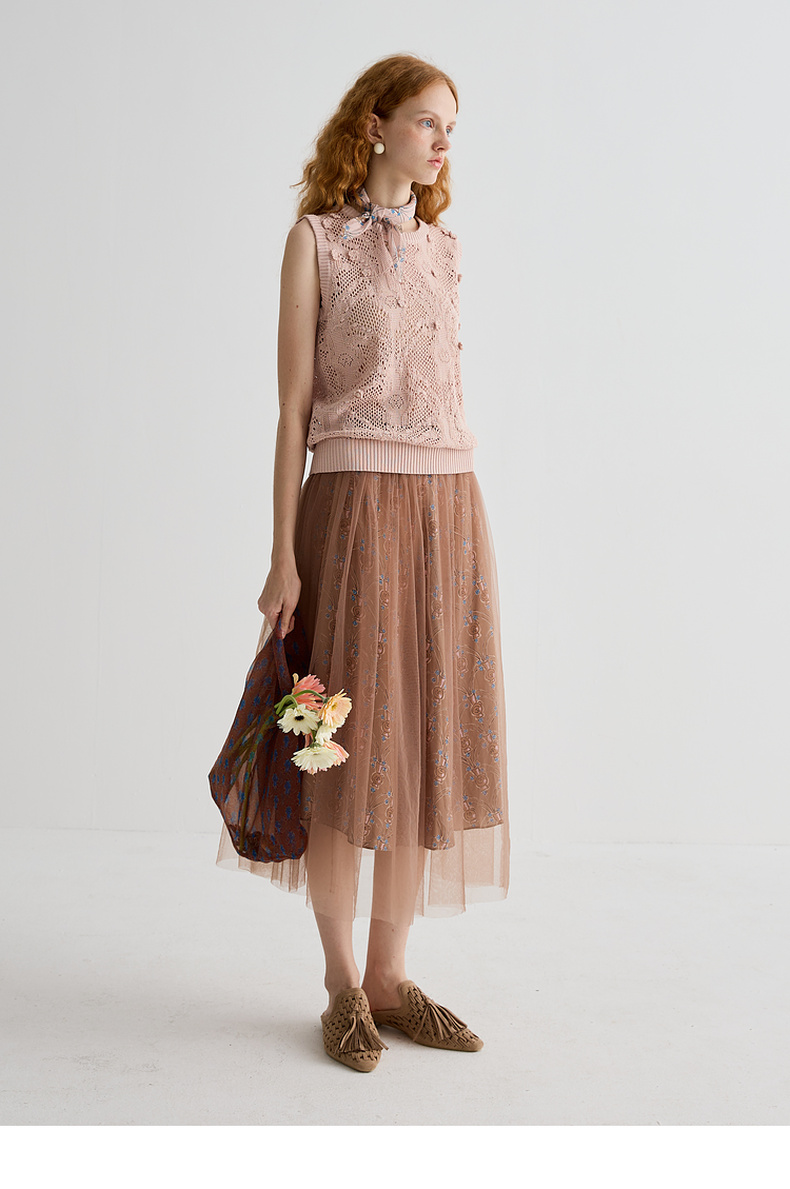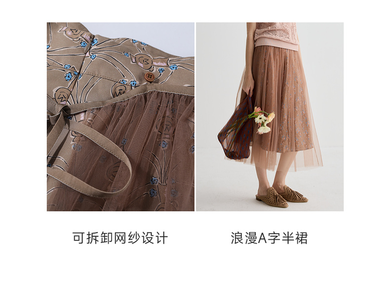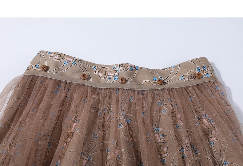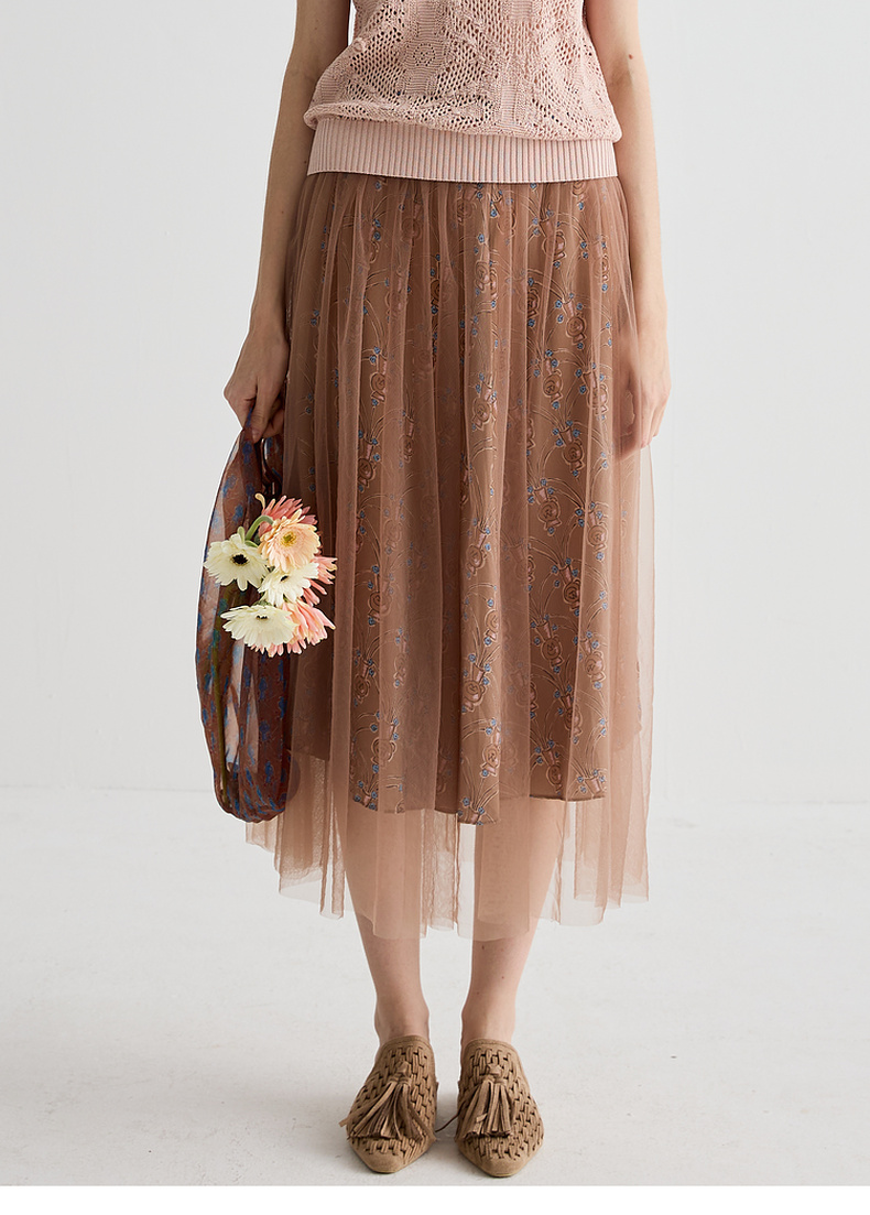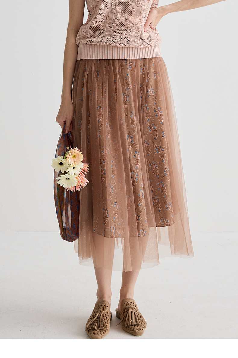 谜底半身裙女2025夏季新品度假网纱印花宽松A型中长半裙252MB0603