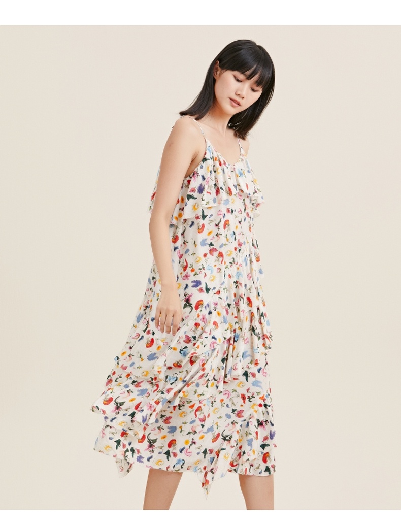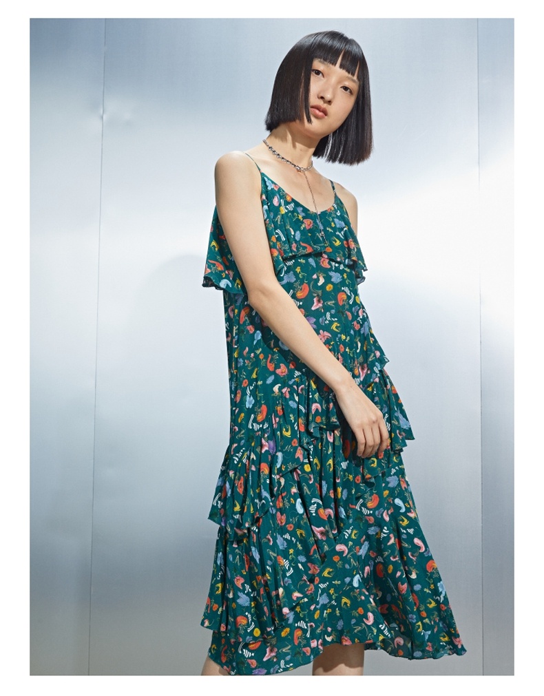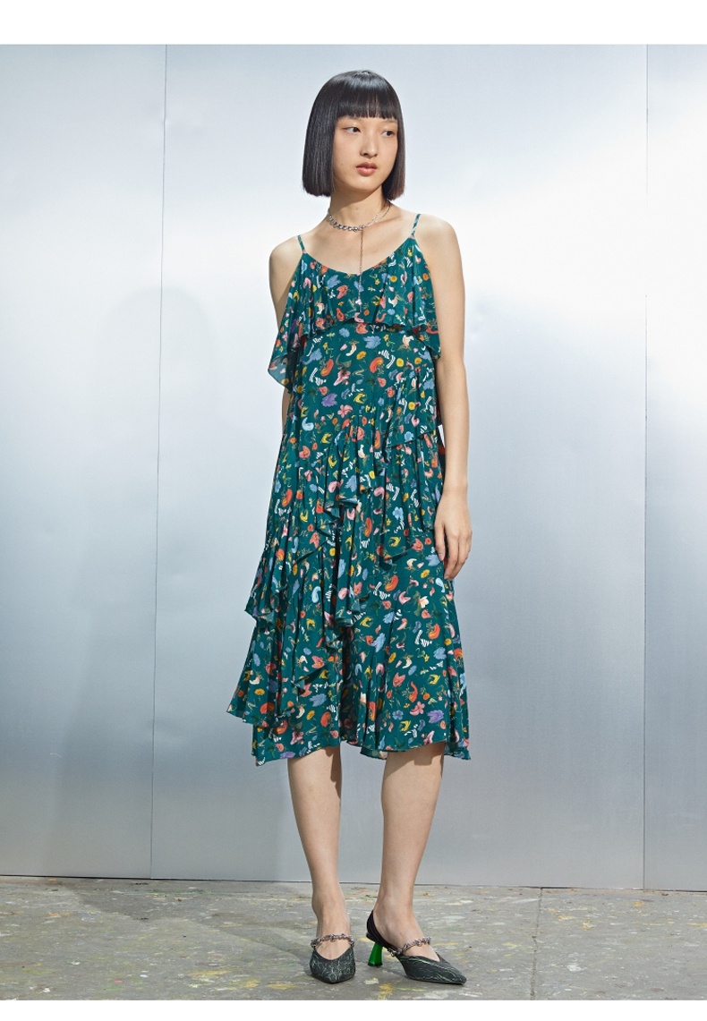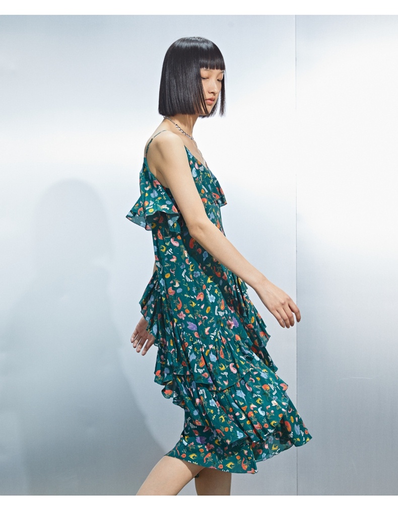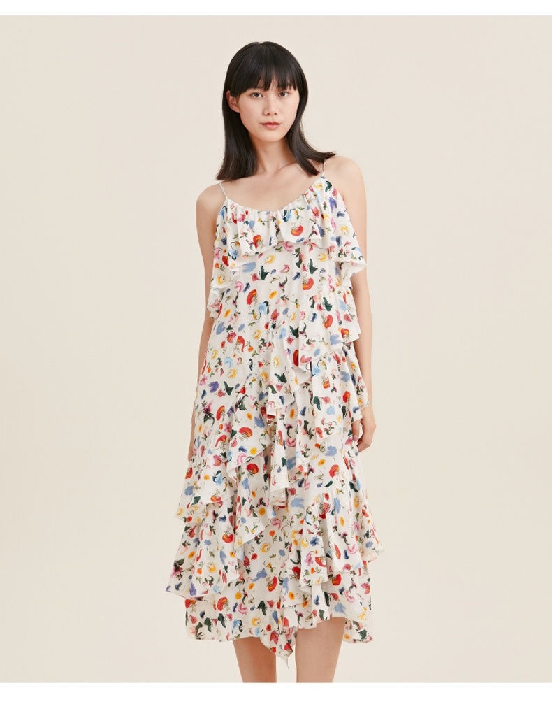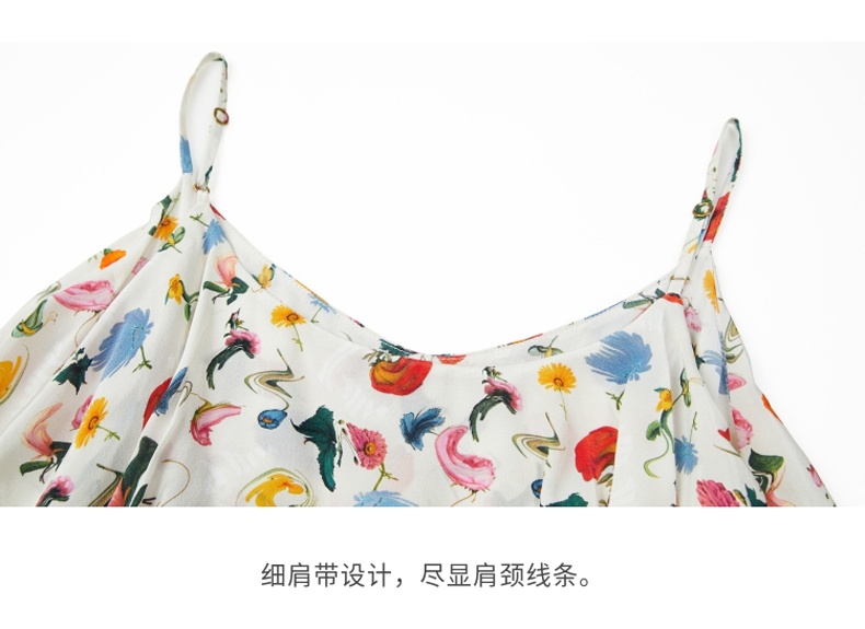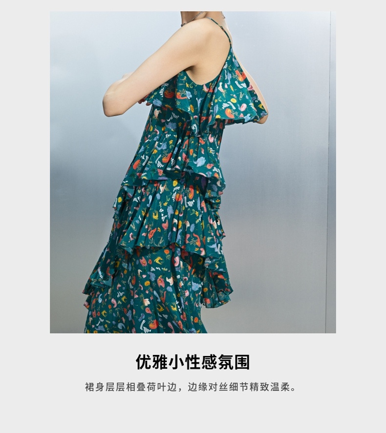 MIIDII/谜底真丝连衣裙21夏荷叶边小碎花桑蚕丝吊带裙212ML0984