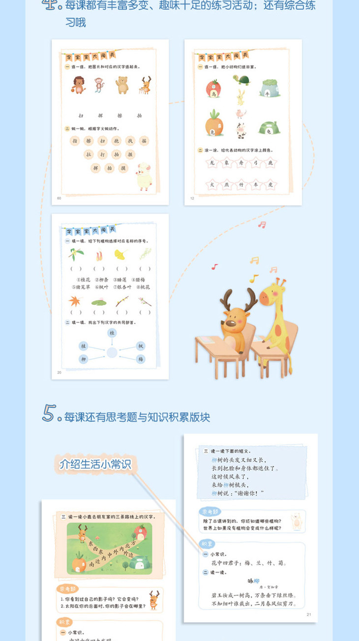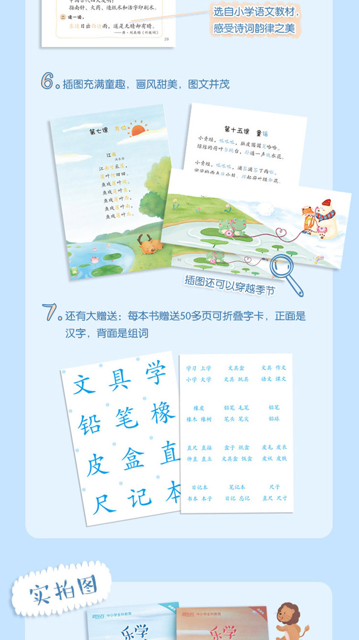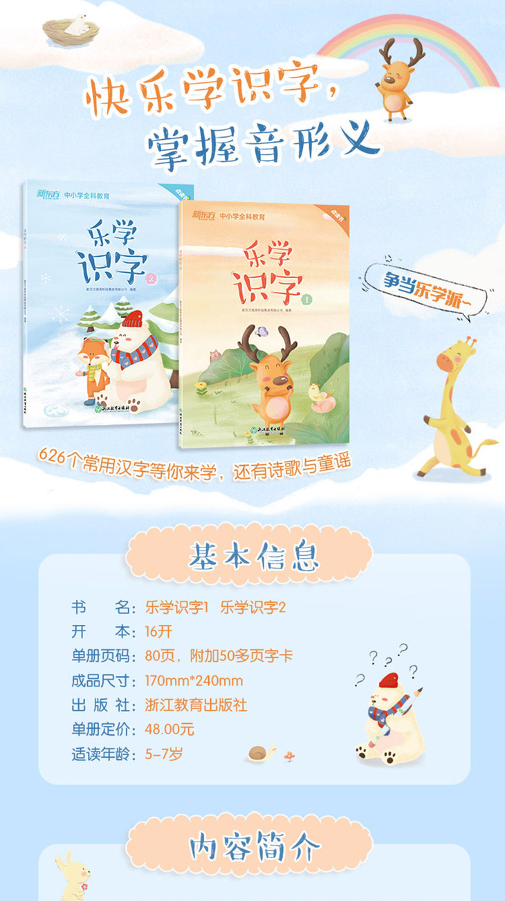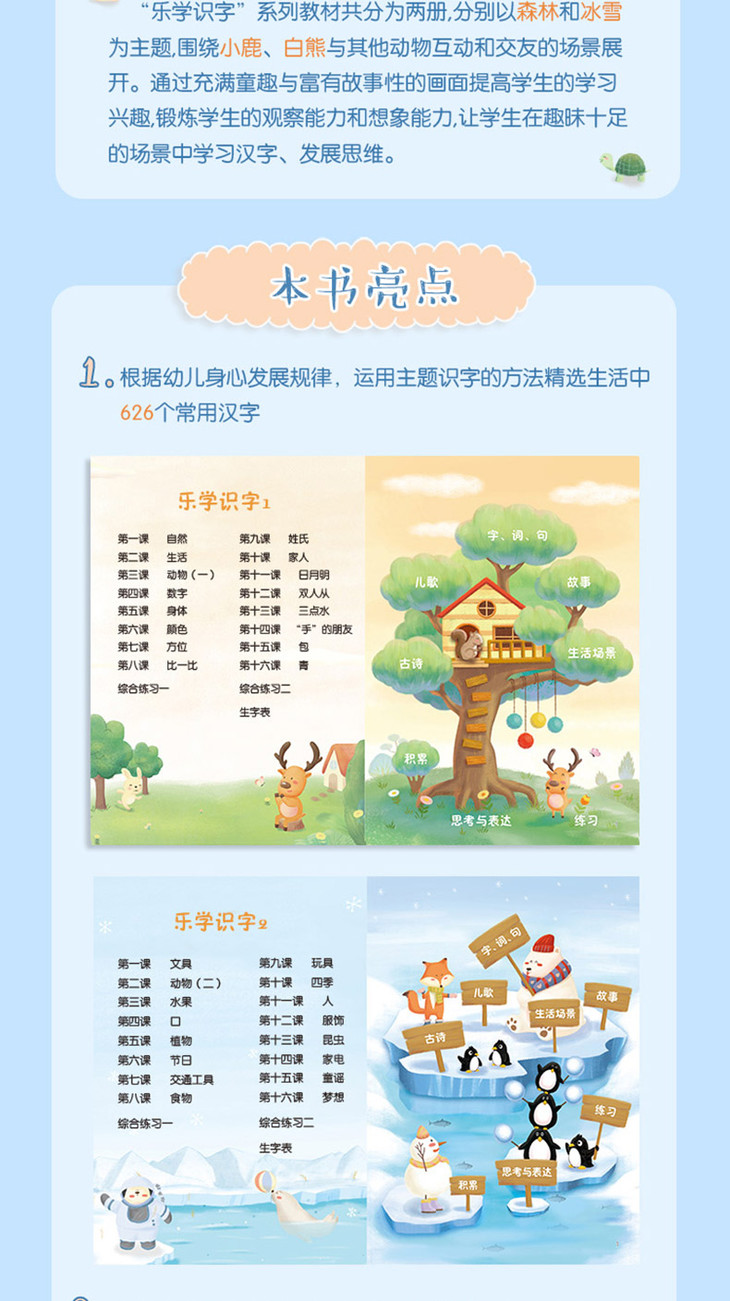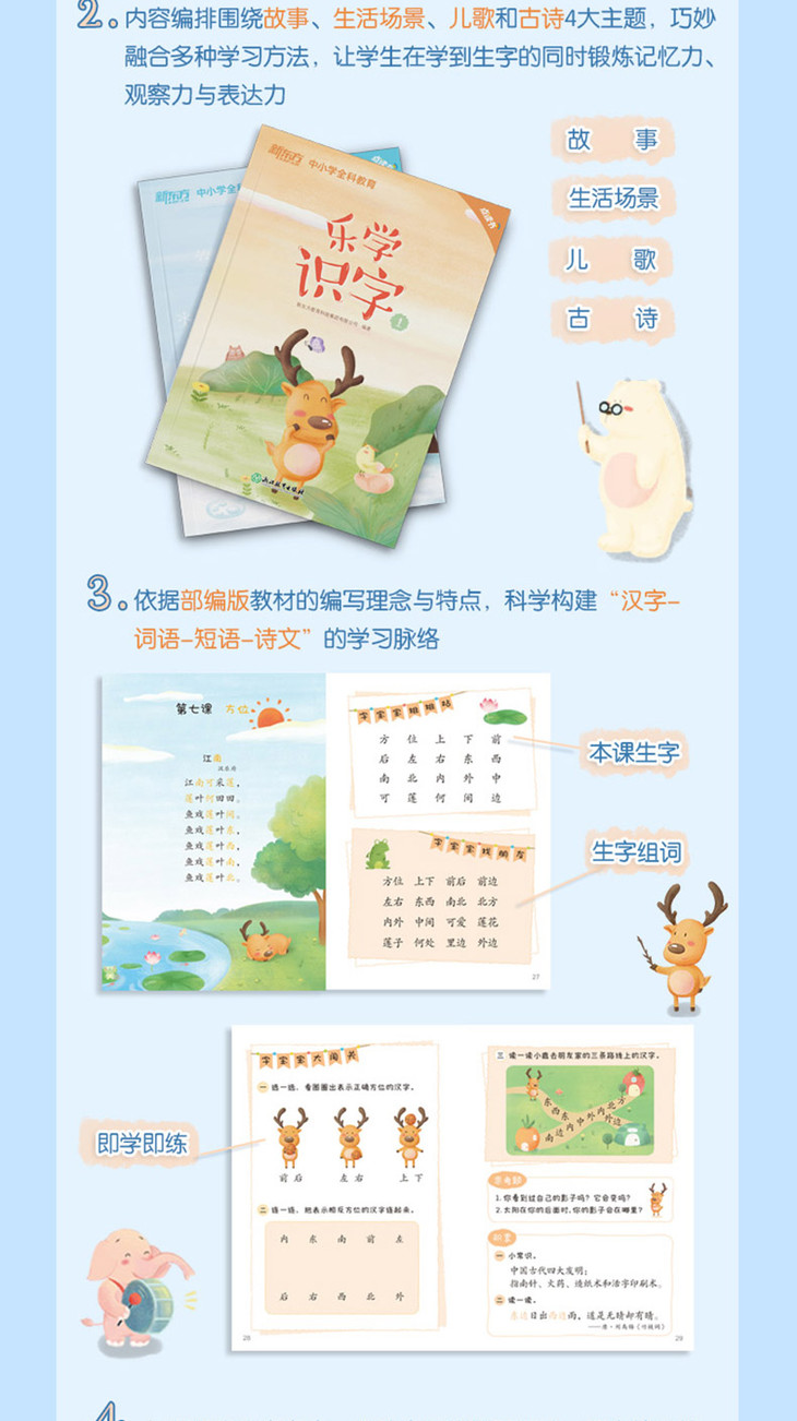 4.包含故事、生活场景、儿歌、古诗等主题,巧妙融合了联想、对比、归纳等学习方法,力求通过多重感官的综合训练,提升儿童认读与听说能力。