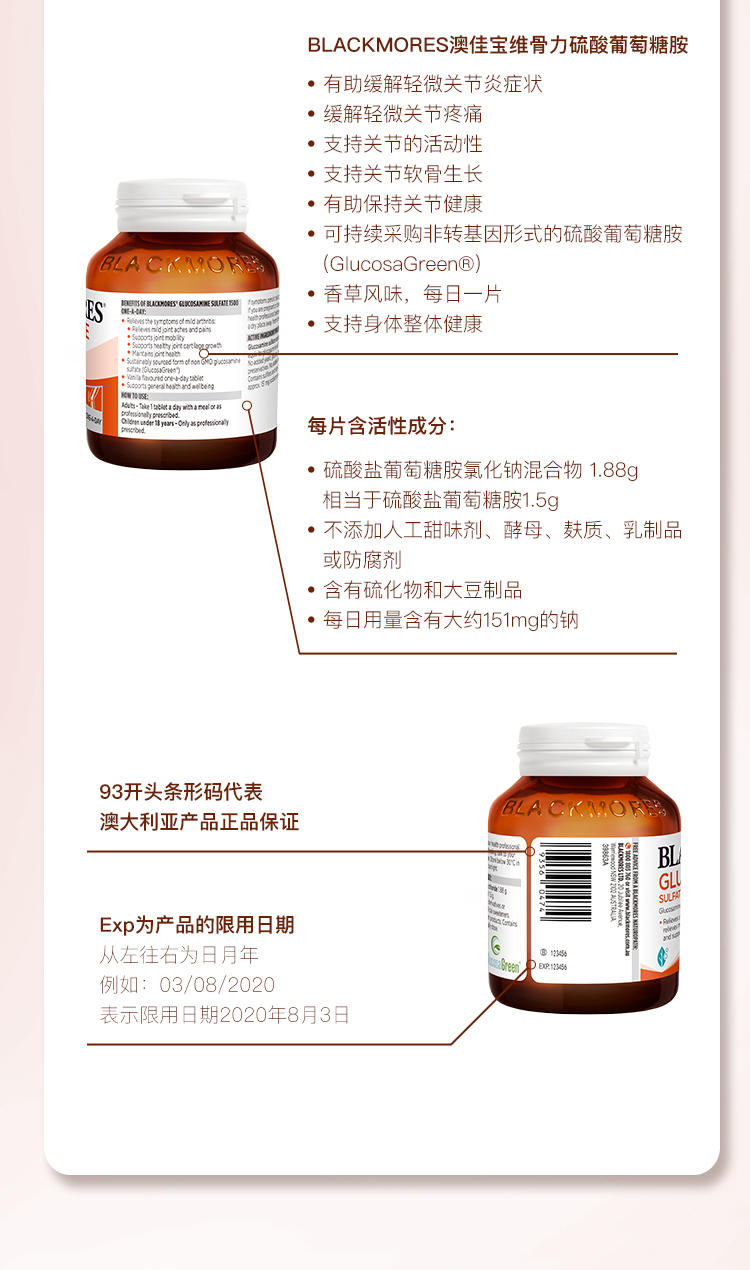 【保税仓】Blackmores澳佳宝硫酸氨基葡萄tang片1500mg40片/瓶