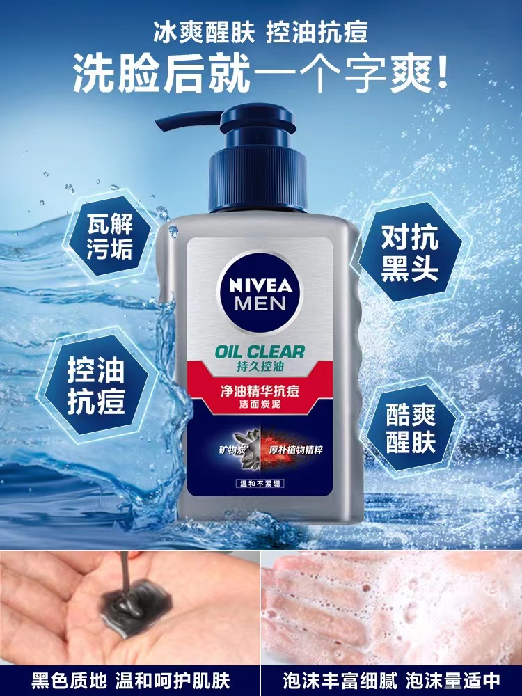 妮维雅男士净油精华抗痘洁面炭泥150ml
