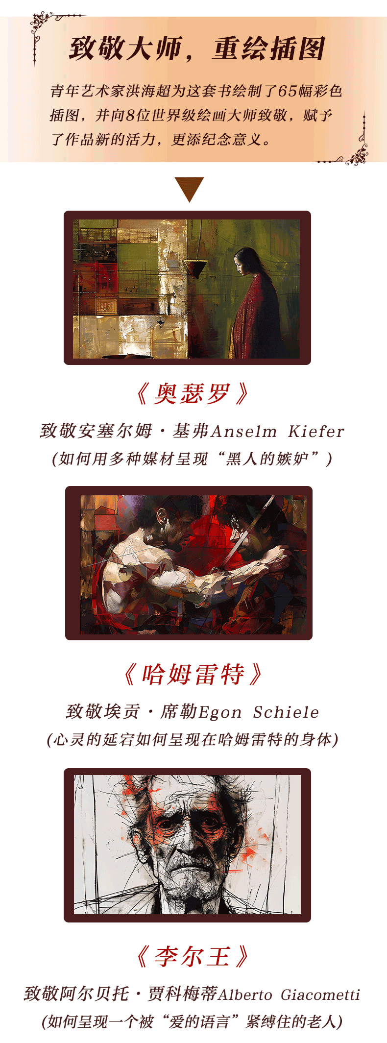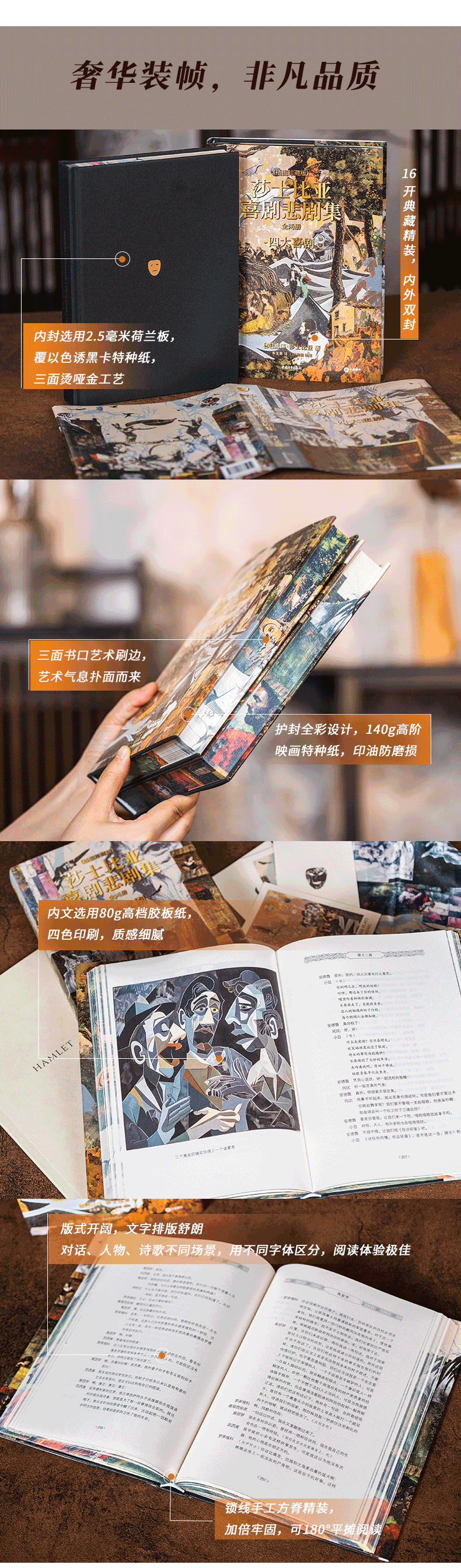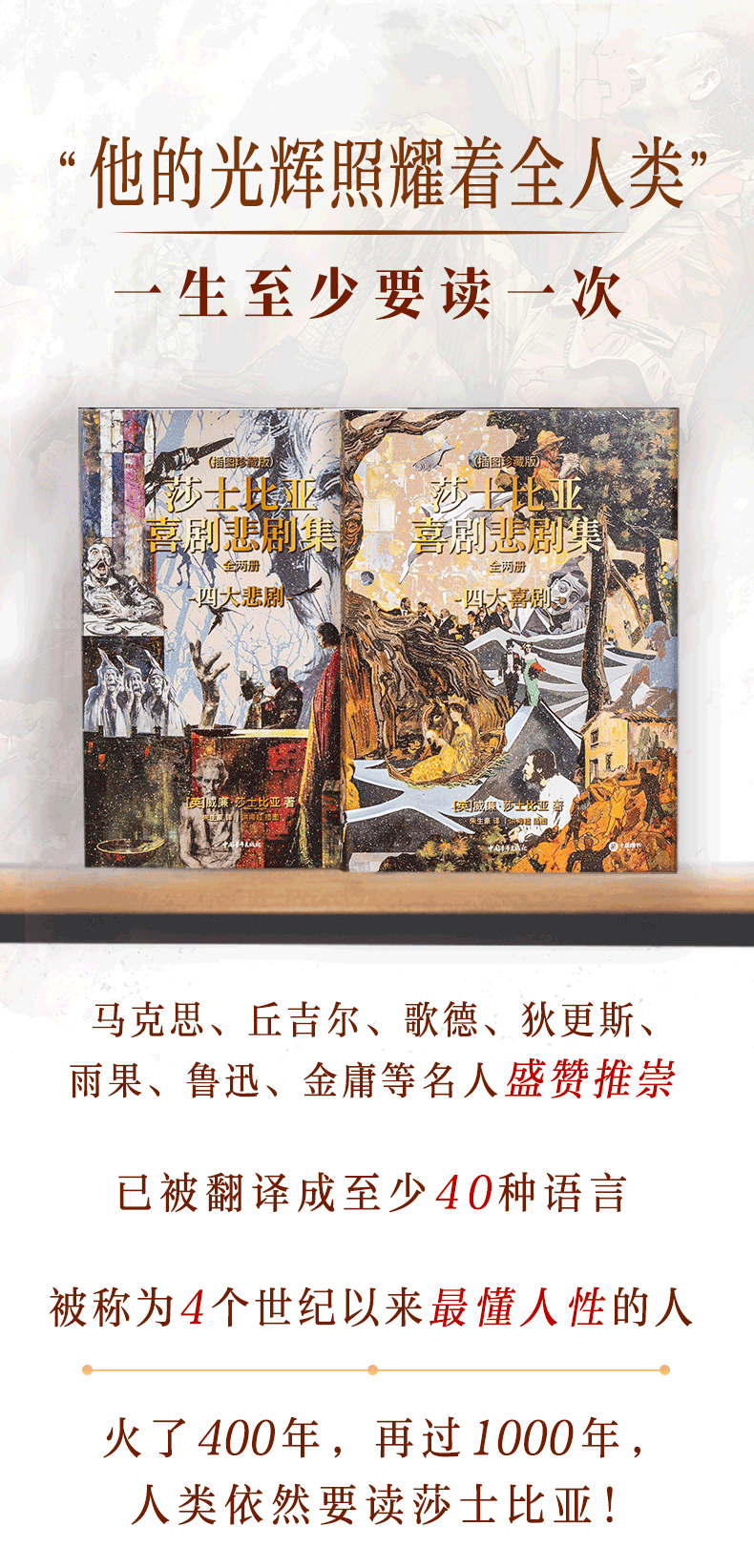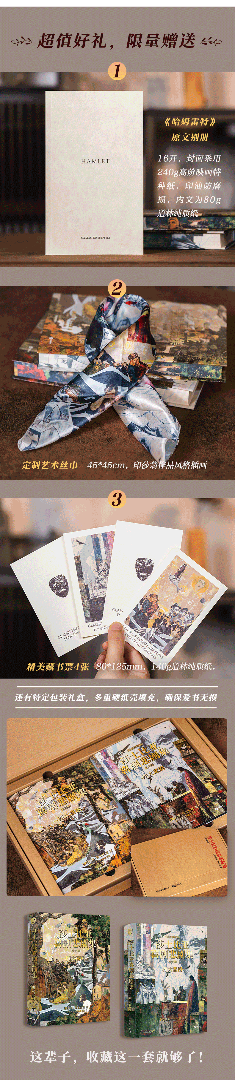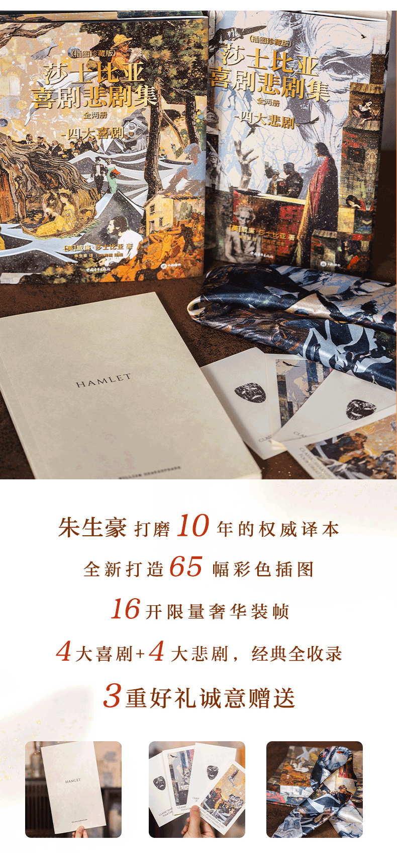莎士比亚喜剧悲剧集 | 权威译本+65幅精美彩插+超值赠品:一套两本,大十六开本,四色全彩印刷;赠品包含——四张精美藏书票、《哈姆雷特》英文原版别册、定制丝巾
