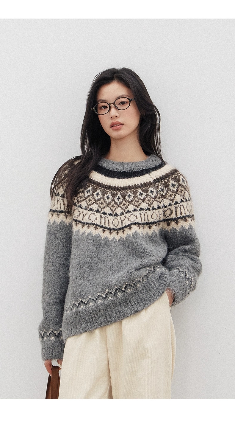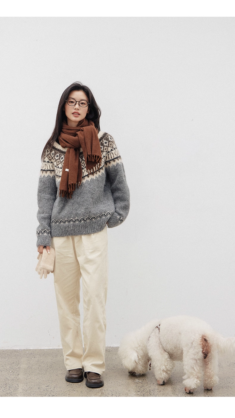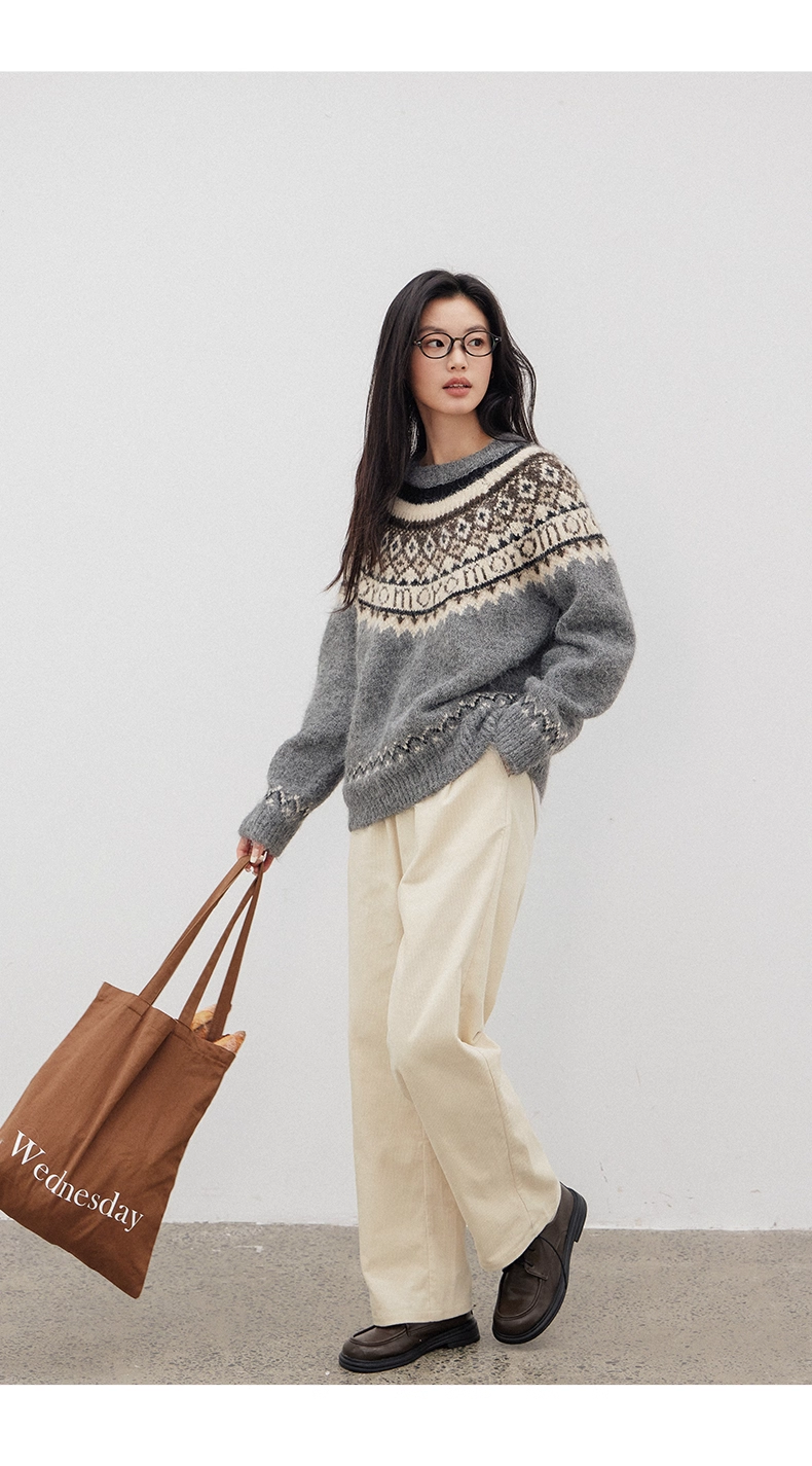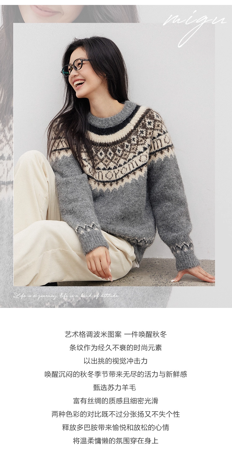 慵懒风复古几何图费尔岛套头针织毛衣J1046:78.0%聚酯纤维 11.8%锦纶 9.4%绵羊毛 0.8%氨纶