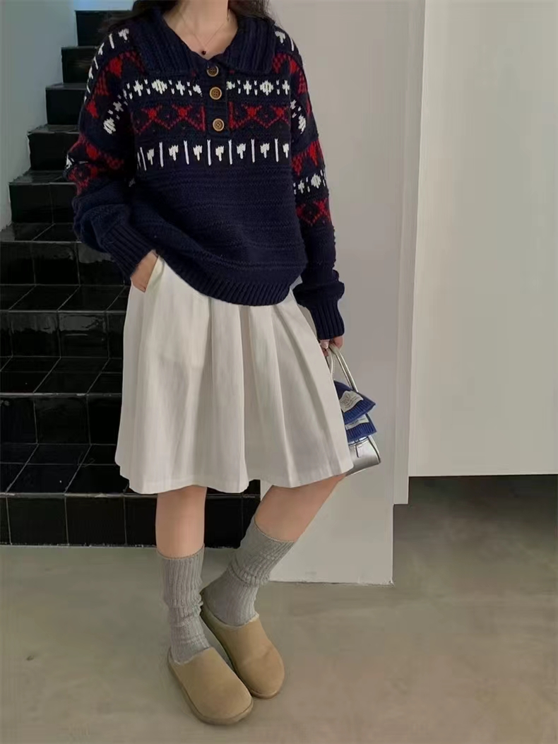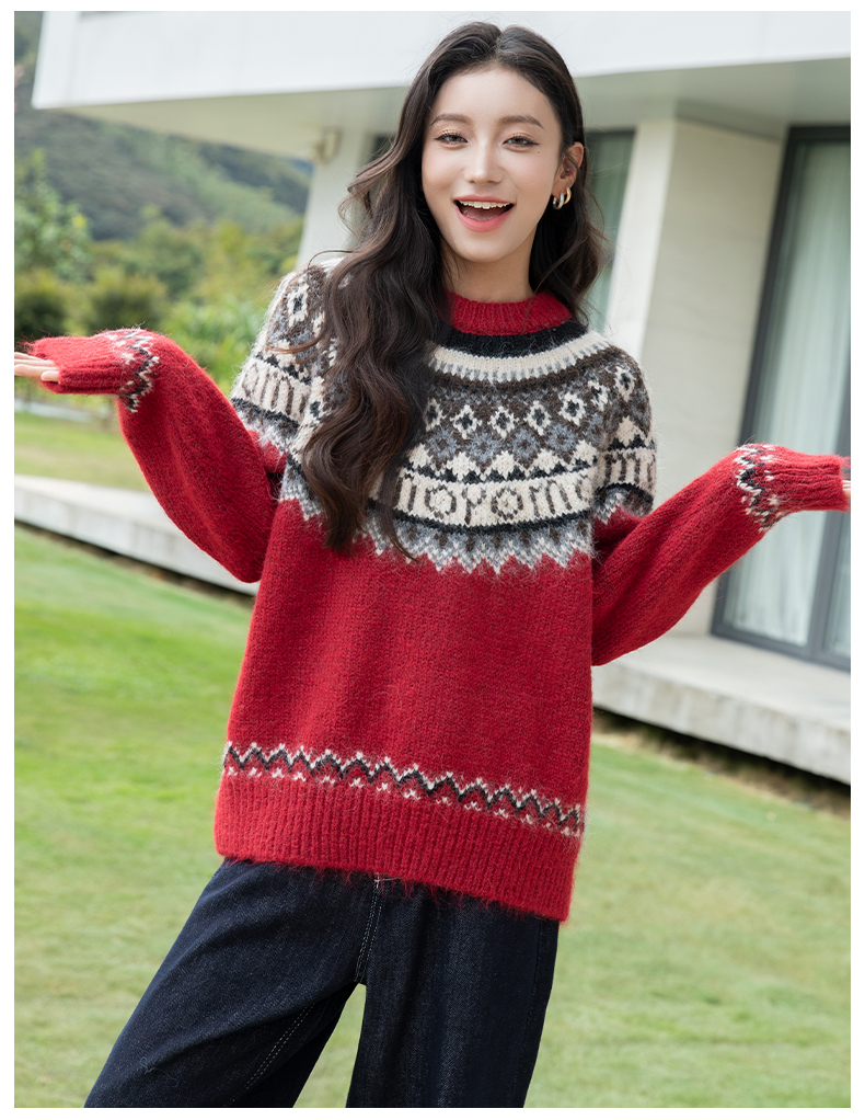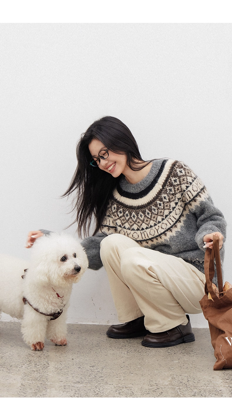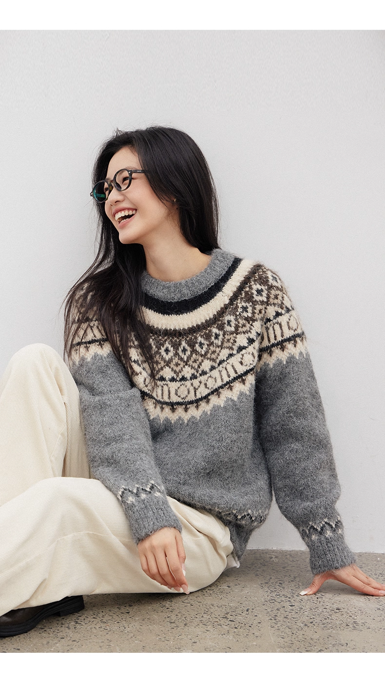 慵懒风复古几何图费尔岛套头针织毛衣J1046:78.0%聚酯纤维 11.8%锦纶 9.4%绵羊毛 0.8%氨纶