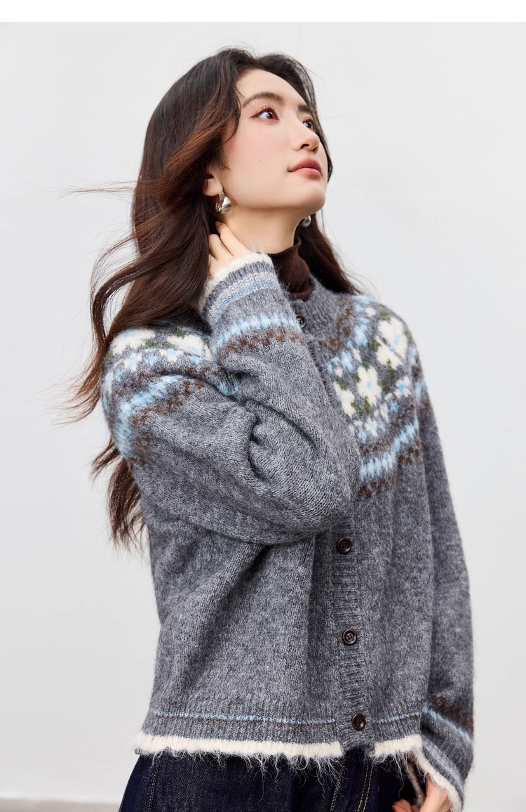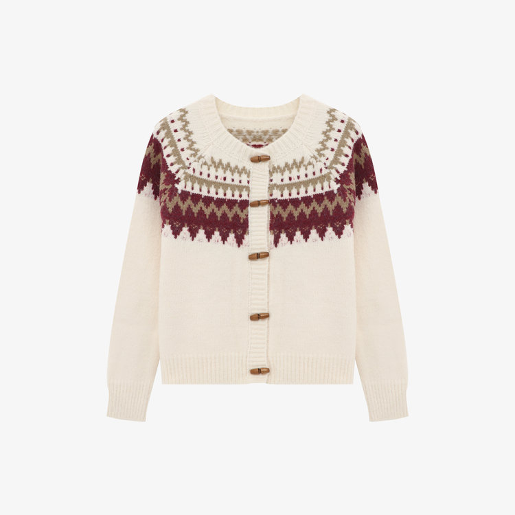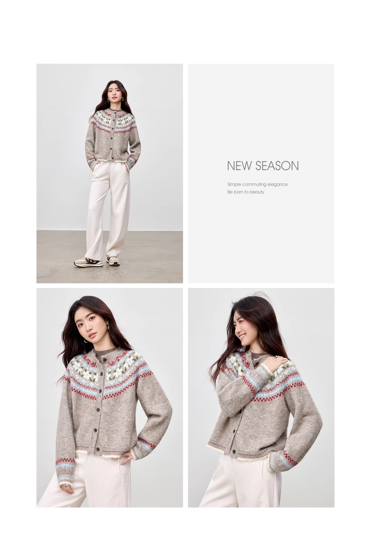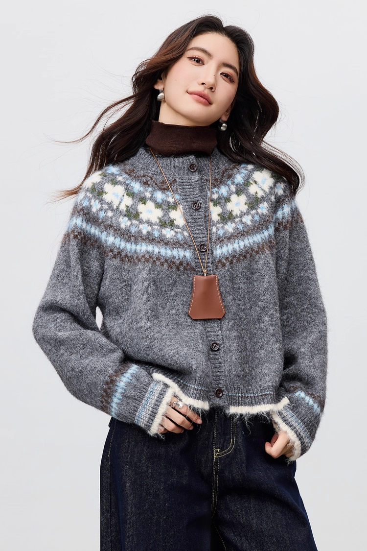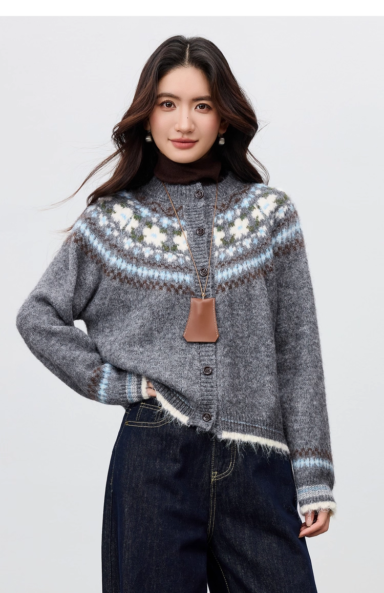 费尔岛茉莉复古花色毛衣开衫N1312:78.0%聚酯纤维 11.8%锦纶 9.4%绵羊毛 0.8%氨纶