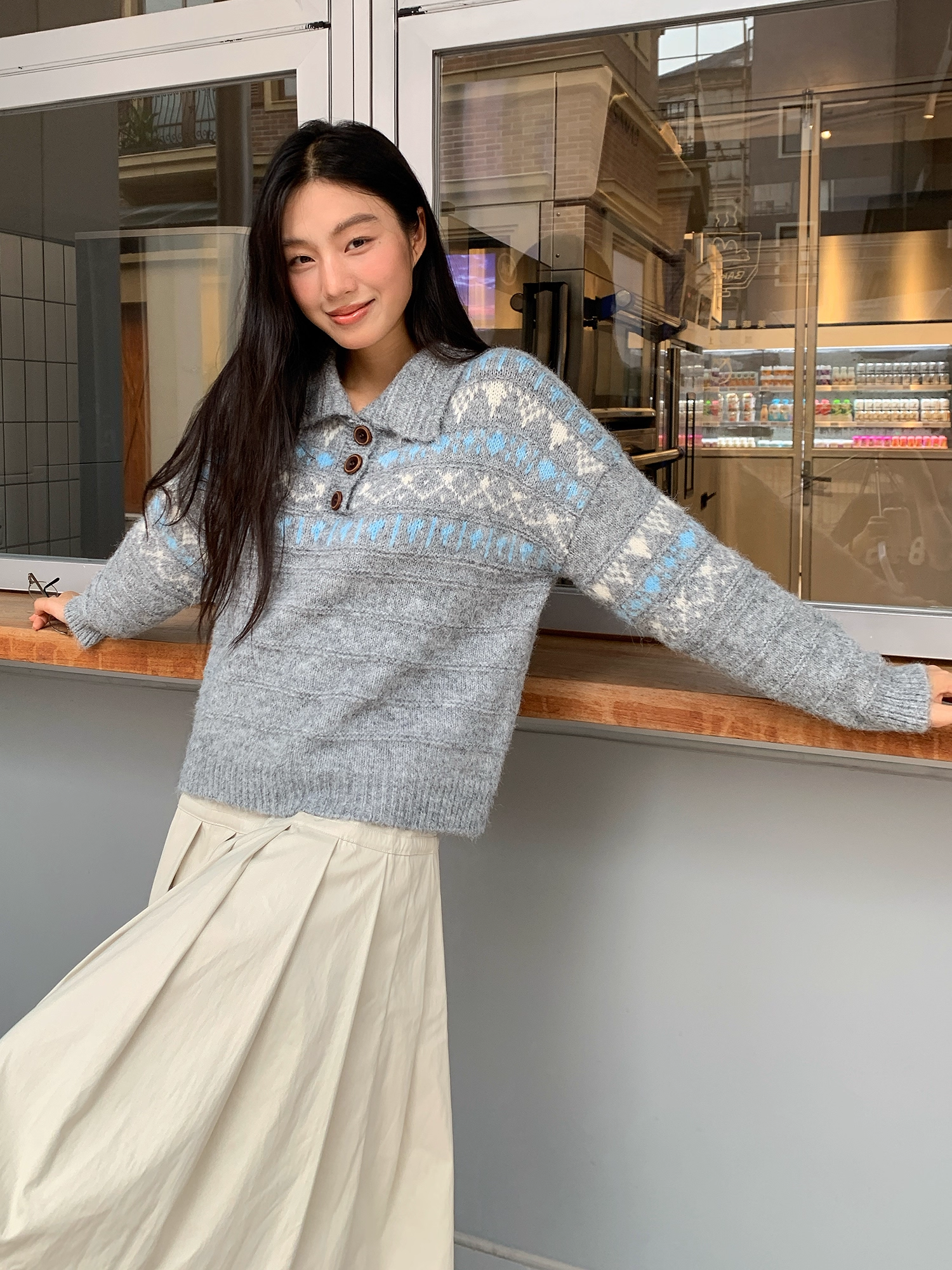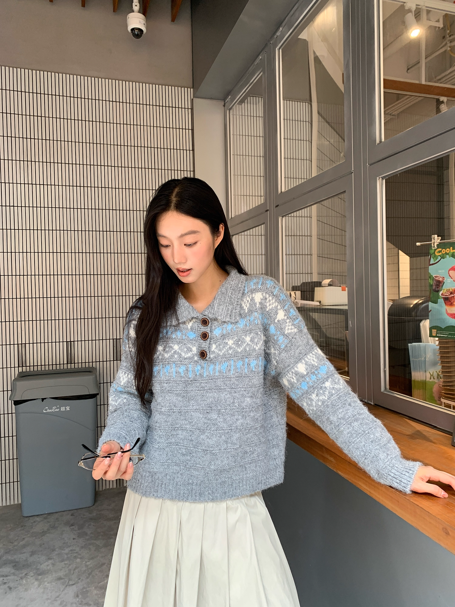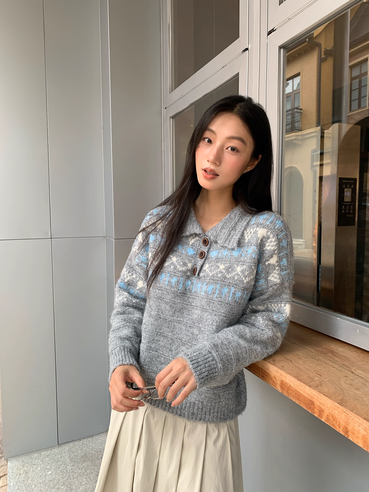 费尔岛提花Polo翻领毛衣外套N1322:78.0%聚酯纤维 11.8%锦纶 9.4%绵羊毛 0.8%氨纶