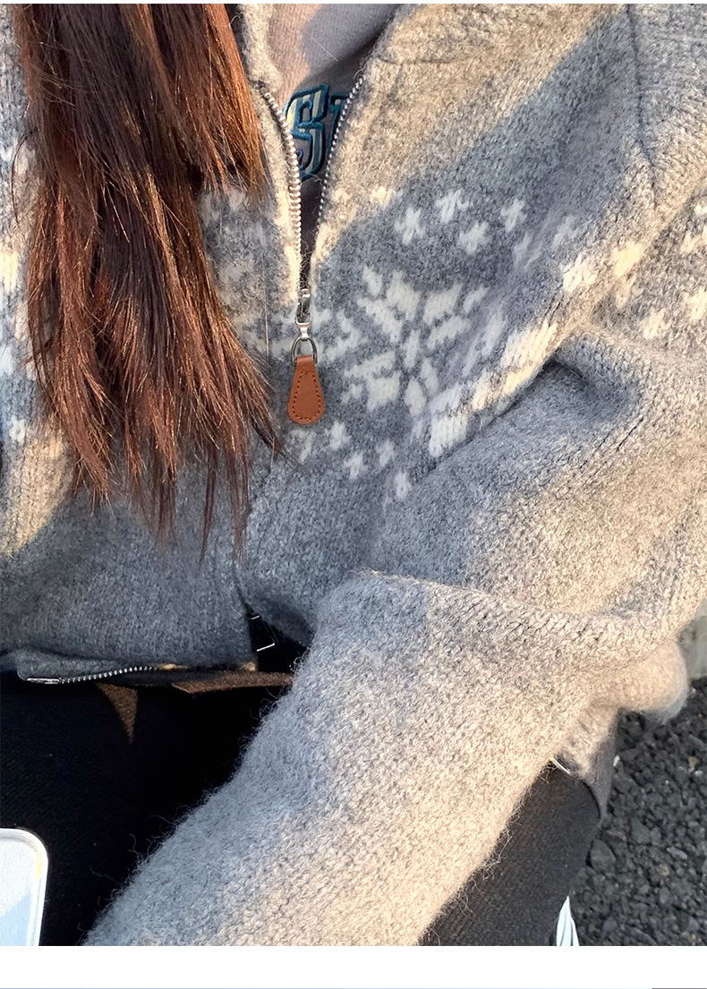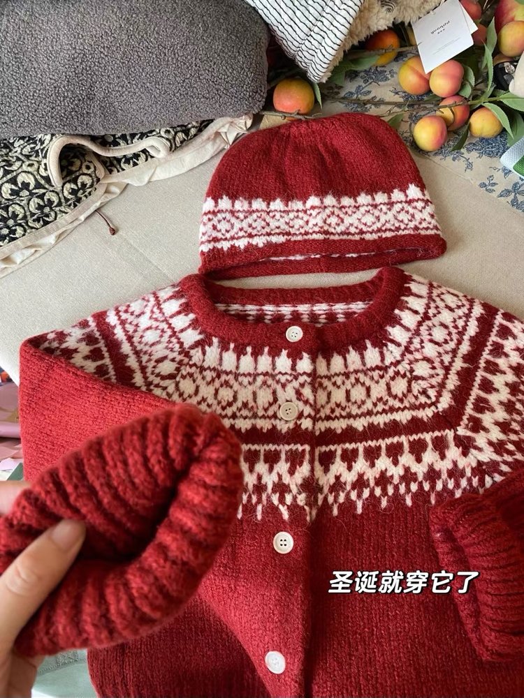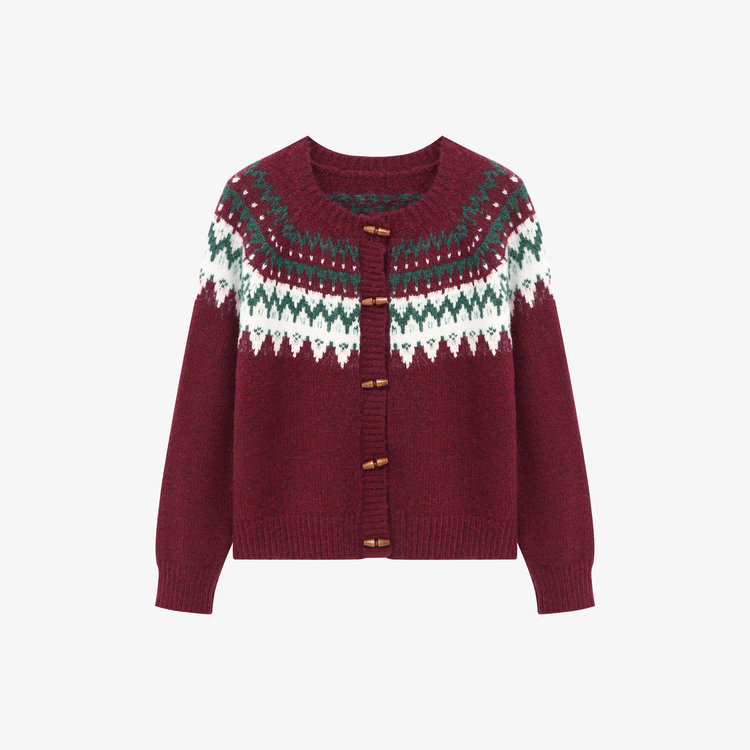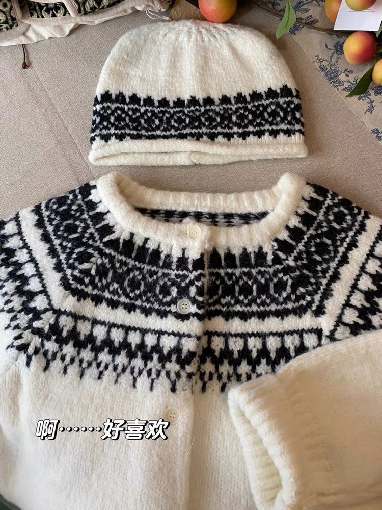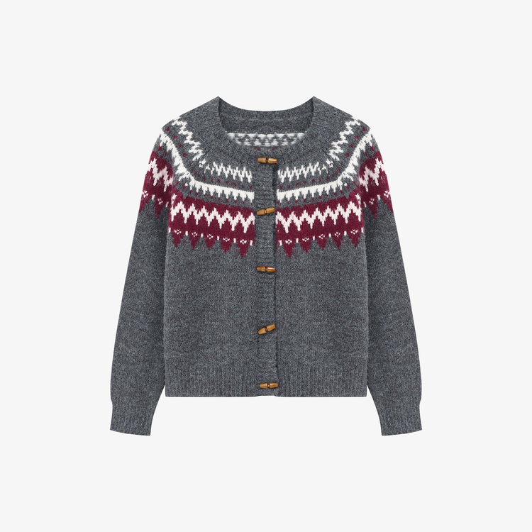 费尔岛复古提花毛衣开衫送帽子N1360:78.0%聚酯纤维 ,11.8%锦纶 ,9.4%绵羊毛 ,0.8%氨纶