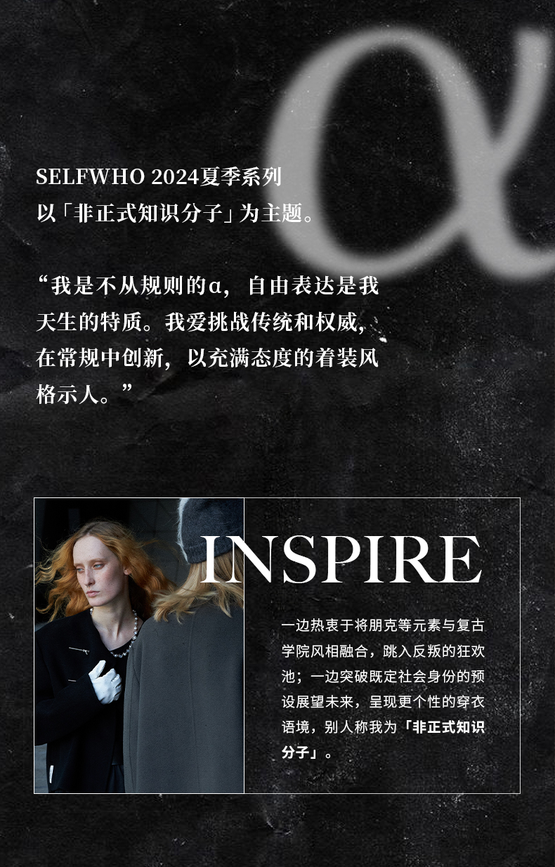 - SELFWHO——将街头文化融入高级成衣,以服装为载体,用廓形、解构设计和艺术意象探寻极致的生活方式。特立独行,知行合一,TO BE YOURSELF。