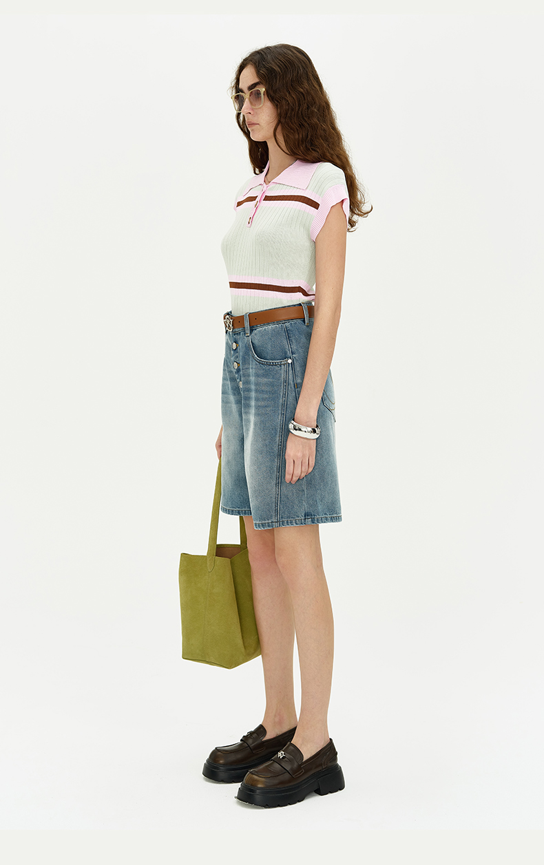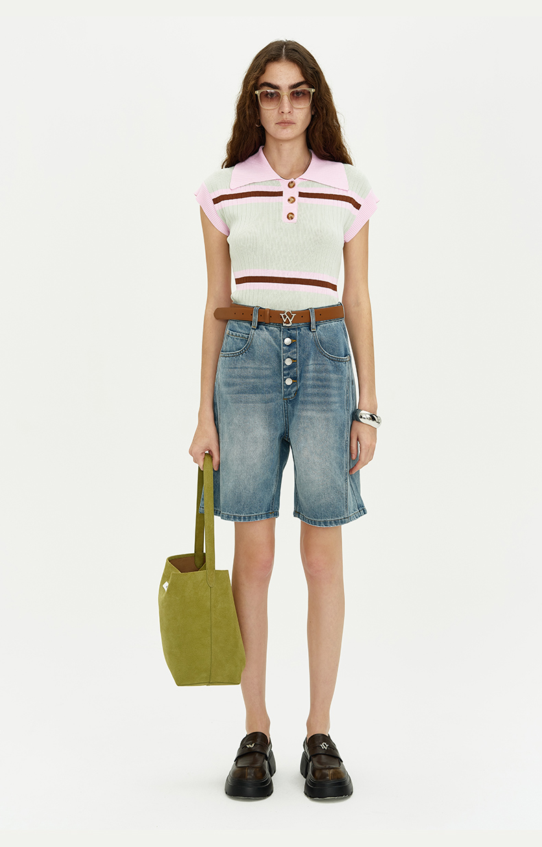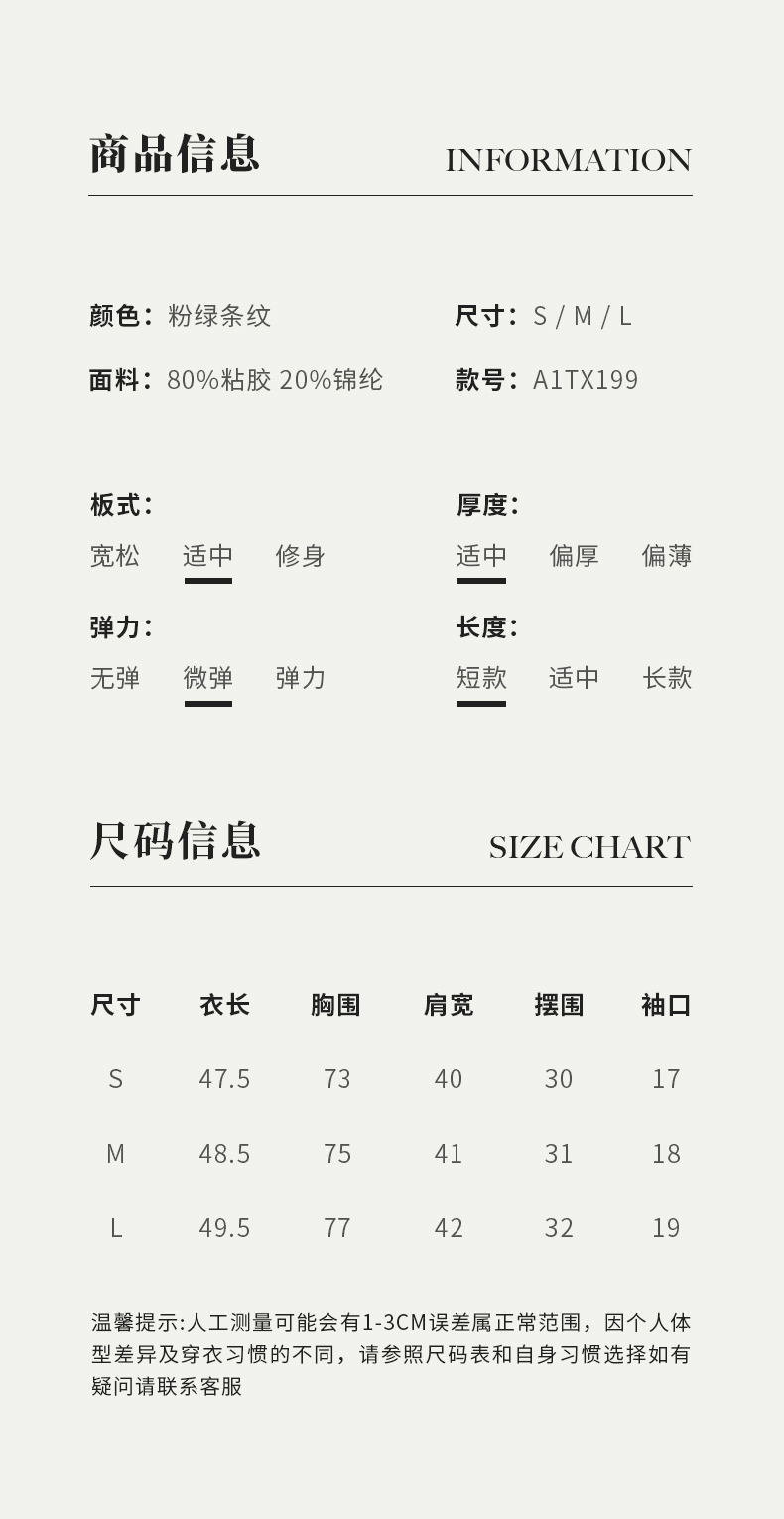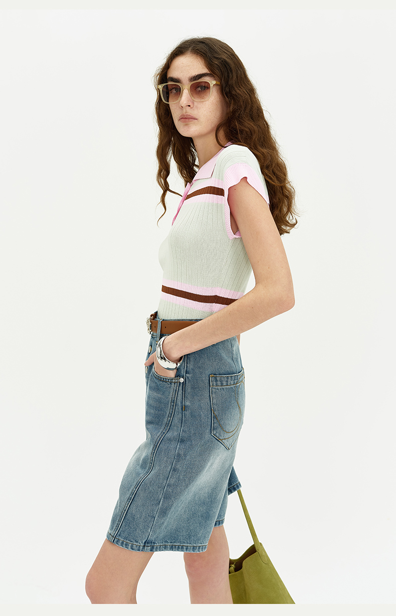 SELFWHO 粉绿条纹针织POLO衫女2024春季新款小个子设计感短袖上衣