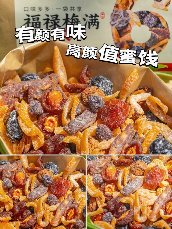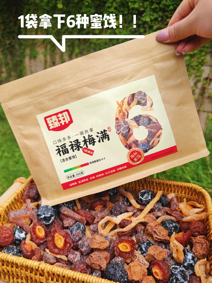 🌟1袋就是1斤,沉甸甸的蜜饯组合装 实打实的都是大颗的蜜饯 不用小杂碎充数 1袋福禄梅满包含6款美味蜜饯 纠结星人的终极之选✨ 由于原料品种和腌制工艺的不同 💯各具特色,各有千秋,款款美味 6款传统蜜饯,总能唤起记忆中的味道