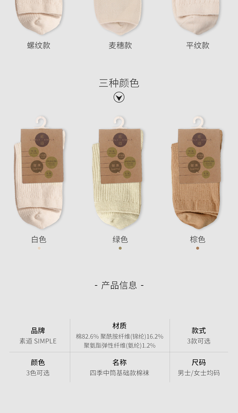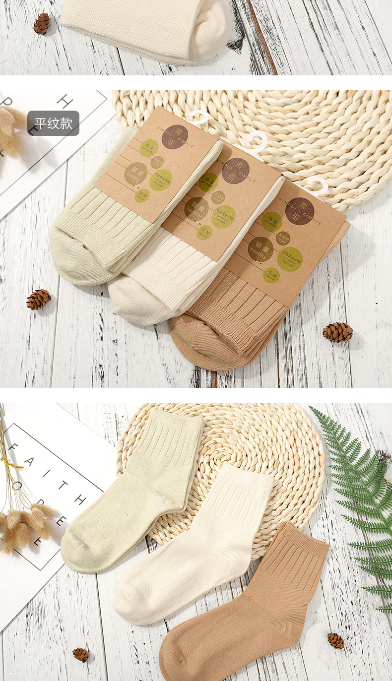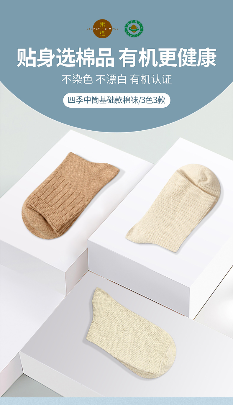 素道棉袜2-6双装 情侣经典基础袜彩棉有机种植 棉质男女中筒袜