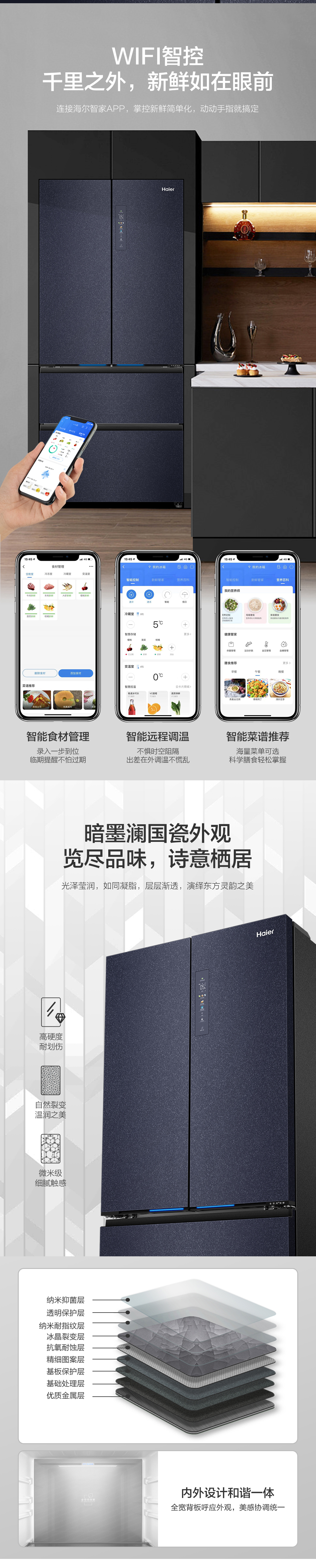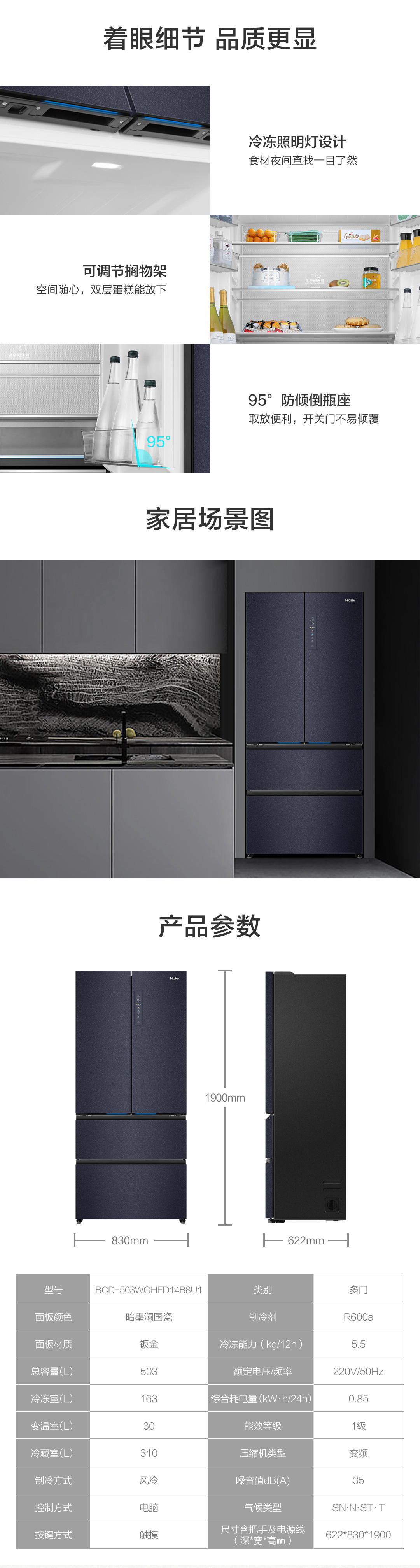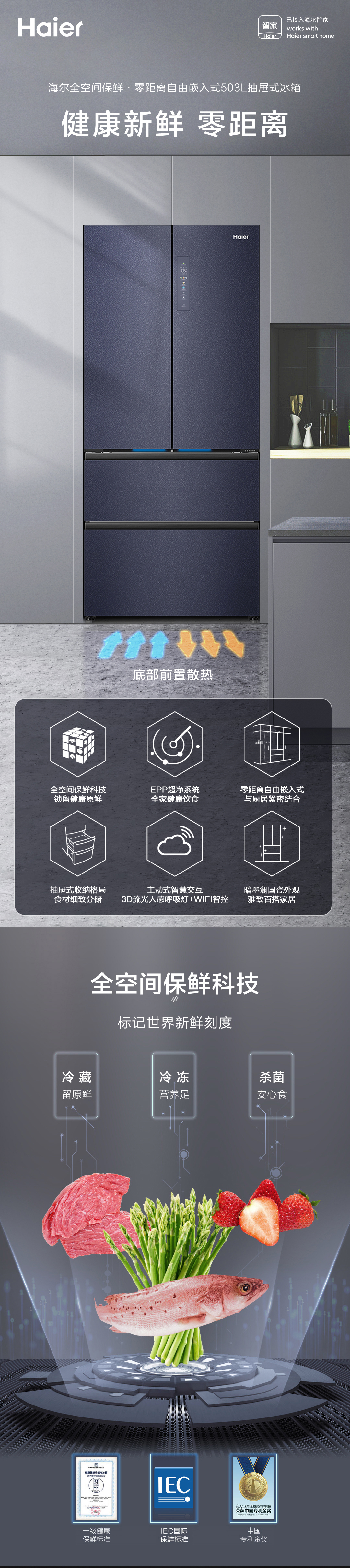 【零嵌】海尔503L法式多门家用嵌入式冰箱全空间保鲜一级风冷超薄BD-503WGHFD14B8U1