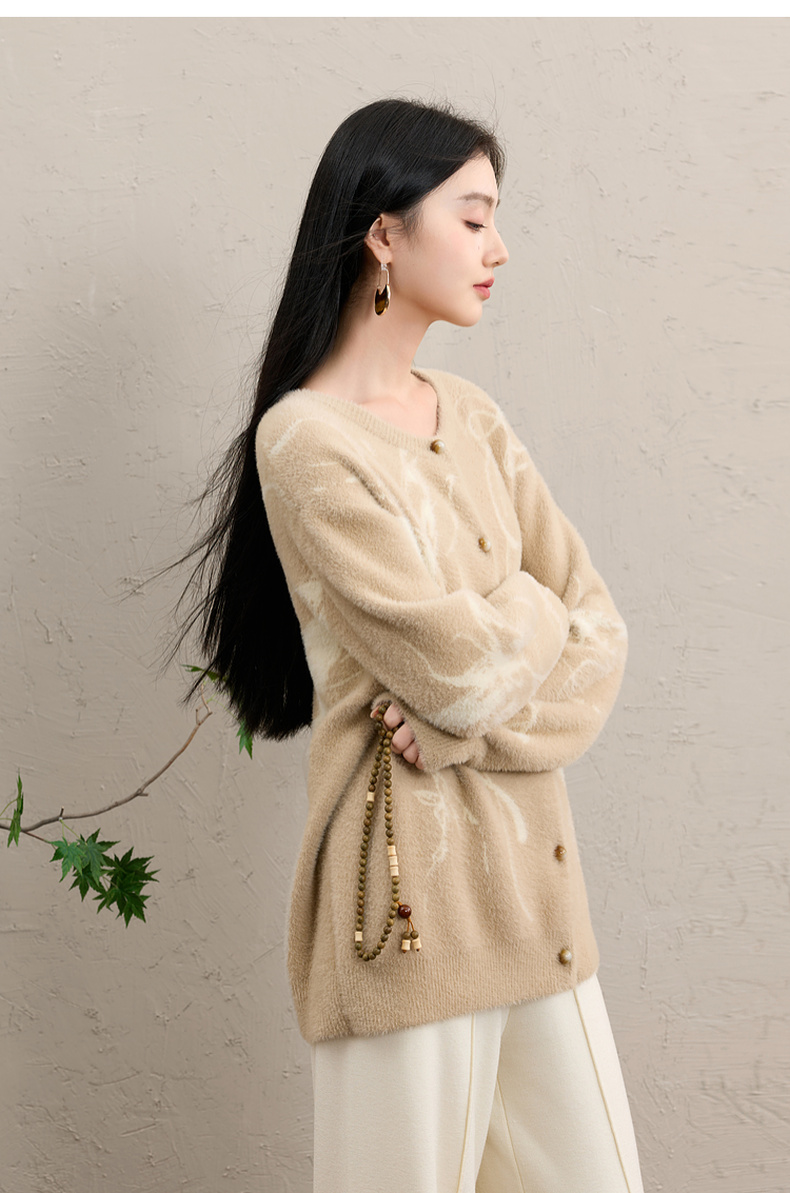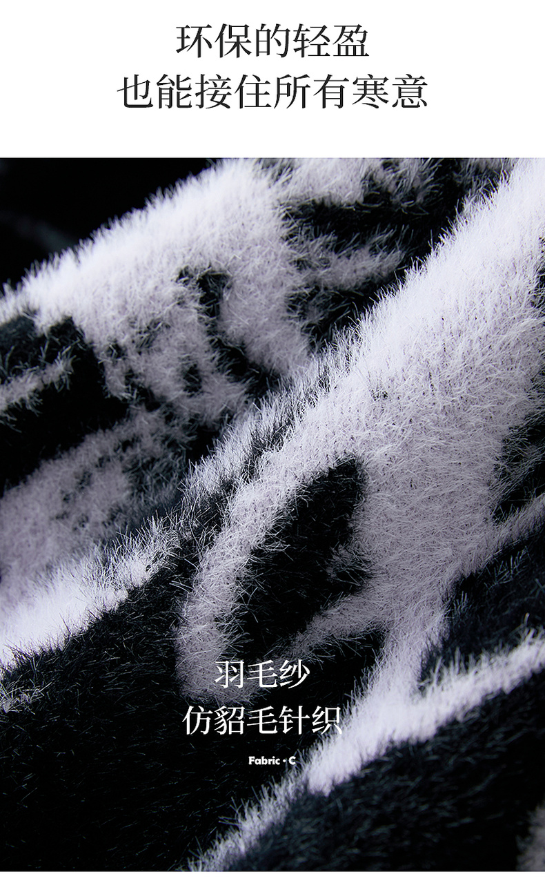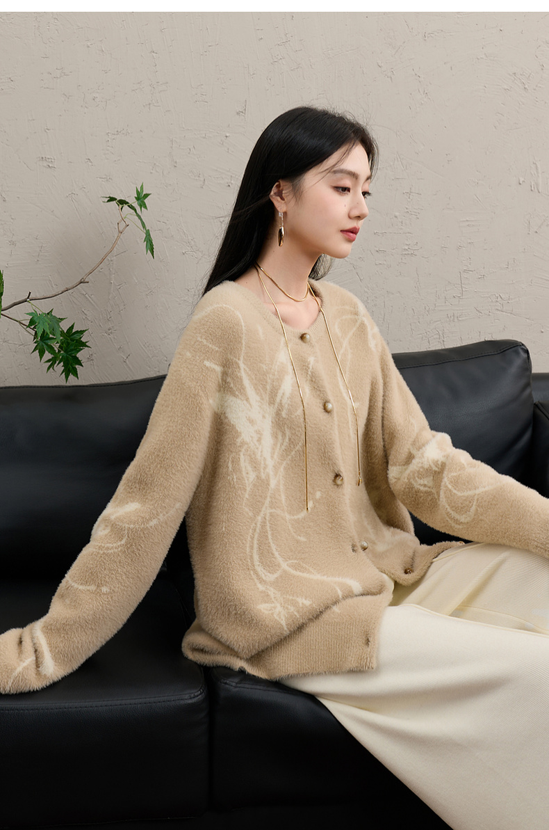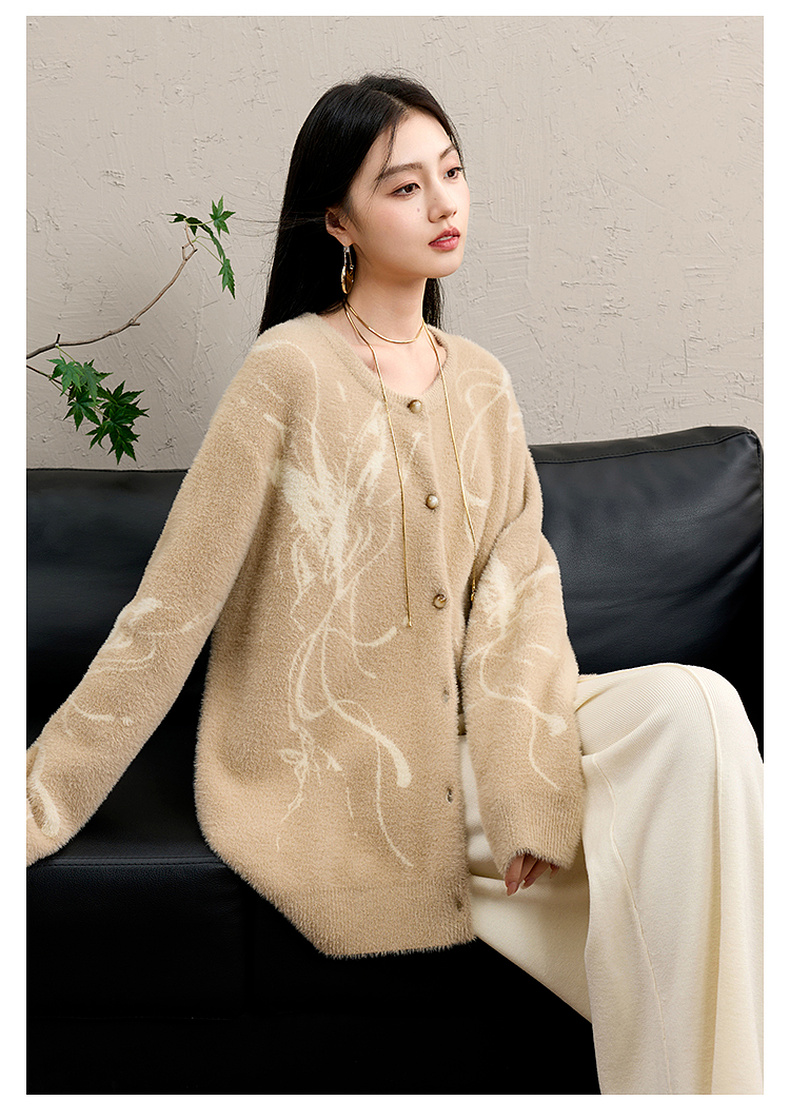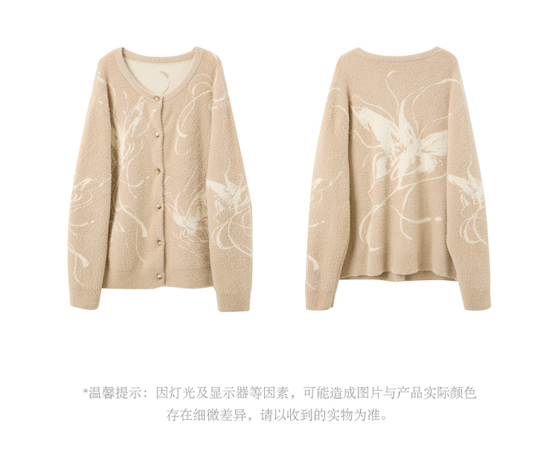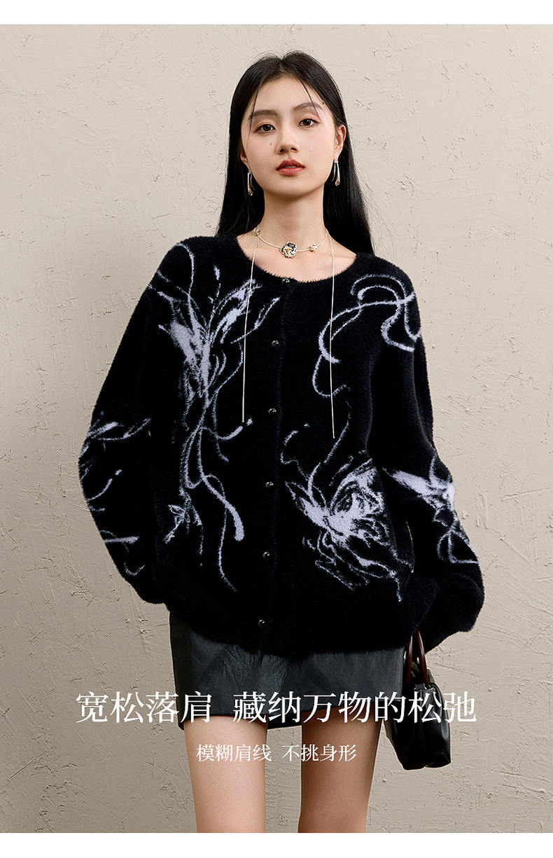 三彩【流萤飞舞】2025冬季新款仿貂毛提花针织衫圆领开衫宽松C