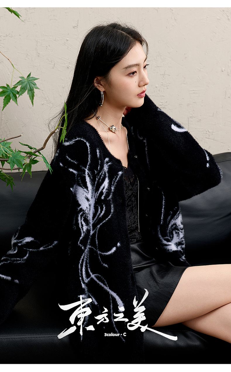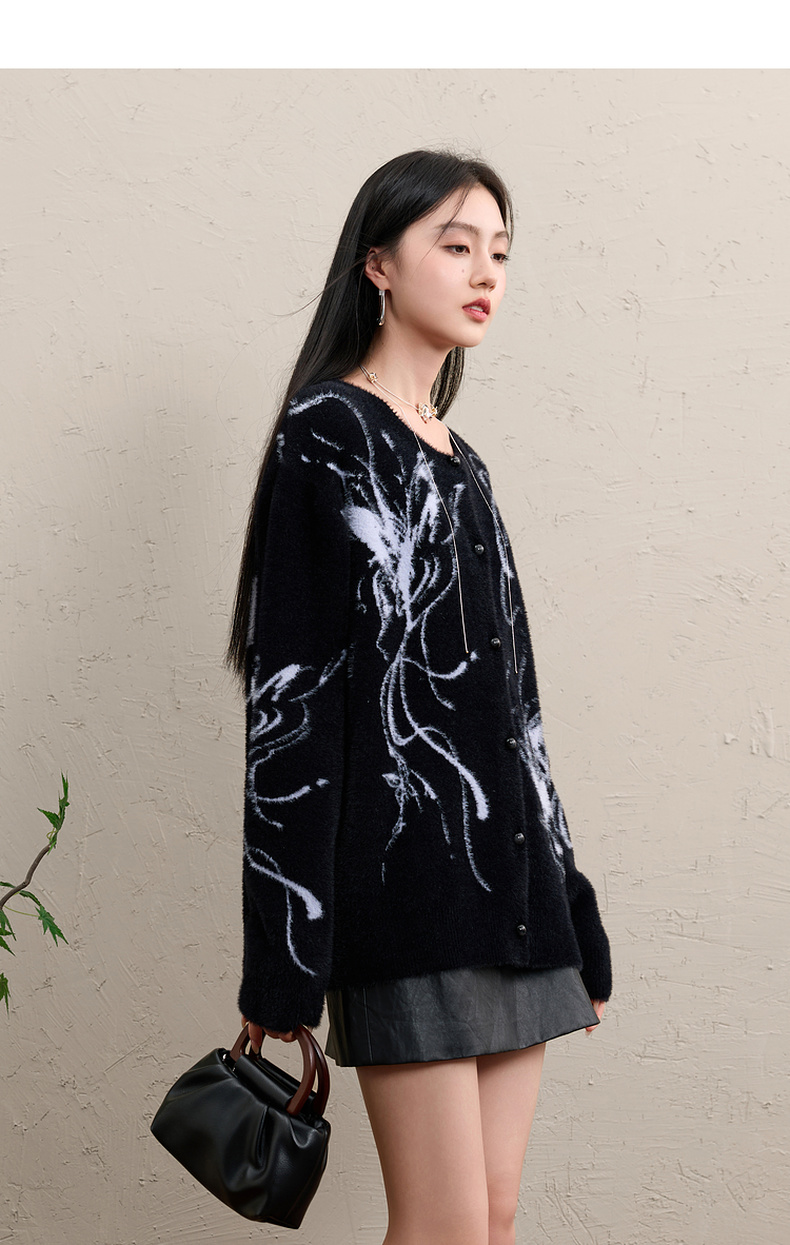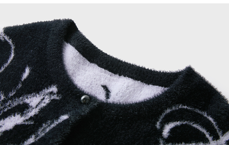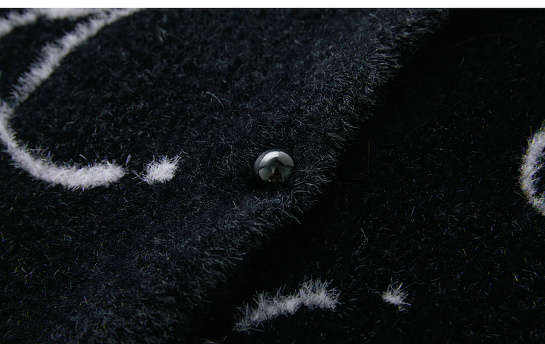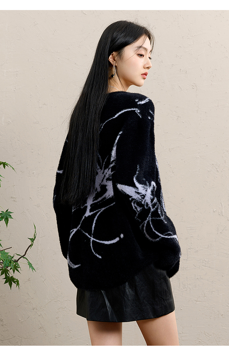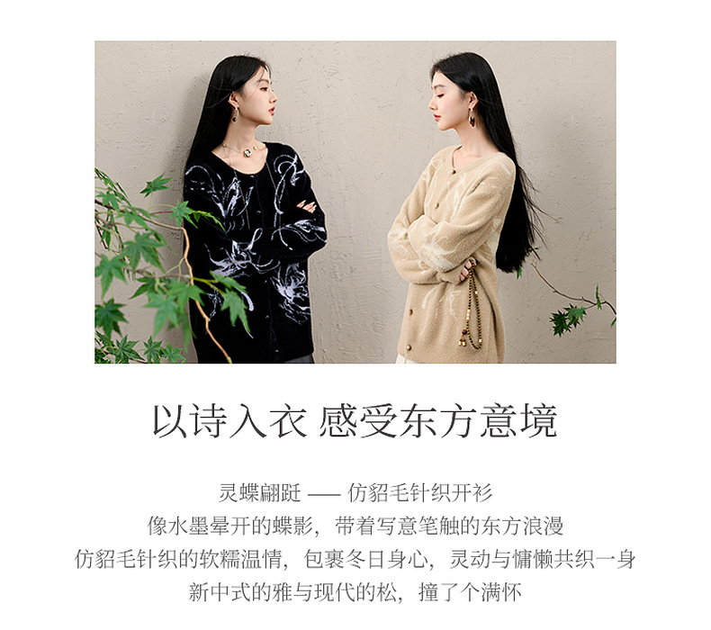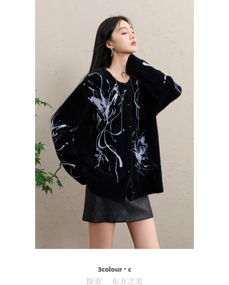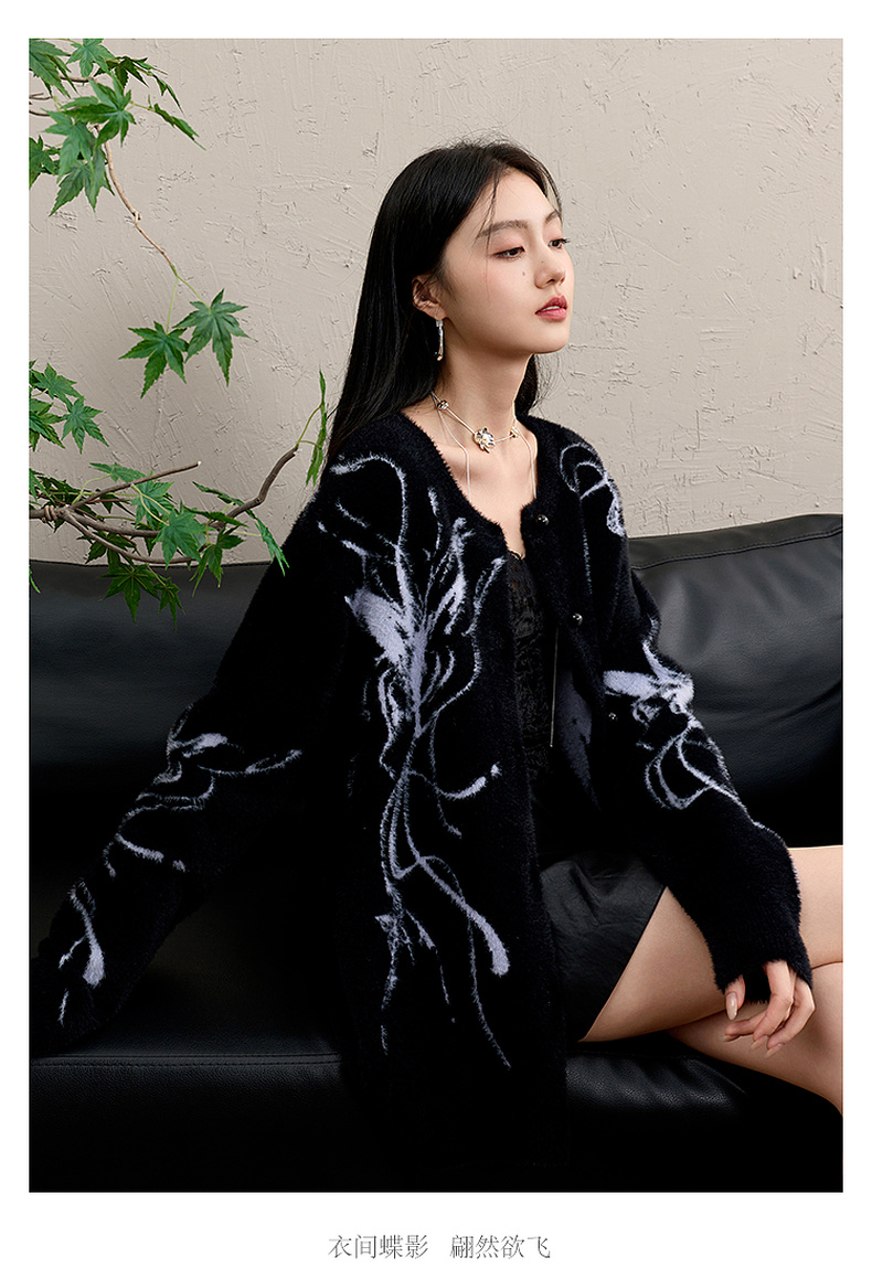 三彩【流萤飞舞】2025冬季新款仿貂毛提花针织衫圆领开衫宽松C