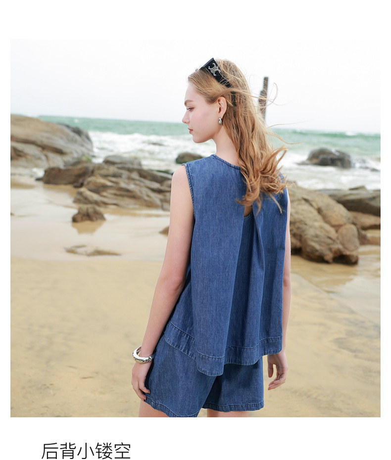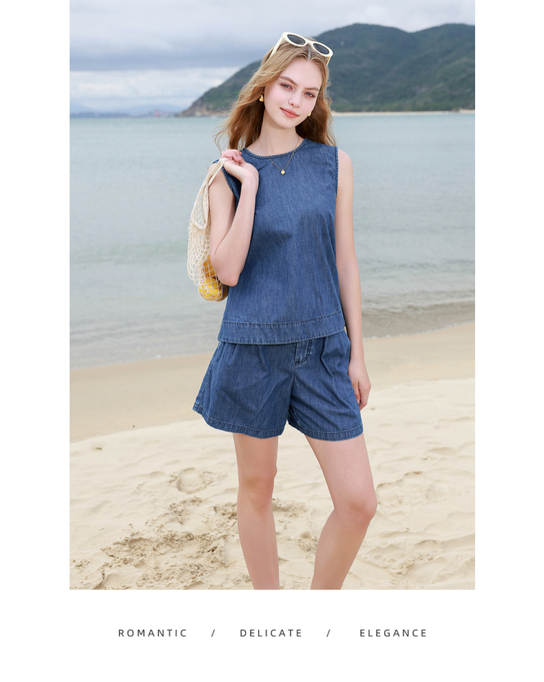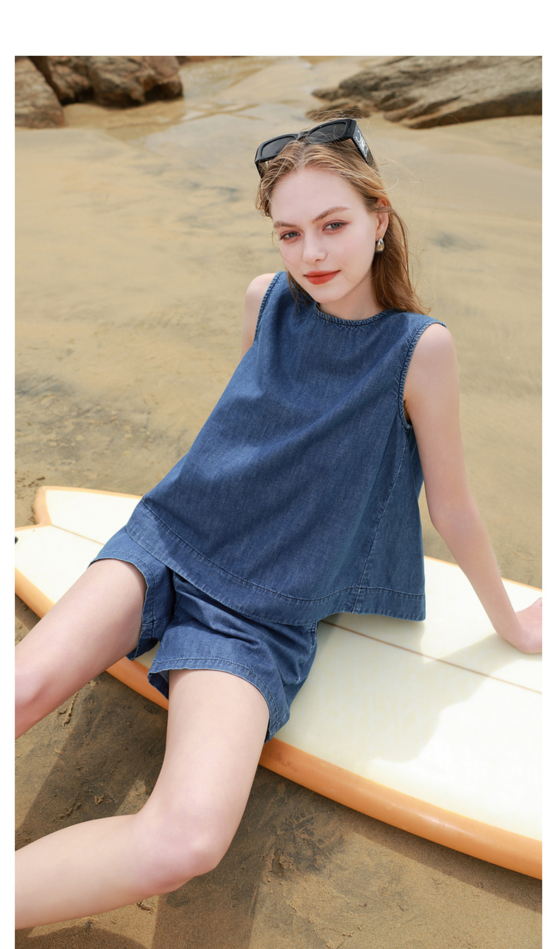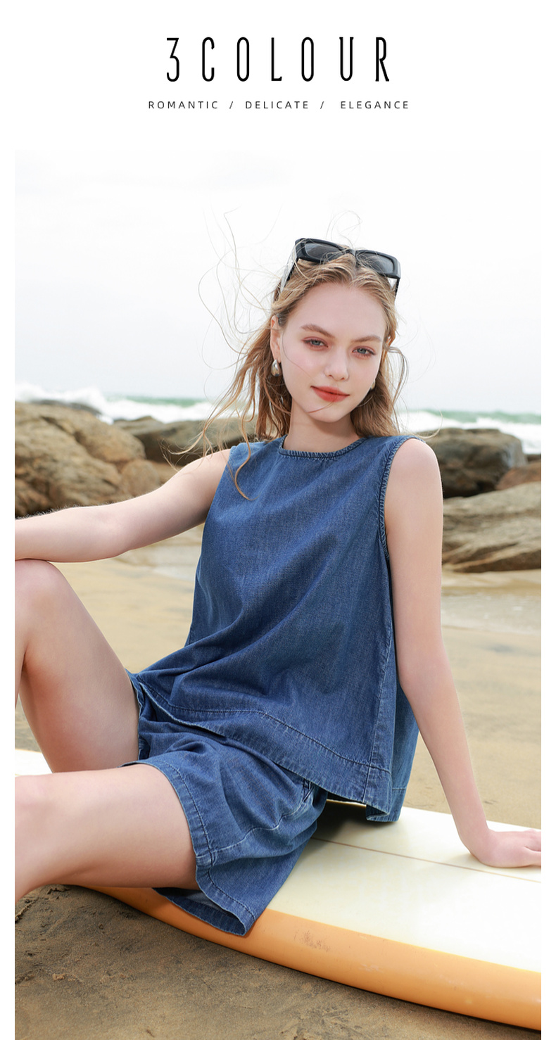 三彩2025夏季新款纯棉牛仔套装无袖上衣休闲裤两件套短裤宽松M
