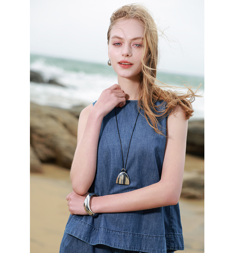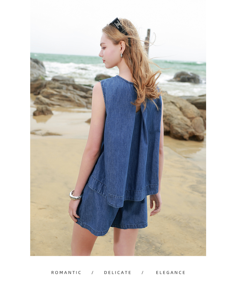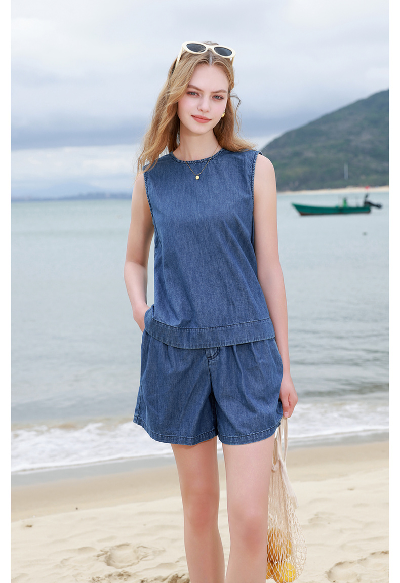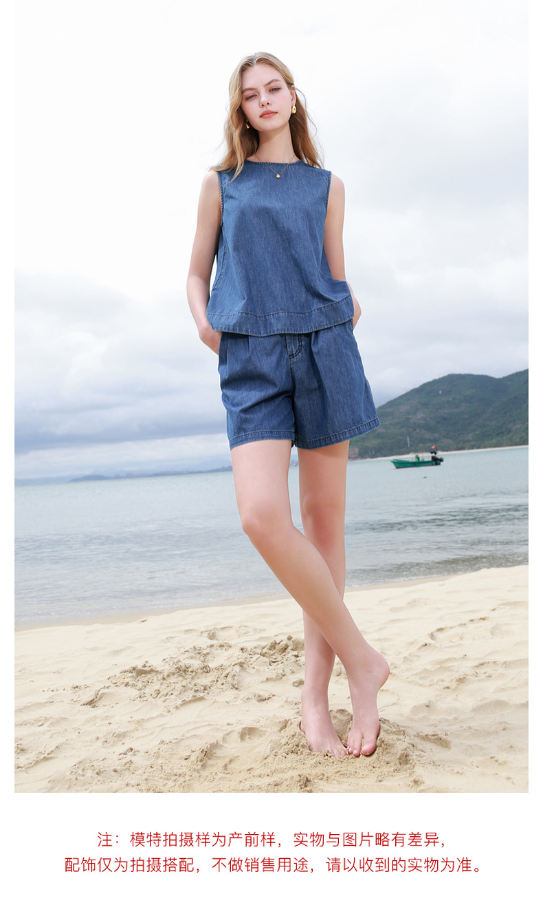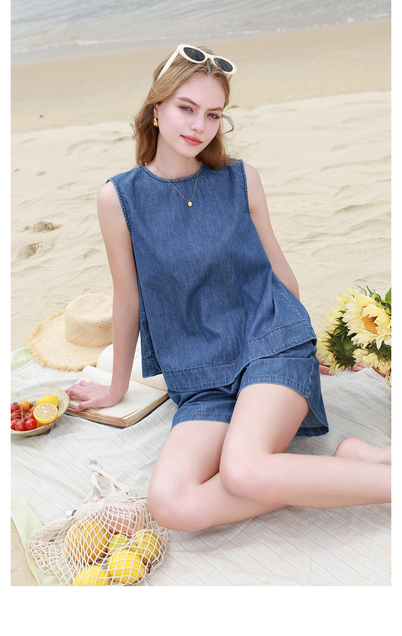 三彩2025夏季新款纯棉牛仔套装无袖上衣休闲裤两件套短裤宽松M