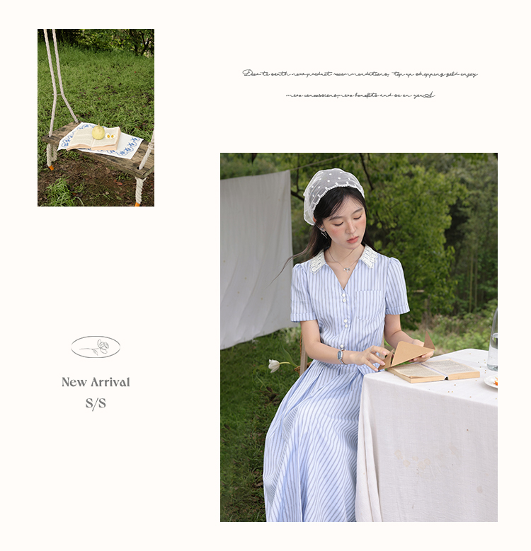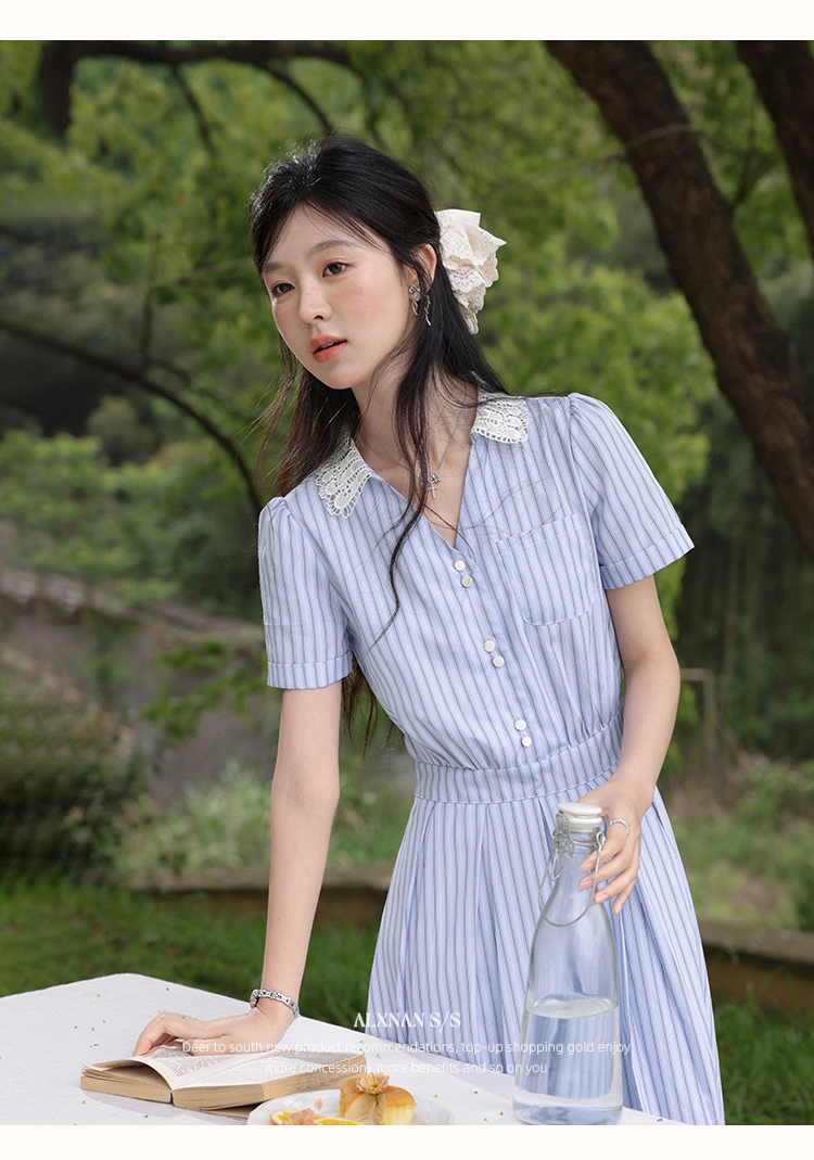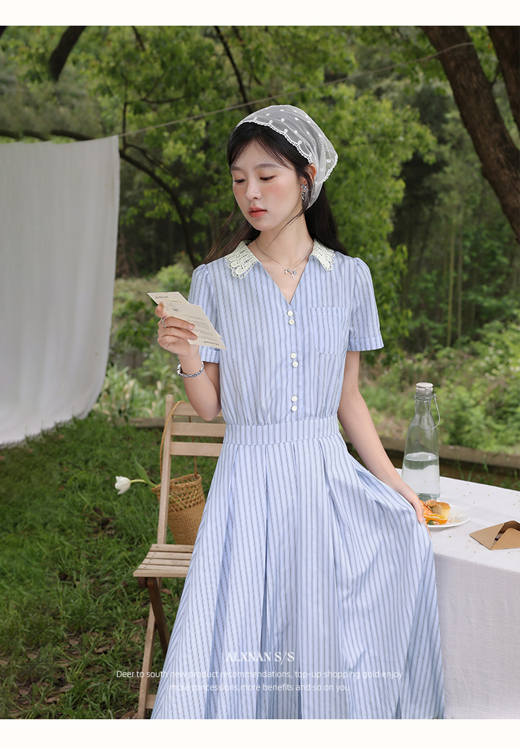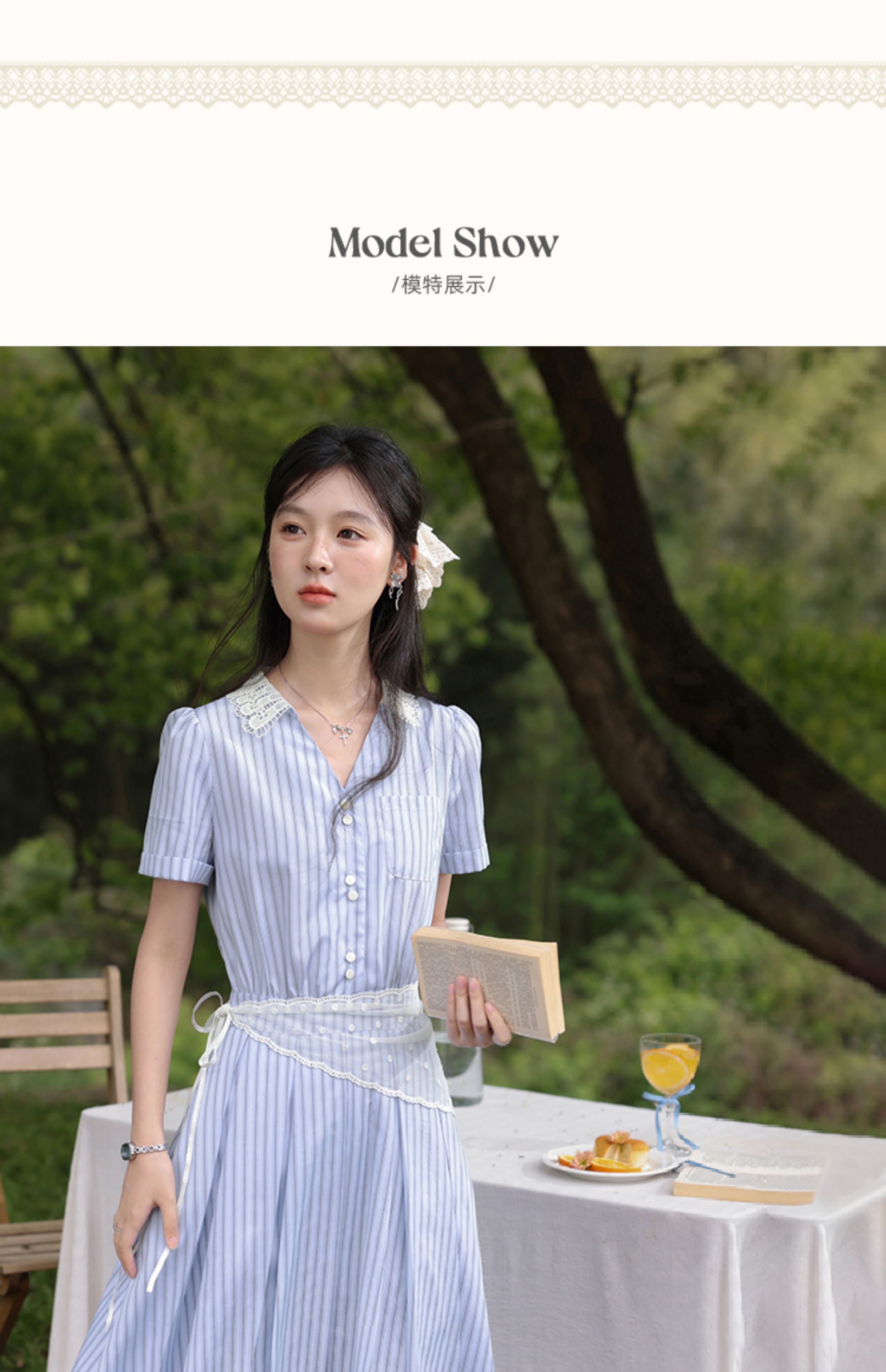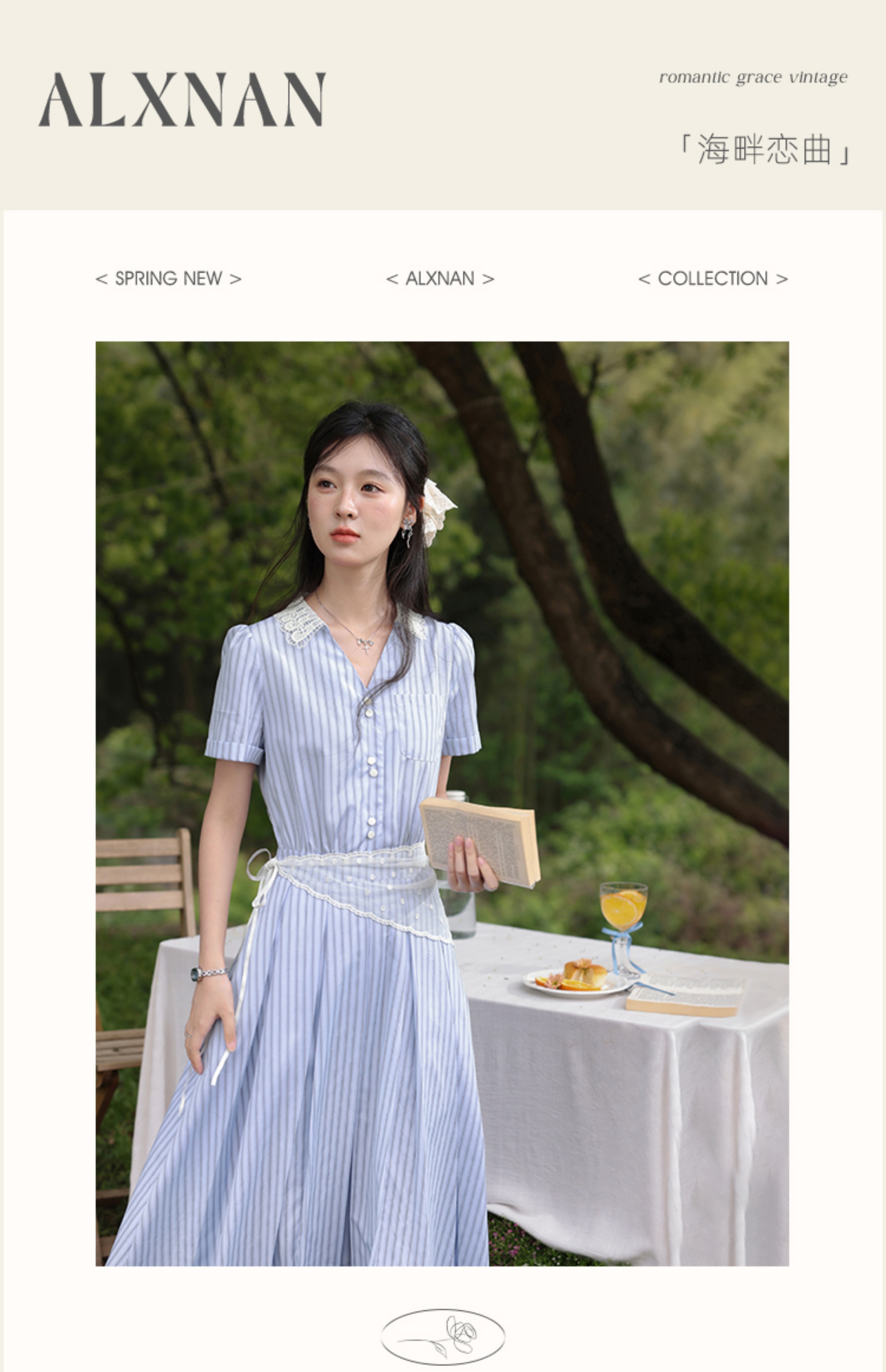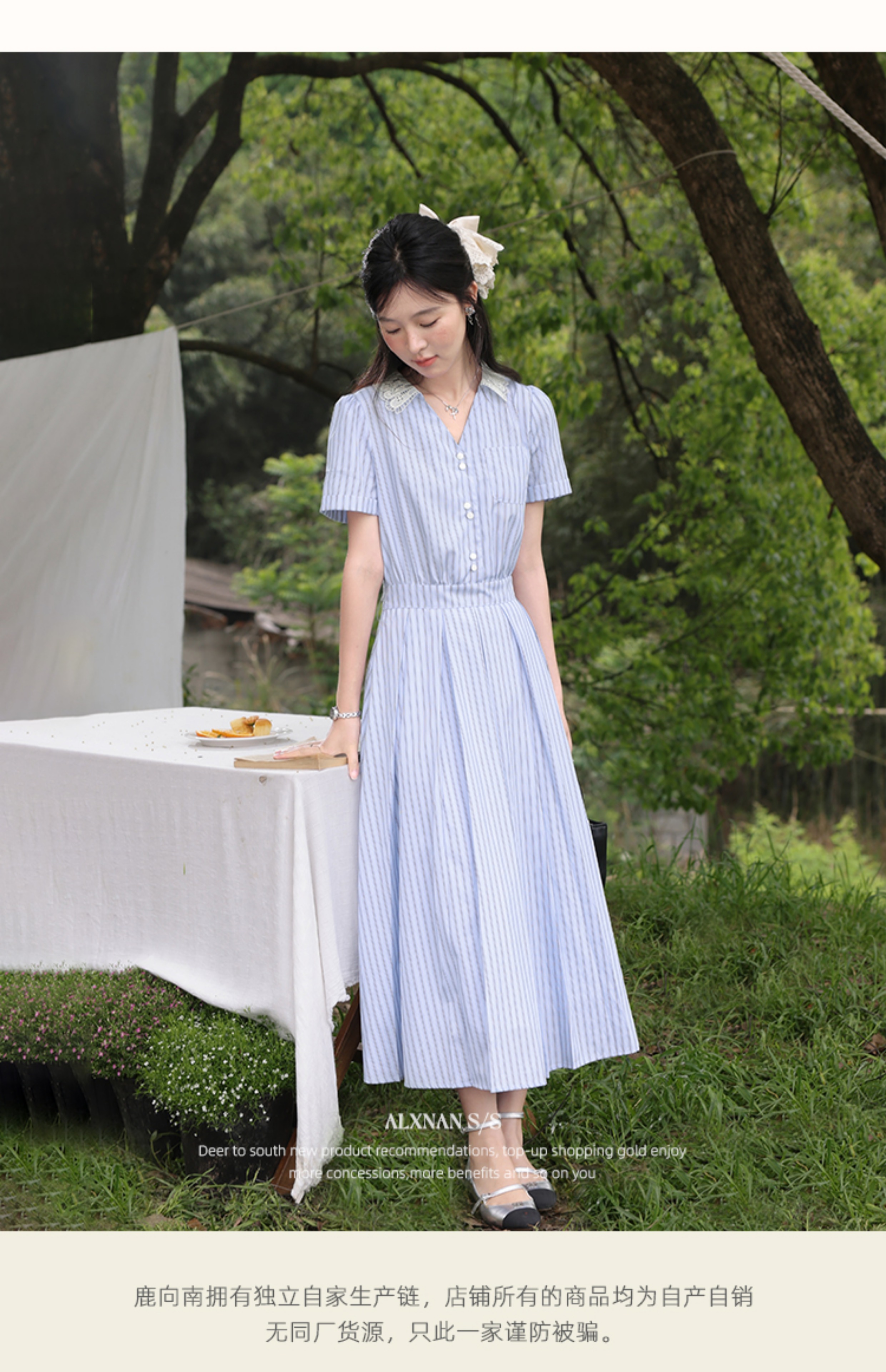 【65折秒杀】鹿向南「海畔恋曲」法式气质蓝色条纹女短袖连衣裙夏季收腰长裙子