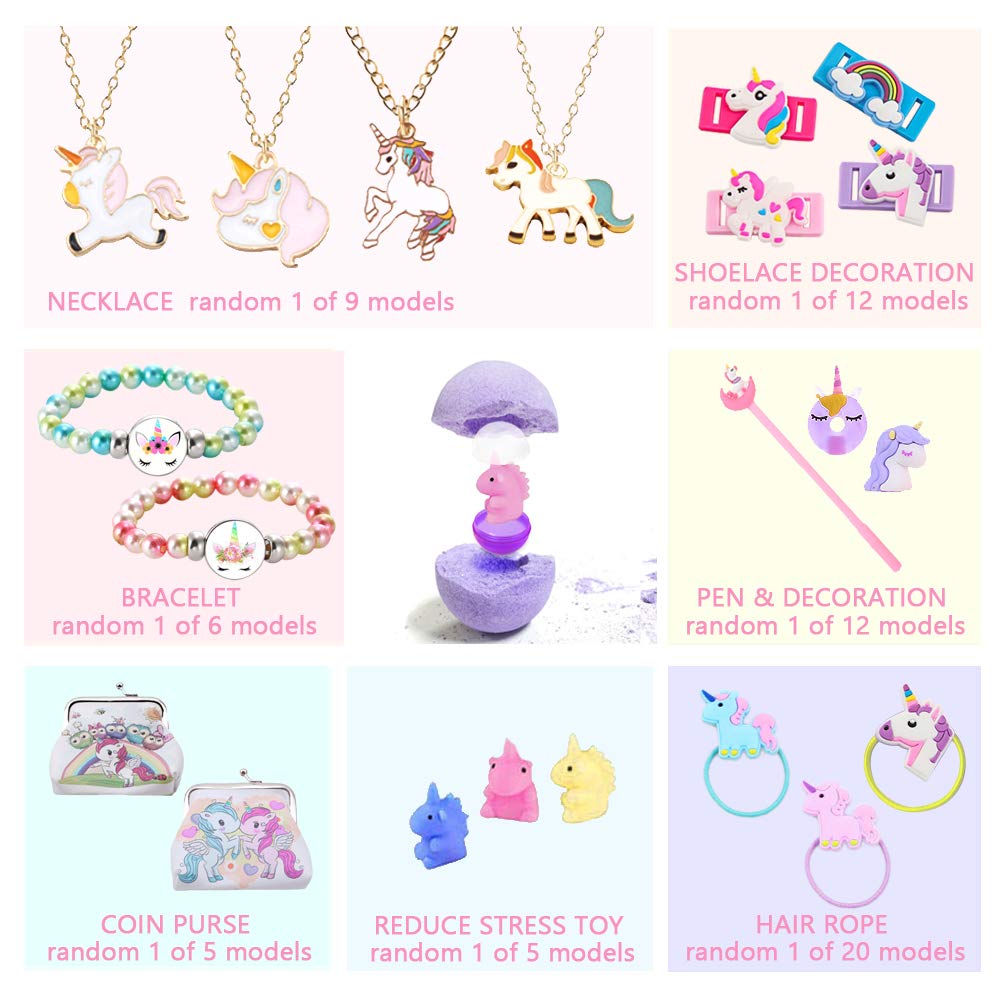 内含6个色彩缤纷的浴球,藏有独角兽礼物,可能发现独角兽项链、独角兽发绳、手链独角兽装饰、鞋带独角兽装饰、笔独角兽装饰以及减压独角兽玩具。