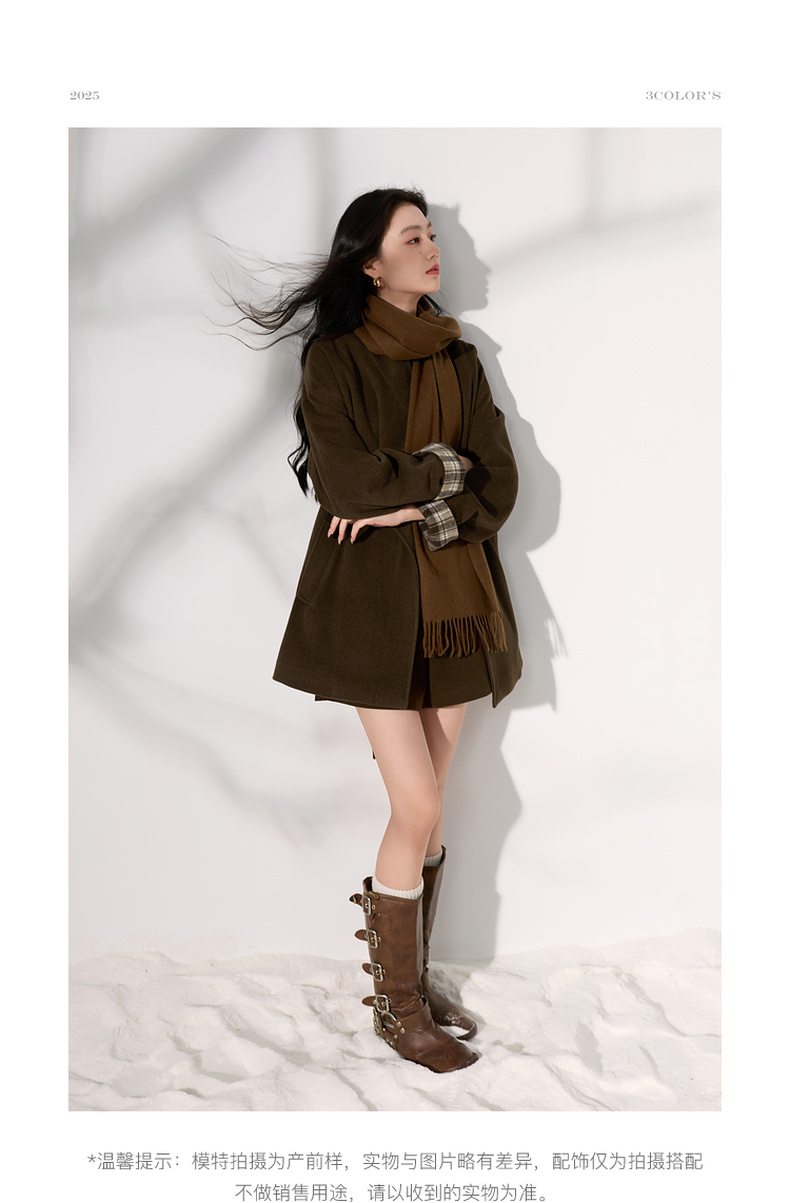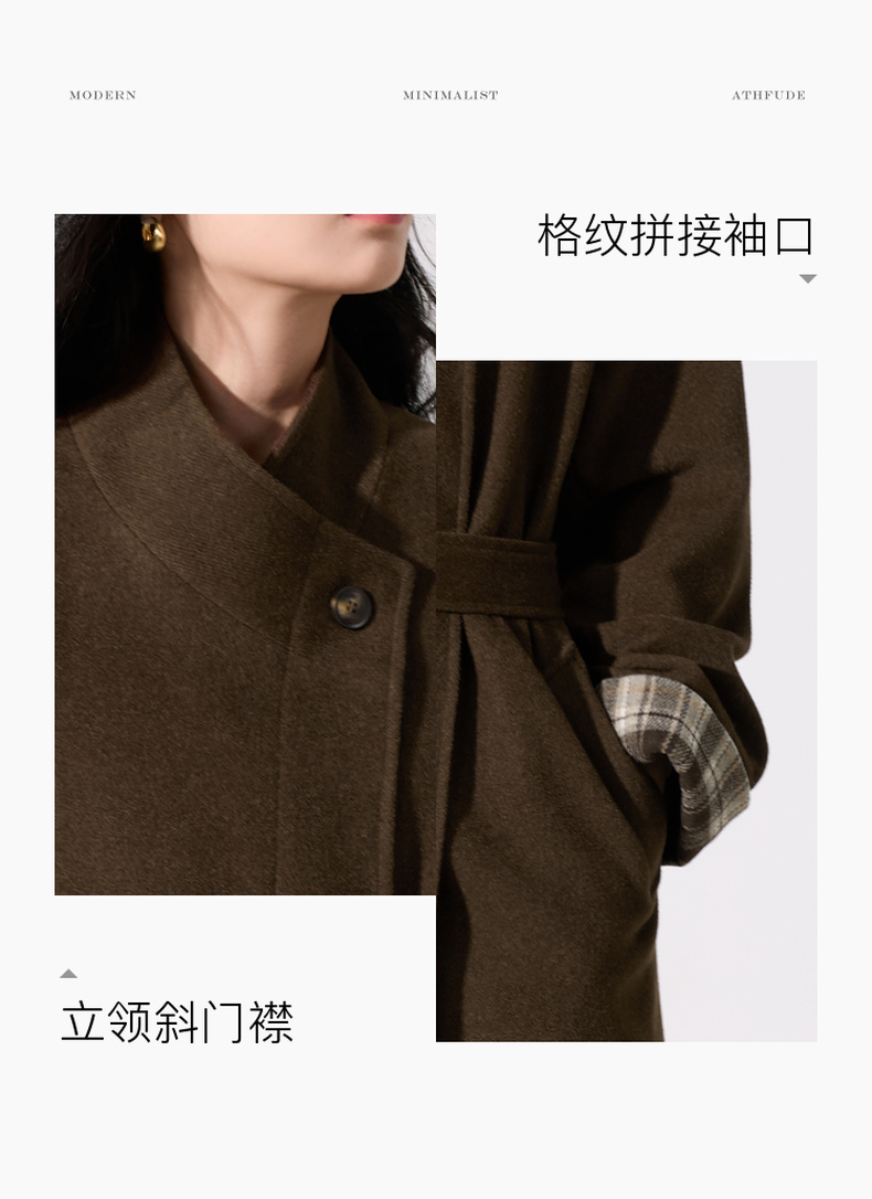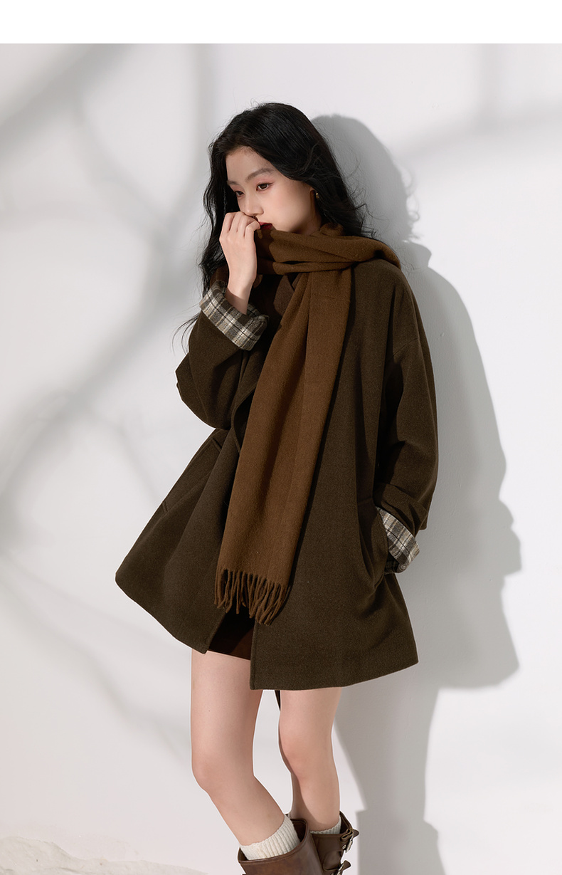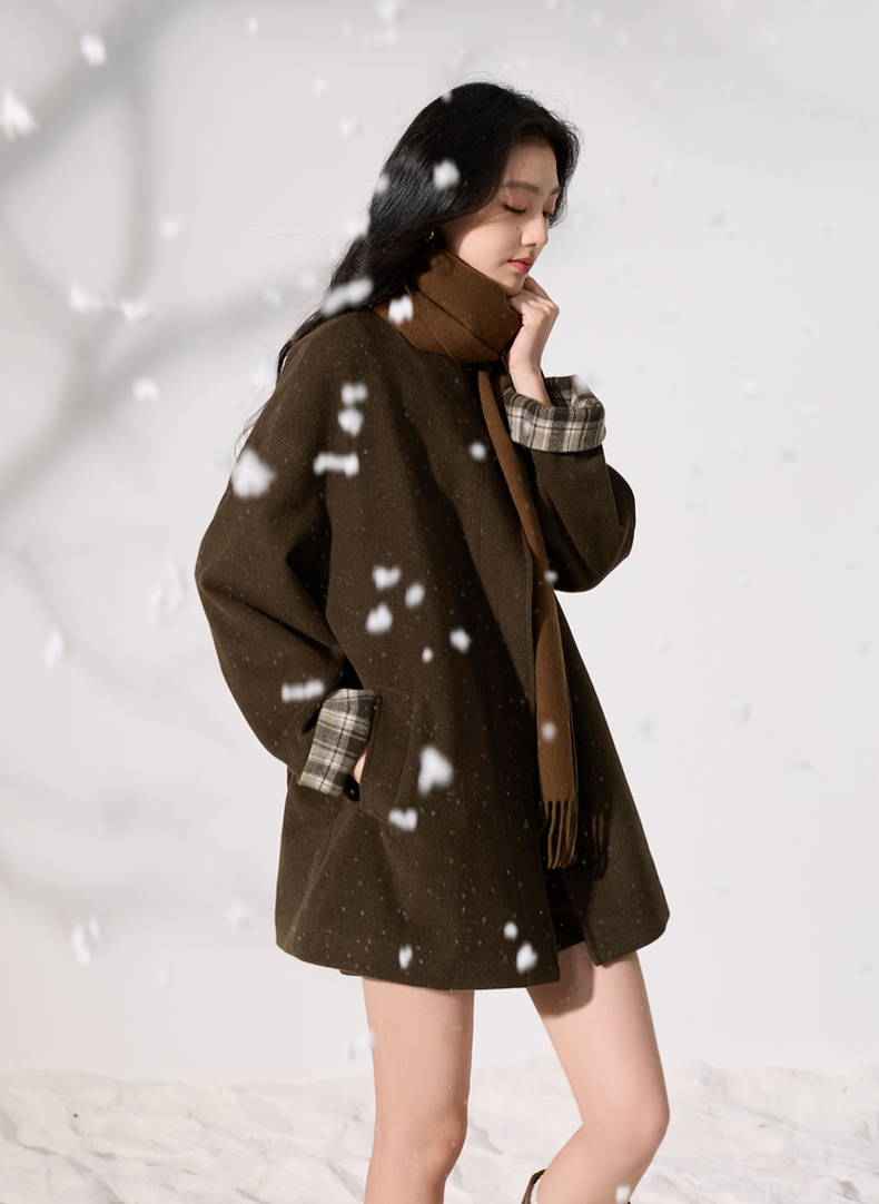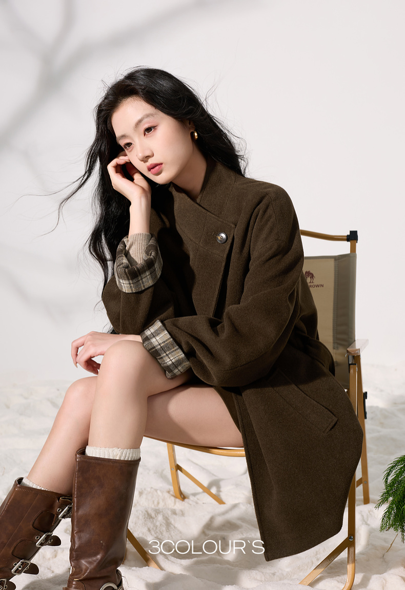 三彩2025冬季新款毛呢外套复古中长棉大衣宽松立领A型保暖夹棉S