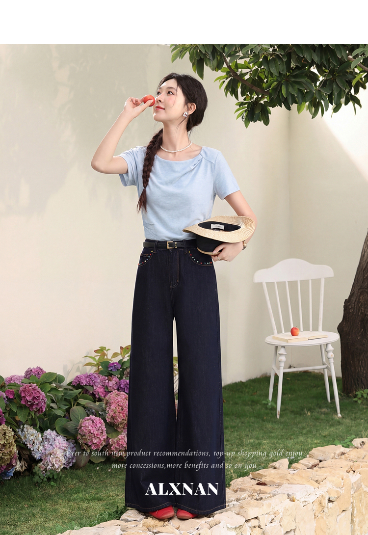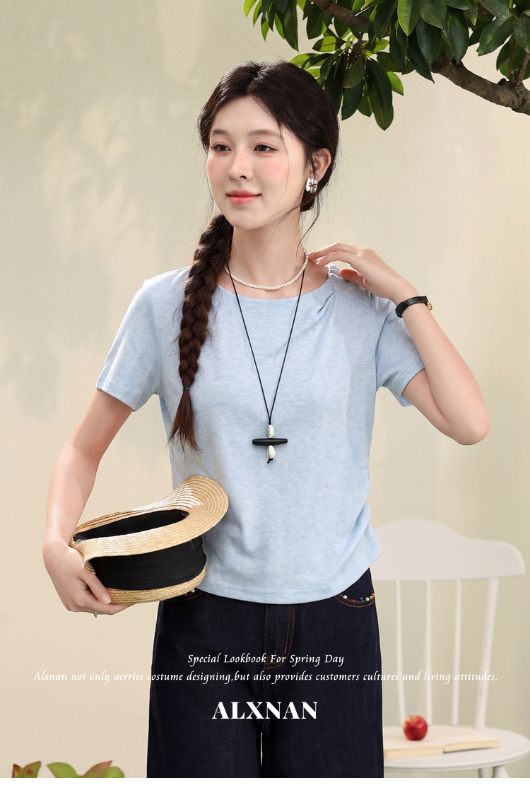 鹿向南「茶烟绕袖」蓝色法式短袖收腰T恤女夏新款设计感时尚上衣